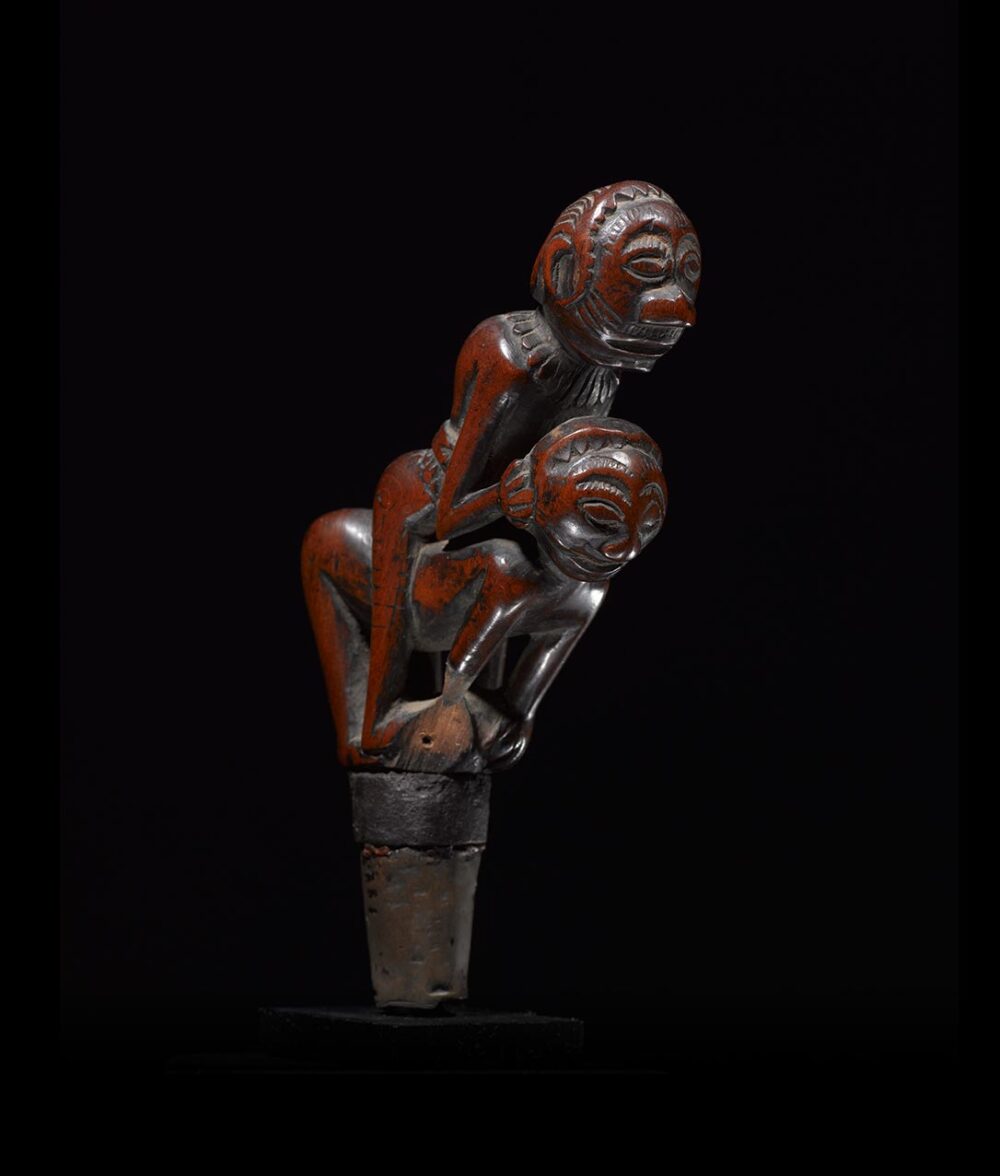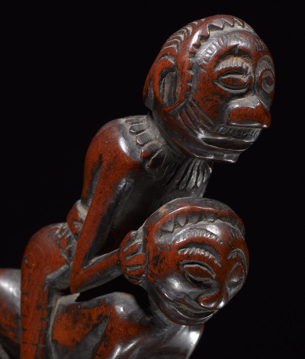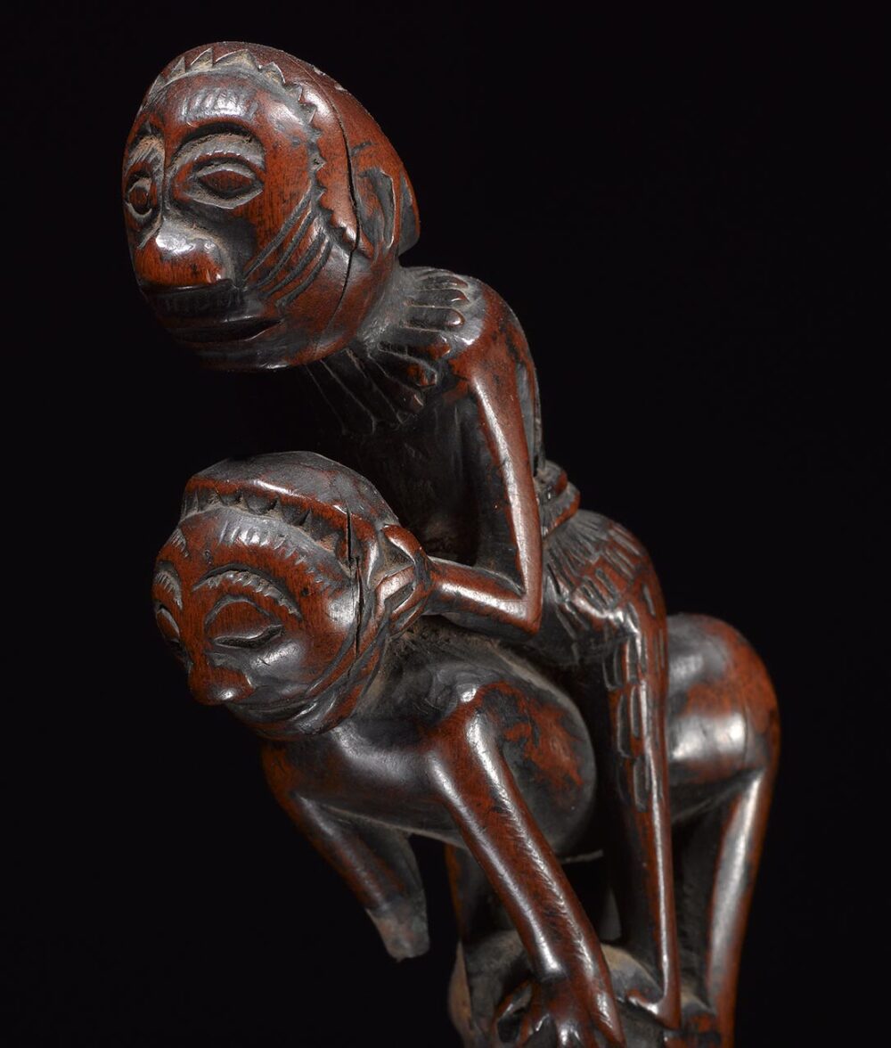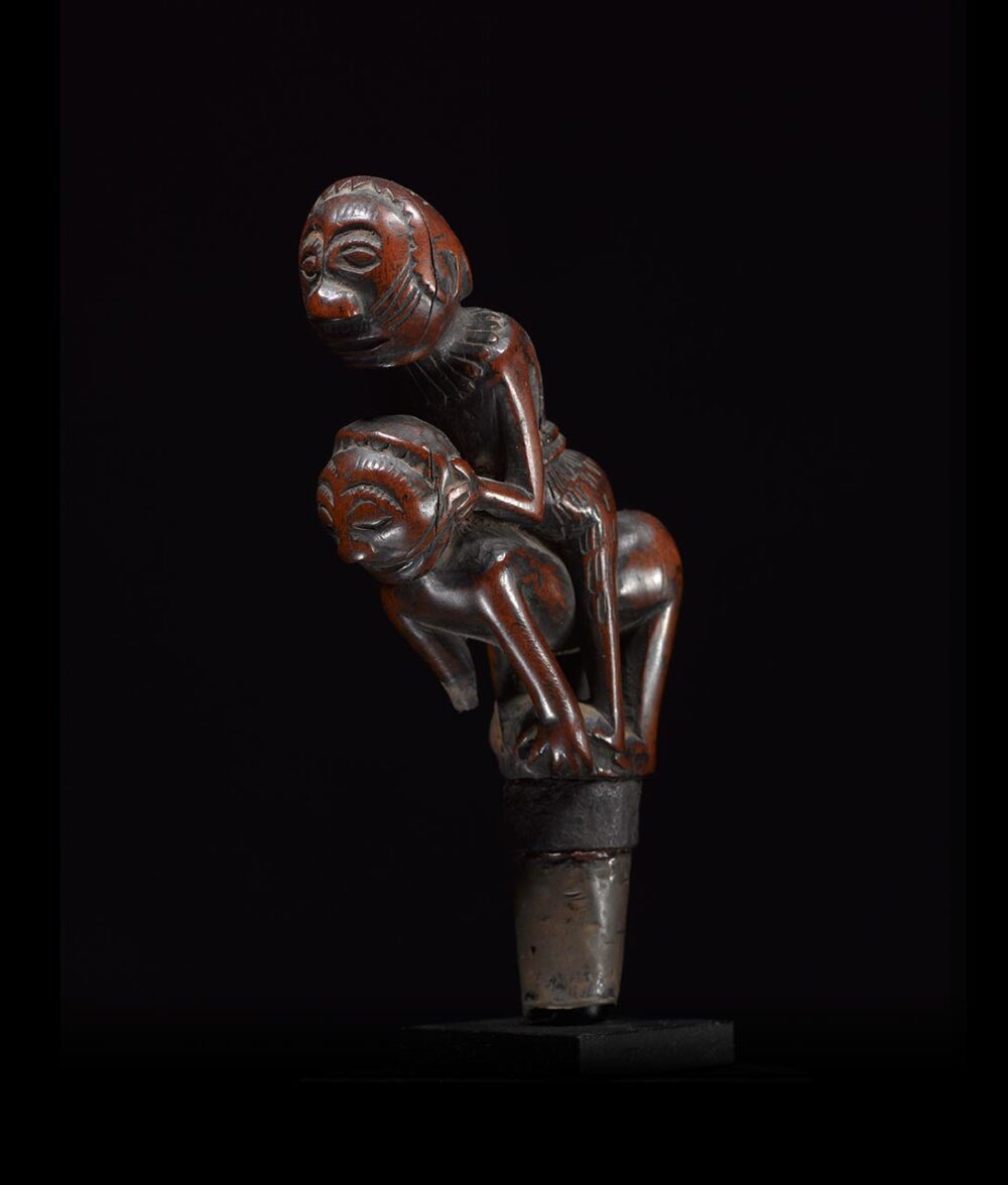 A true tour-de-force of sculpture; this wooden handle exhibits an uncanny level of detail. One figure sits atop riding another figure; both having extremely animated expressions that are carved deeply. This is a dynamic work of art rarely found among other utilitarian handles. A wonderful object with great age that exhibits the Indonesians ability to create a monumental miniature of great quality.