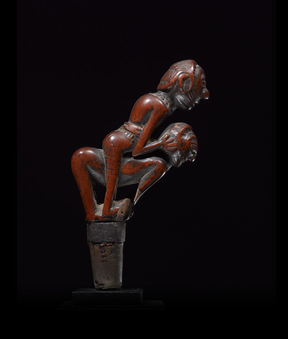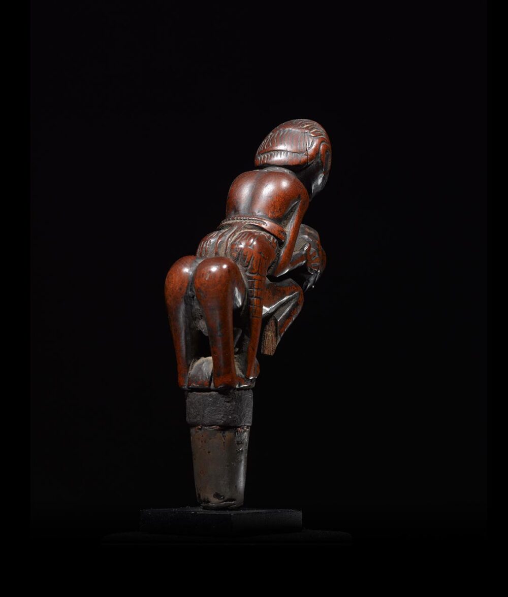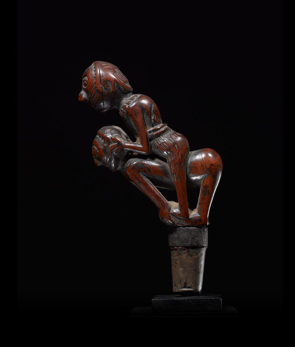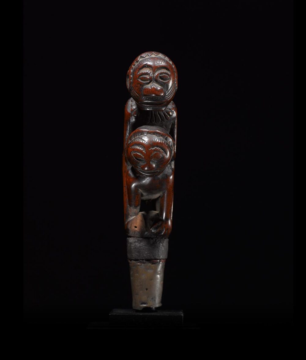 A true tour-de-force of sculpture; this wooden handle exhibits an uncanny level of detail. One figure sits atop riding another figure; both having extremely animated expressions that are carved deeply. This is a dynamic work of art rarely found among other utilitarian handles. A wonderful object with great age that exhibits the Indonesians ability to create a monumental miniature of great quality.