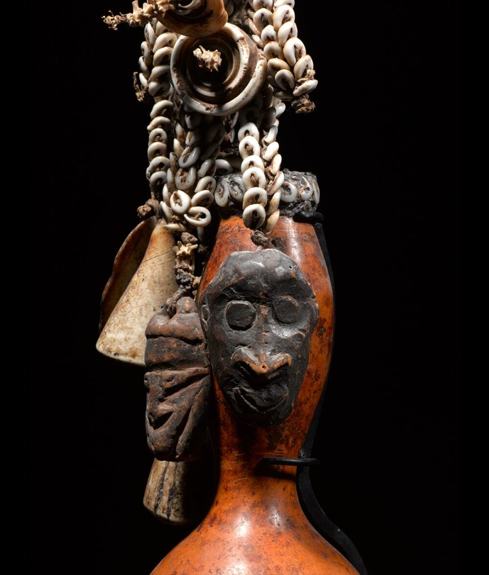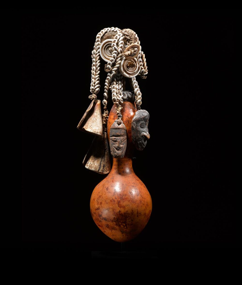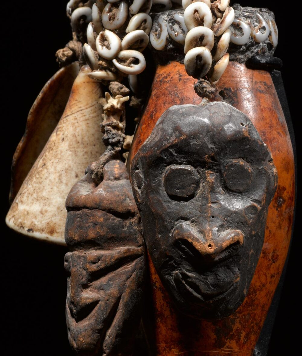 The container is made of a gourd, with small shells adhered around its opening at the top. The bone spatula is decorated with nassus and conusshells and a pair of wooden amulet masks. The bone spatula has a thin shaft surmounted by a stylized double-bird head. Its quite rare to find spatulas of this fine quality that still has all of its attachments intact.