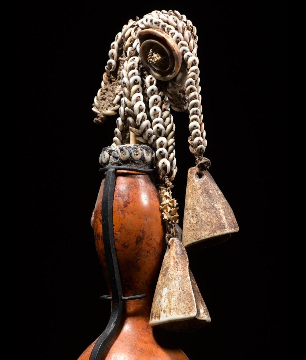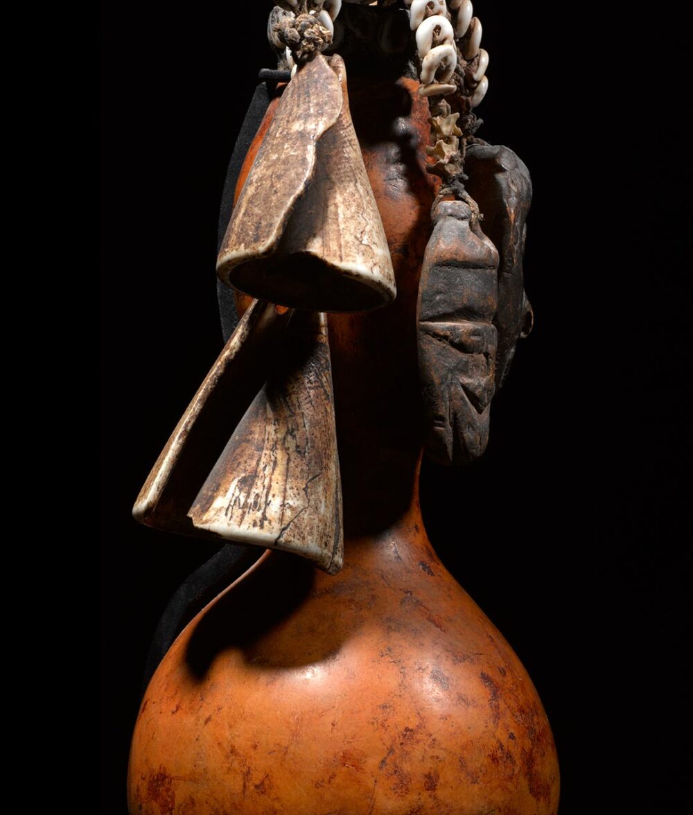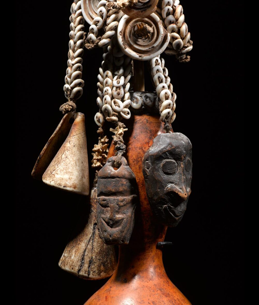 The container is made of a gourd, with small shells adhered around its opening at the top. The bone spatula is decorated with nassus and conusshells and a pair of wooden amulet masks. The bone spatula has a thin shaft surmounted by a stylized double-bird head. Its quite rare to find spatulas of this fine quality that still has all of its attachments intact.