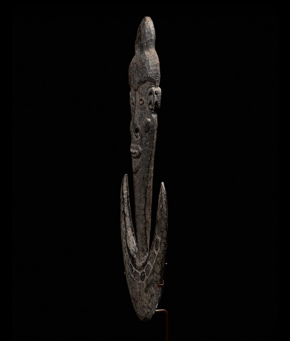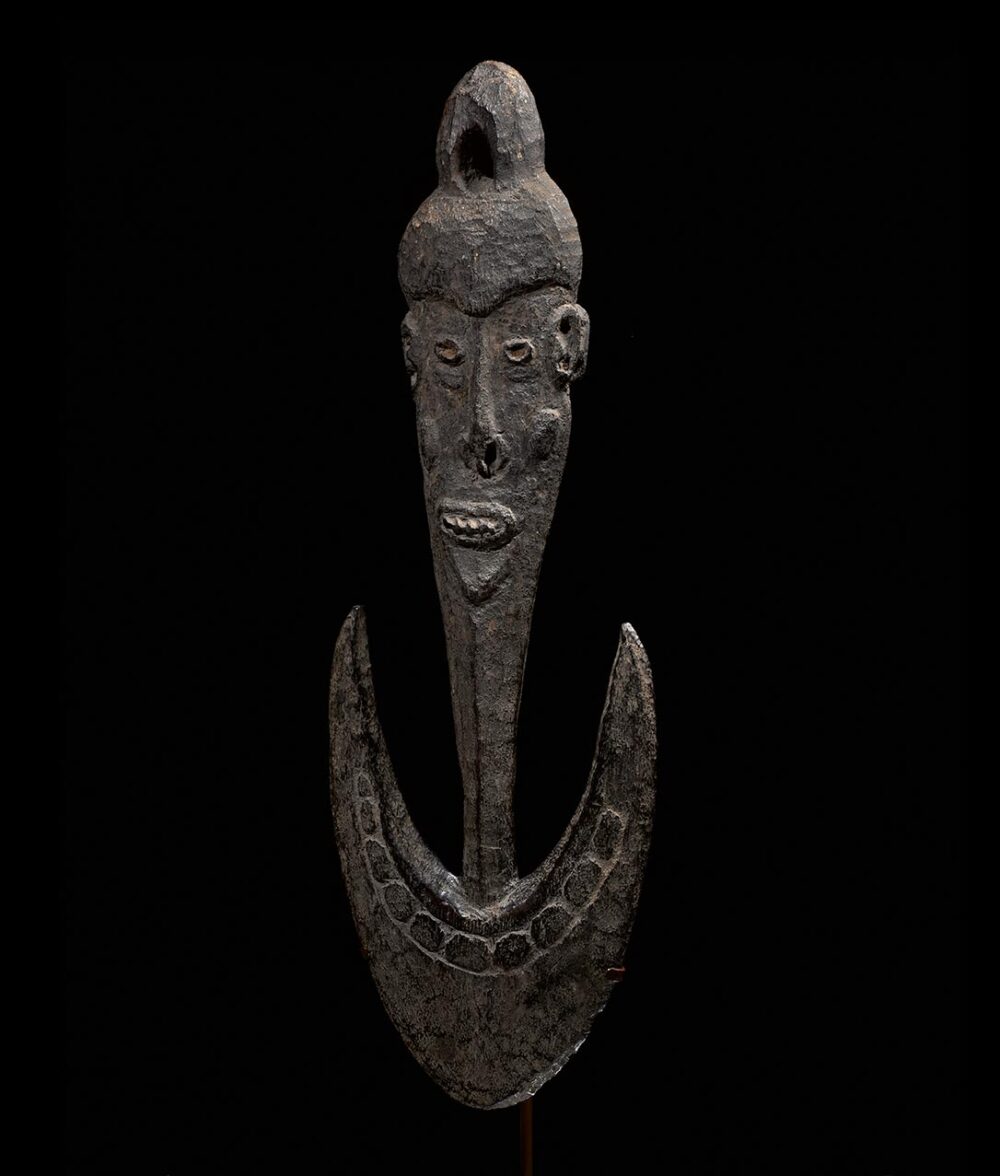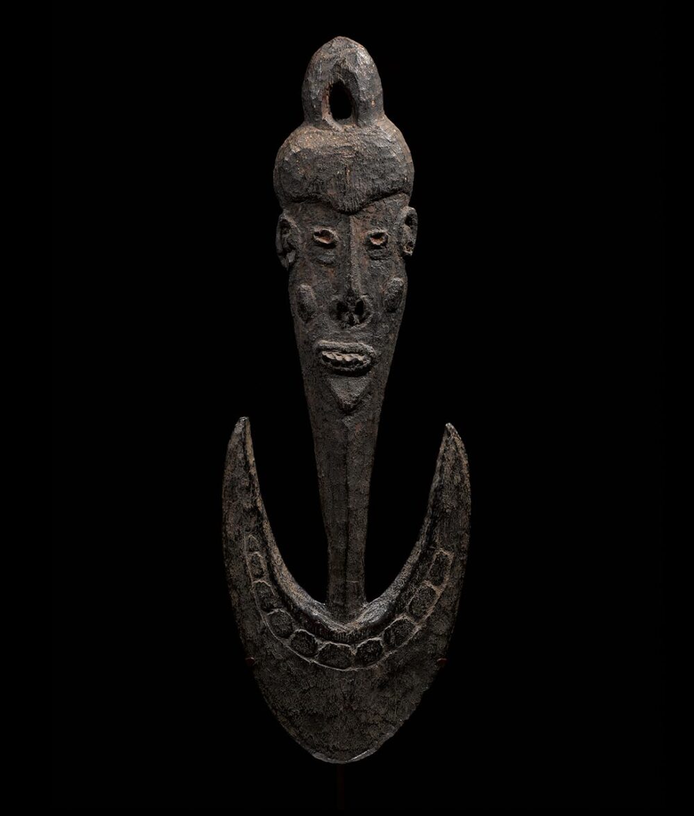 This striking piece is a Janus, or two-faced suspension hook. Each side, representing ancestors