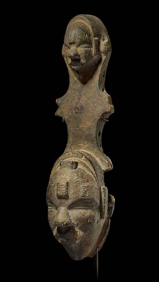 Elu masks are attached to cone-shaped caps made of fiber and cloth, covering the heads of the dancers. Once worn by a young man in the Ogoni men’s secret society known as Ekpo, this mask would have been used in annual festivals or at the funerals of Ekpo society members, often juxtaposed with masquerades representing beautiful and beneficent forces. This particular mask is a very fine and unusual double-faced example. It exhibits great age and use, with a deeply patinated and encrusted surface from prolonged use and storage. We’ve also reproduced an old black and white photograph of the mask provided by Barry Hecht. The photograph was taken in the 1970’s by an unknown photographer.