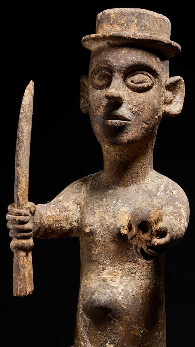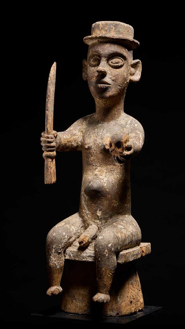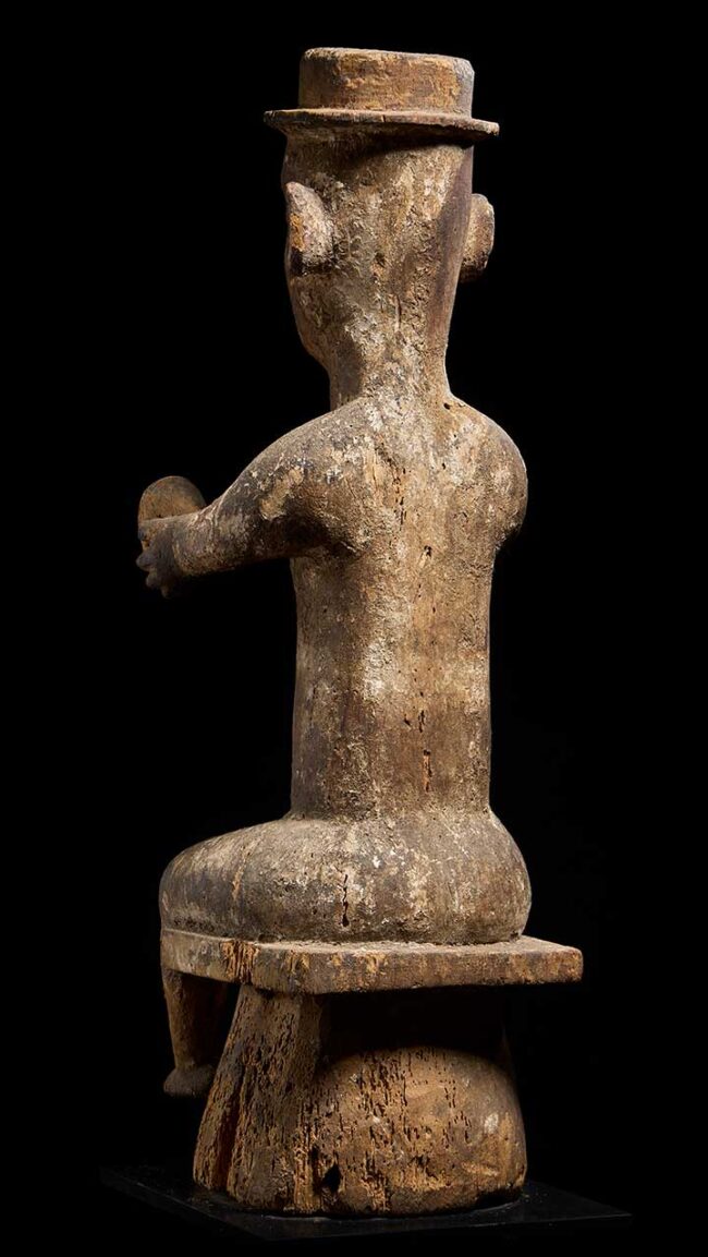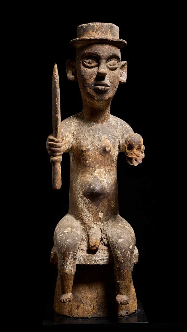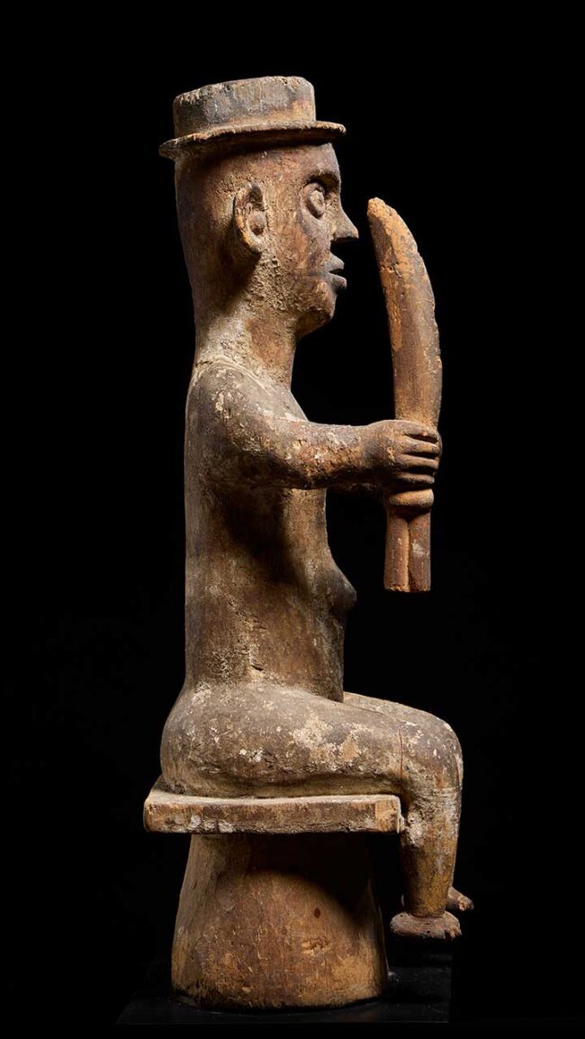 Painted with white and brown pigments, this two-toned warrior figure bears the classic elements of an Ikenga figure. Ikengas are personal shrine figures most commonly made in the Igbo culture, making it extremely rare to find one created by the Ogoni. This figure was crafted to both honor one’s ancestors and serve as a shrine to the power of the right hand. Warrior Ikengas, like this example, typically hold a knife in the right hand and a severed human head in the left. Made of medium-density wood, it is in good condition with most of the original pigments still intact.