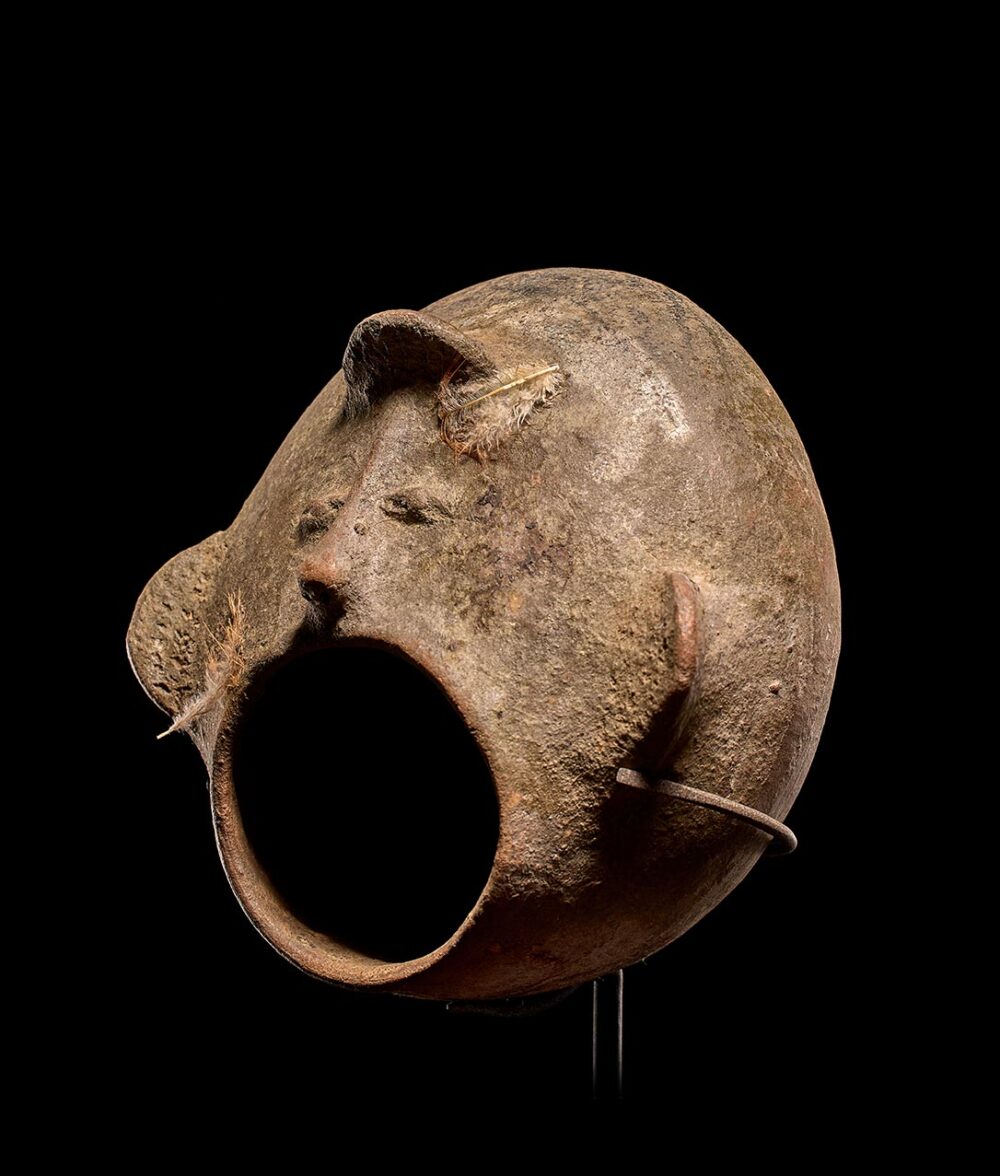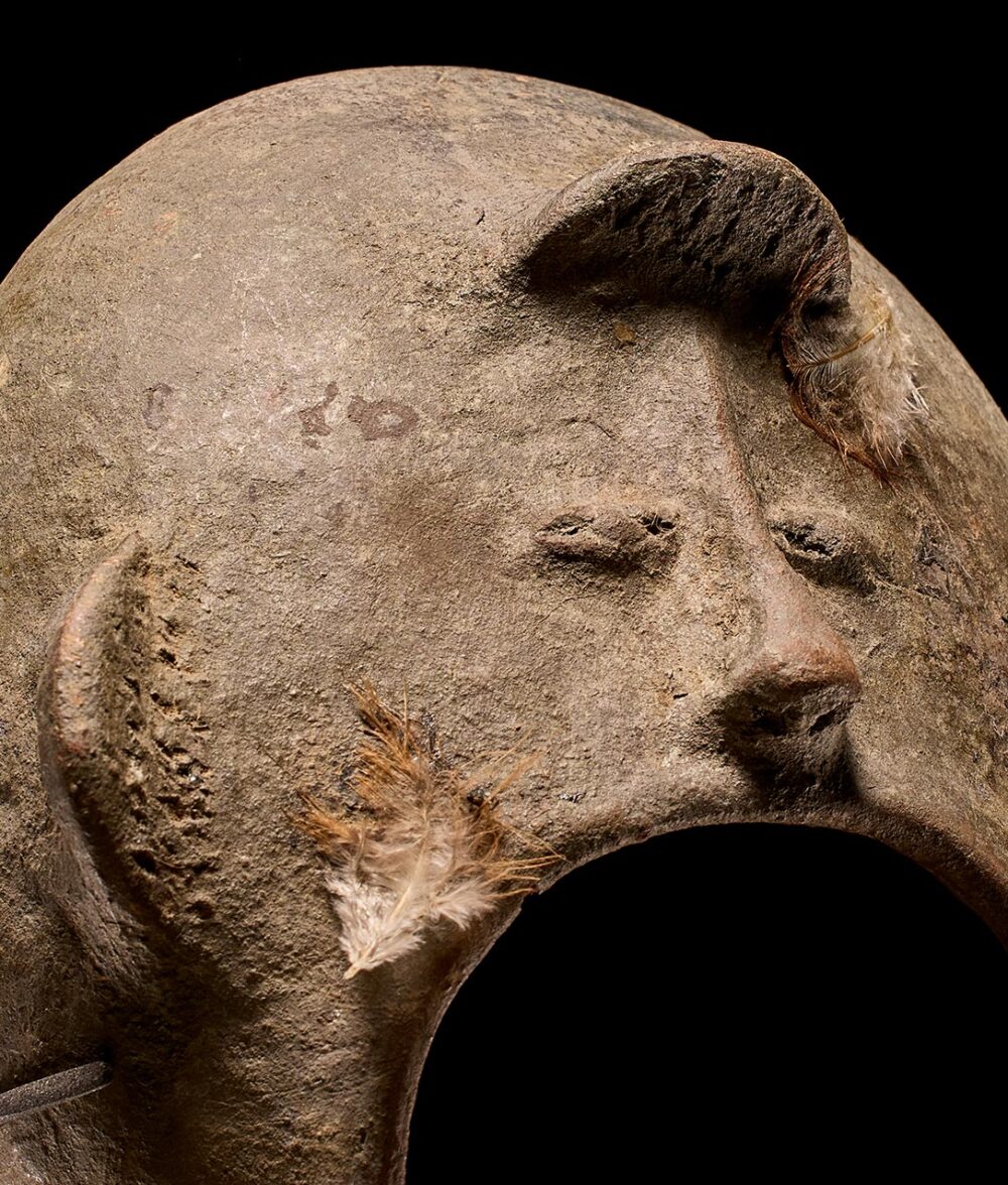 This distinctive bowl is crafted in the form of an abstracted face. Its eyes are represented by raised nodules, flanked by two horizontal bands. A raised vertical line indicates the nose, while the large opening represents the mouth. Beneath the nose, two small openings symbolize nostrils. On both sides of the bowl, ears are depicted as wing-like extensions incised with rows of lines. The surface is heavily encrusted with organic matter, suggesting it received many ritual offerings and libations. No definitive research has been conducted to confirm the exact function of these types of vessels.