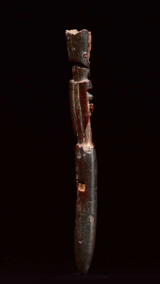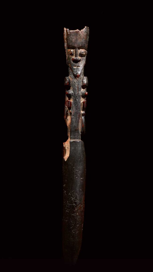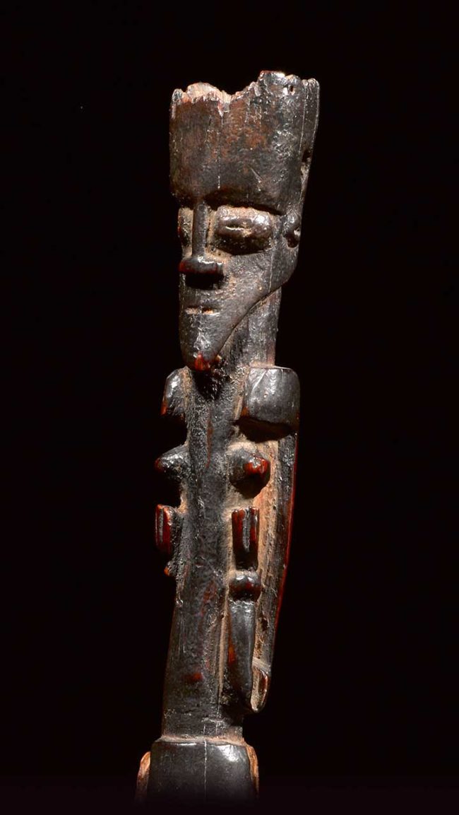 Wooden tappers were an essential tool in Yoruba divination. Used in ceremonies it was struck against a diviner’s tray to call forth spirits to the proceedings. This example is beautifully sculpted, in the form of a stylized torso. It wears a tall cylindrically shaped hat and its facial features are serious and powerful. Wearing a look of concentration, its wide set eyes, strong nose, and elongated arms make for a very compelling sculpture. There is ancient wear and loss to one arm, and also at the bottom on the actual tapper section. The patina is dark and deep, attesting to its age and abundance of use.