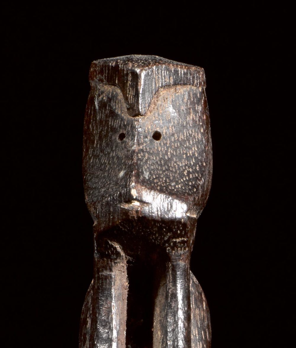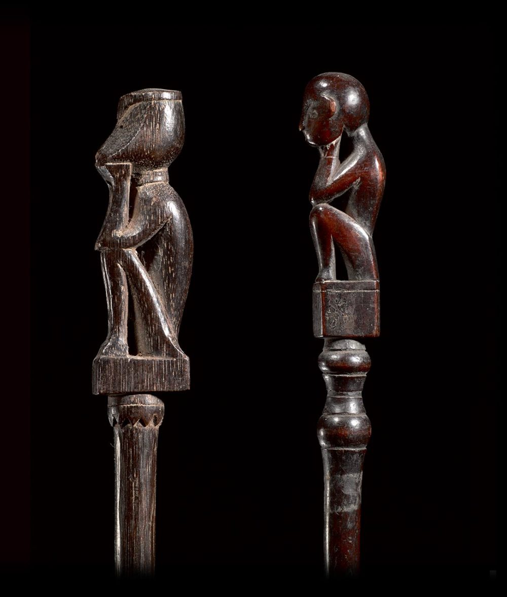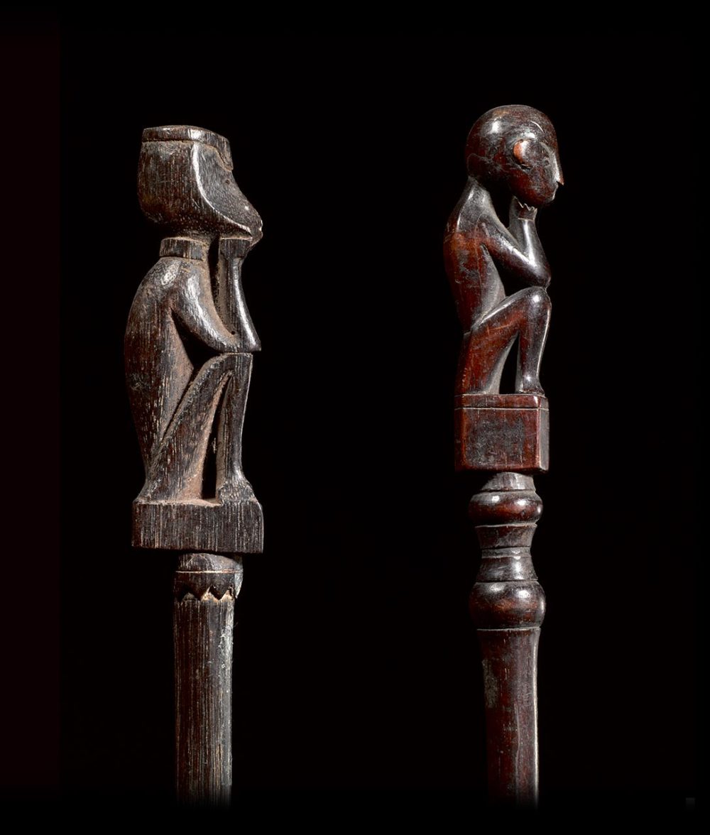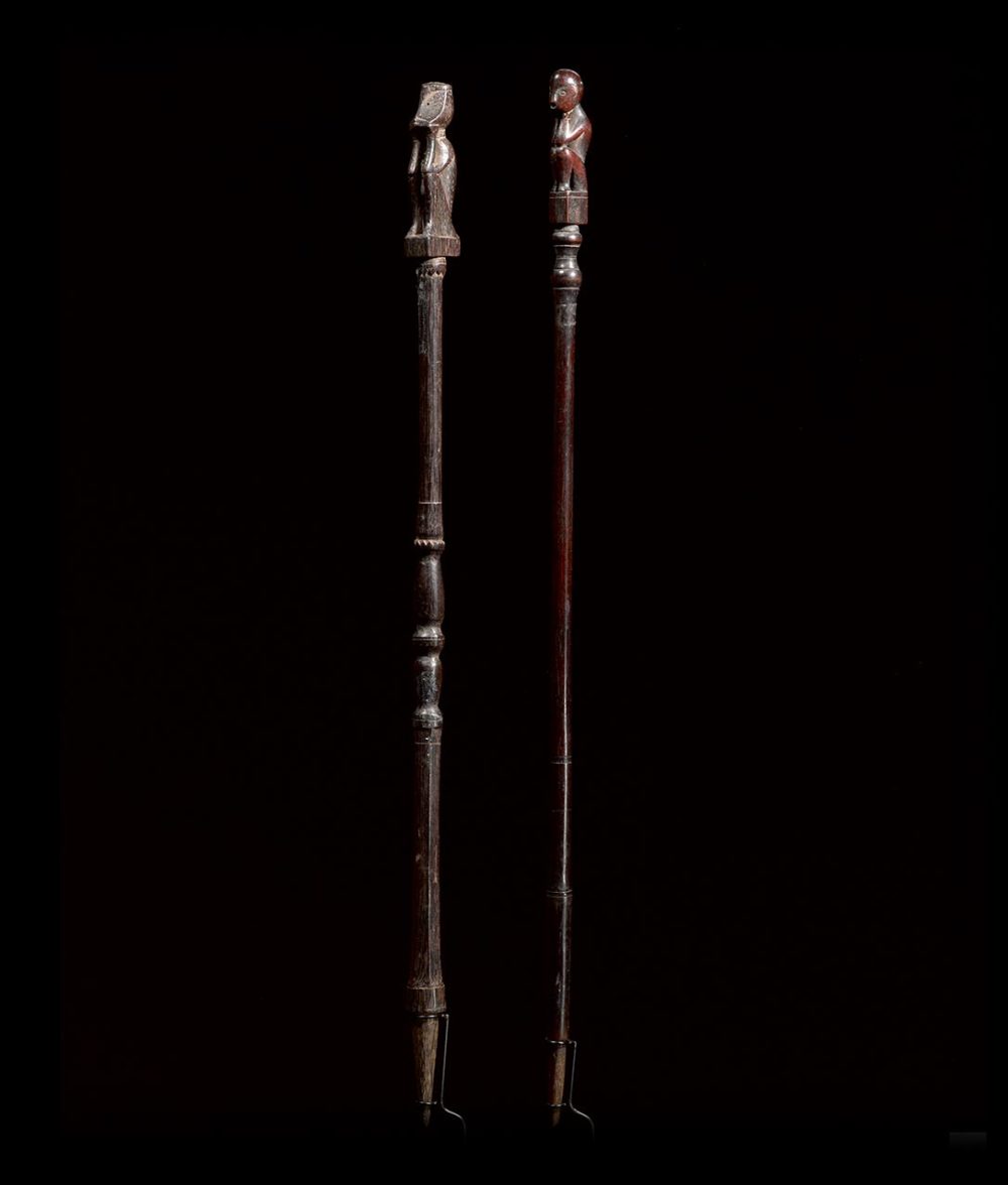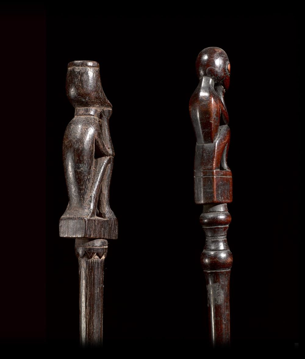 Tun Tuns are markers, used to magically enhance and measure the height of pig traps erected in the jungle. These two Tun Tuns are beautiful examples. The ornamental figures on top of the stick empowers the trap. Usually depicted in a hunkered form, the larger figure is carved in an elongated stylized form. While the smaller figure has a more compact composition and naturalistic representation. Both are carved from hard wood and have dark handled patinas and evidence of abundance of use.