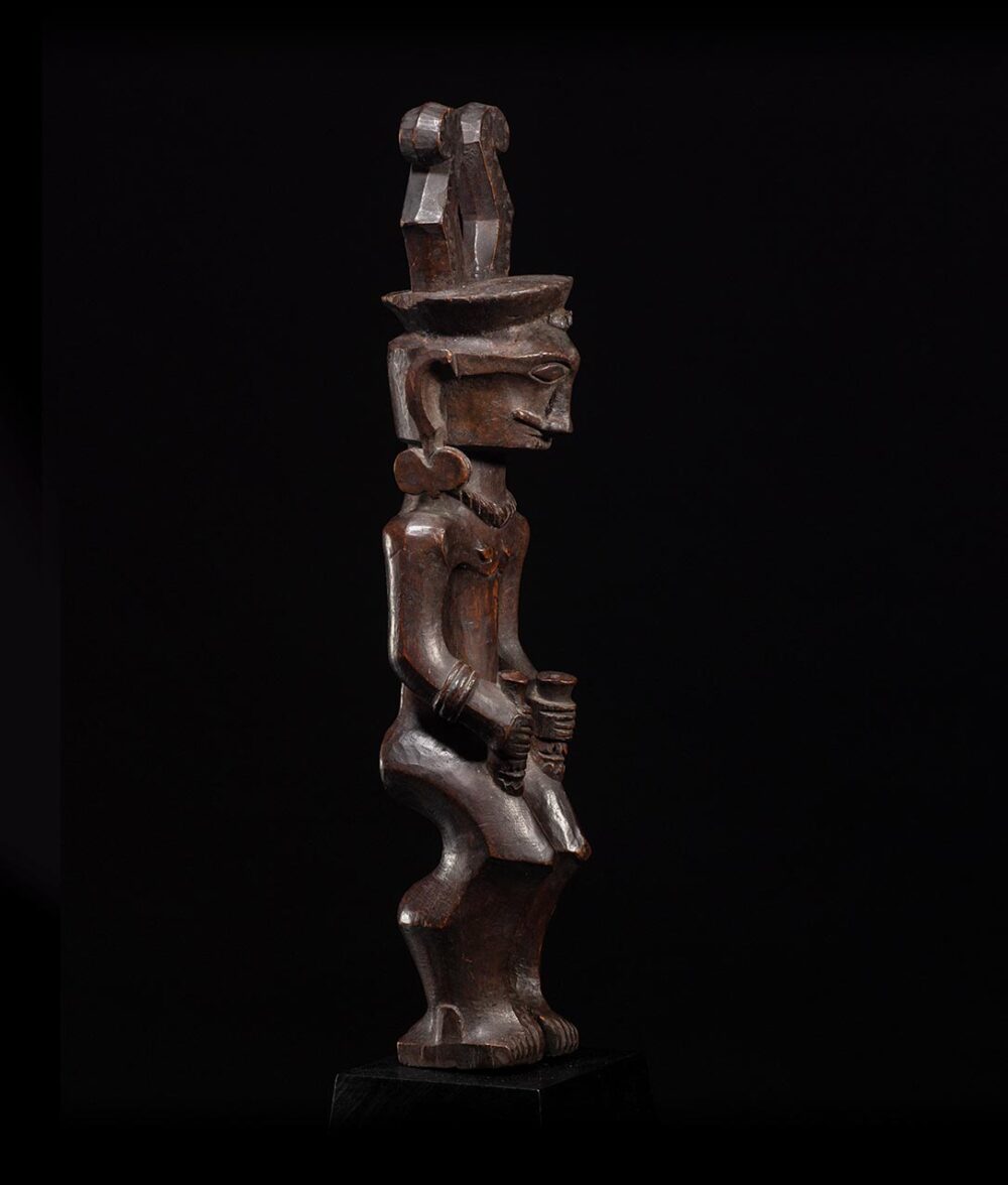 Nias ancestor figures are displayed inside a chief’s house as a protective device. Representing deceased ancestors, these figures were beautifully carved. Reminiscent of cubist style sculpture, this example is depicted with great tension and posture. Its forked royal crown, chiefly adornments, delicately carved hands and feet, and symmetrical facial features are elegantly depicted, suggesting the figure’s importance. Its thick and curvaceous legs viewed in profile create a sense of dynamic movement. The deep patina is the result of generations of use.