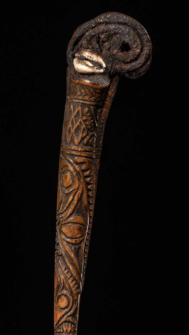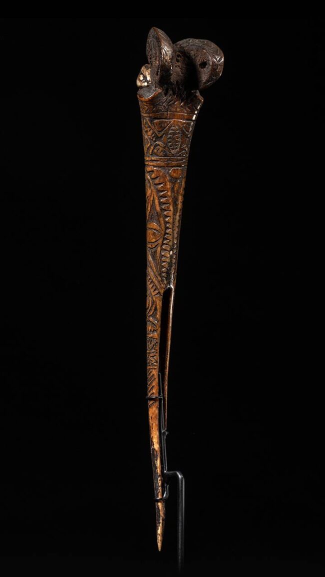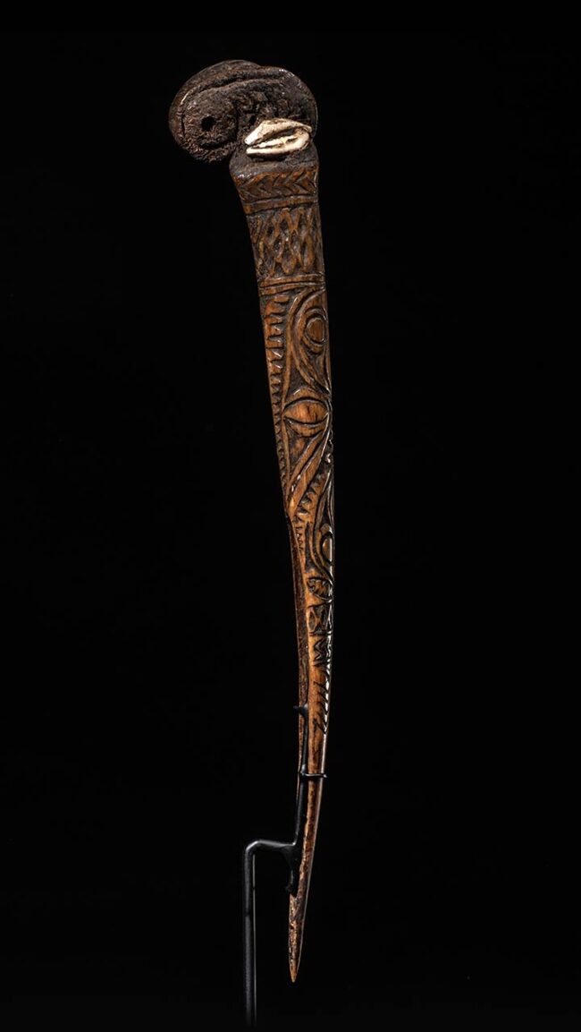 This is a wonderfully detailed example of a dagger made from bone. It clearly shows signs of use during war runs. Towards the top, classic renditions of Kwoma faces have been carved in relief; they are boarded by various geometric clan designs. At the top, two cowrie shells are adhered within the cavity of the bone’s joint. The dagger has a lovely creamy aged patina, and there is still feint evidence of red ochre pigment that originally decorated it. The entire surface has become very worn and smooth from handling and extensive use. A very similar example can be found published in John Friede’s “Masterpieces from The Jolika Collection”, fig. 331. Friede also notes, “Among the Kwoma, the daggers were usually made of human bone and a man inherited the femurs of his father after the corpse was reduced to a skeleton.