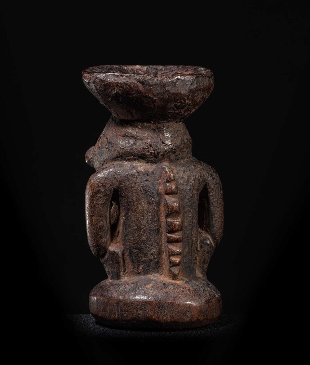 Archaic in style, this Betel Mortar is a unique example from Murk Lakes, in the East Sepik Province, a region yielding fewer objects compared to the Middle Sepik. This small, cup like object would have been used to aid in chewing betel nut and was also a mark of secular and religious authority. The bowl of the mortar is supported by an ancestral or spirit figure, depicted in a crouched position, with large, deeply set eyes and geometric decoration. The surface of the mortar is well worn, suggesting heavy use.