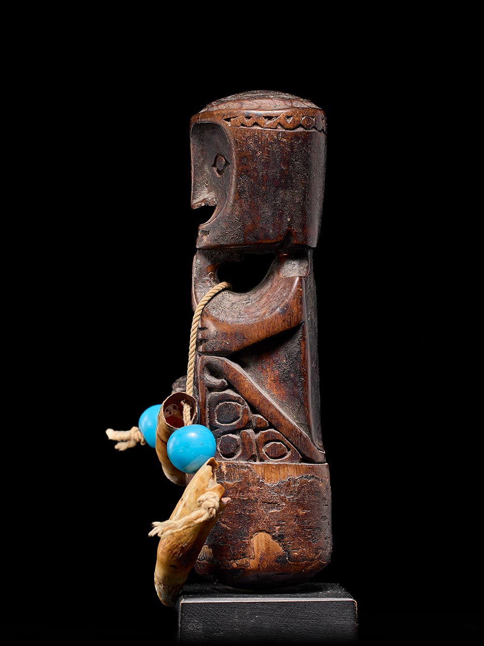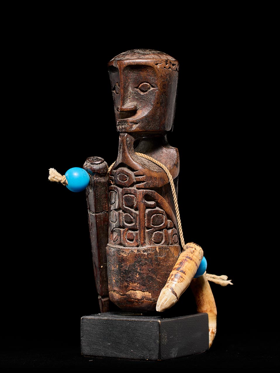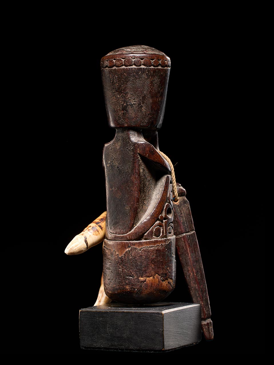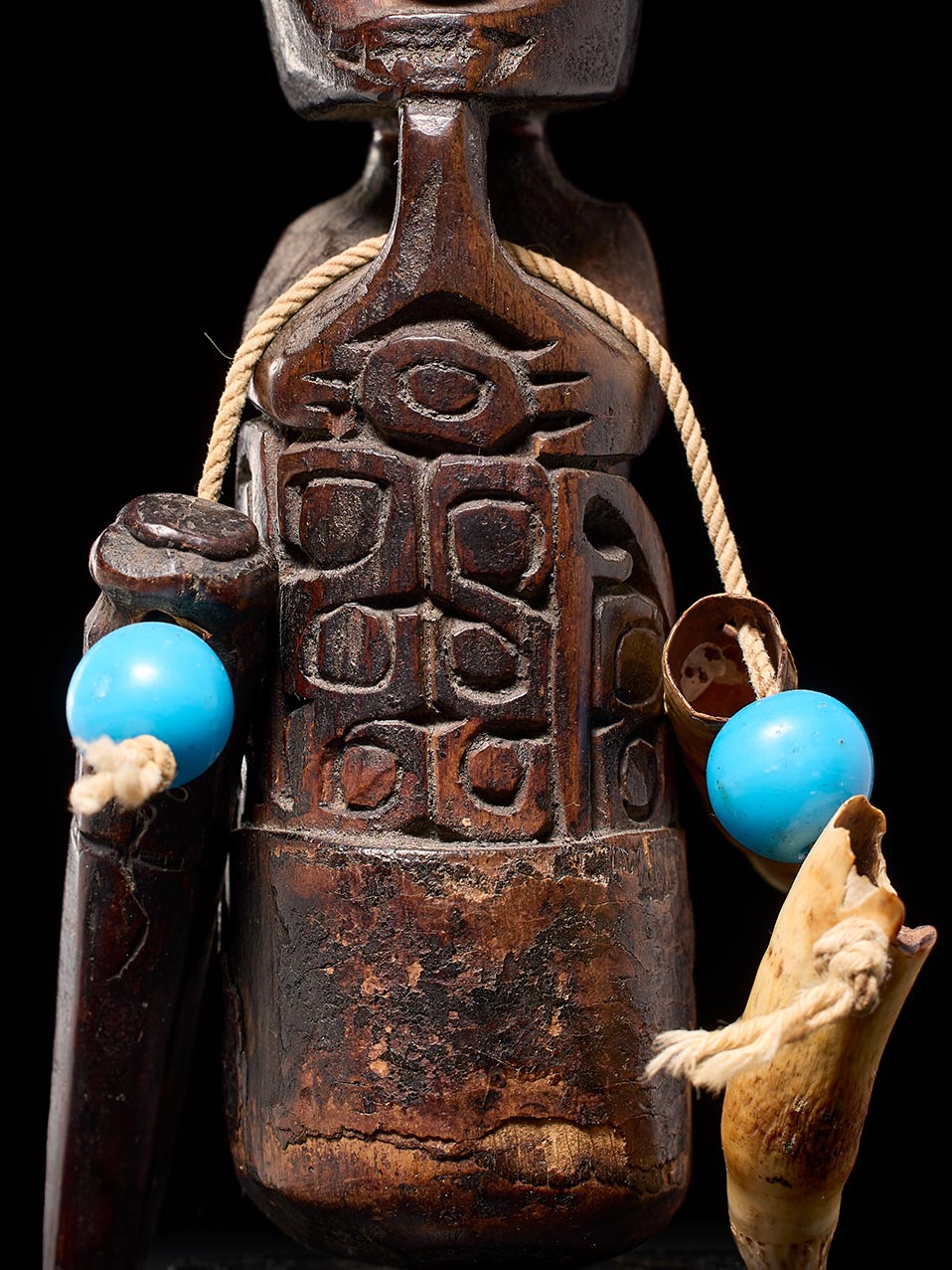 Suspended from a cord around the figure are two 19th-century Chinese glass trade beads and a pair of crocodile teeth—additions that not only enhance its visual appeal but reinforce its talismanic function.