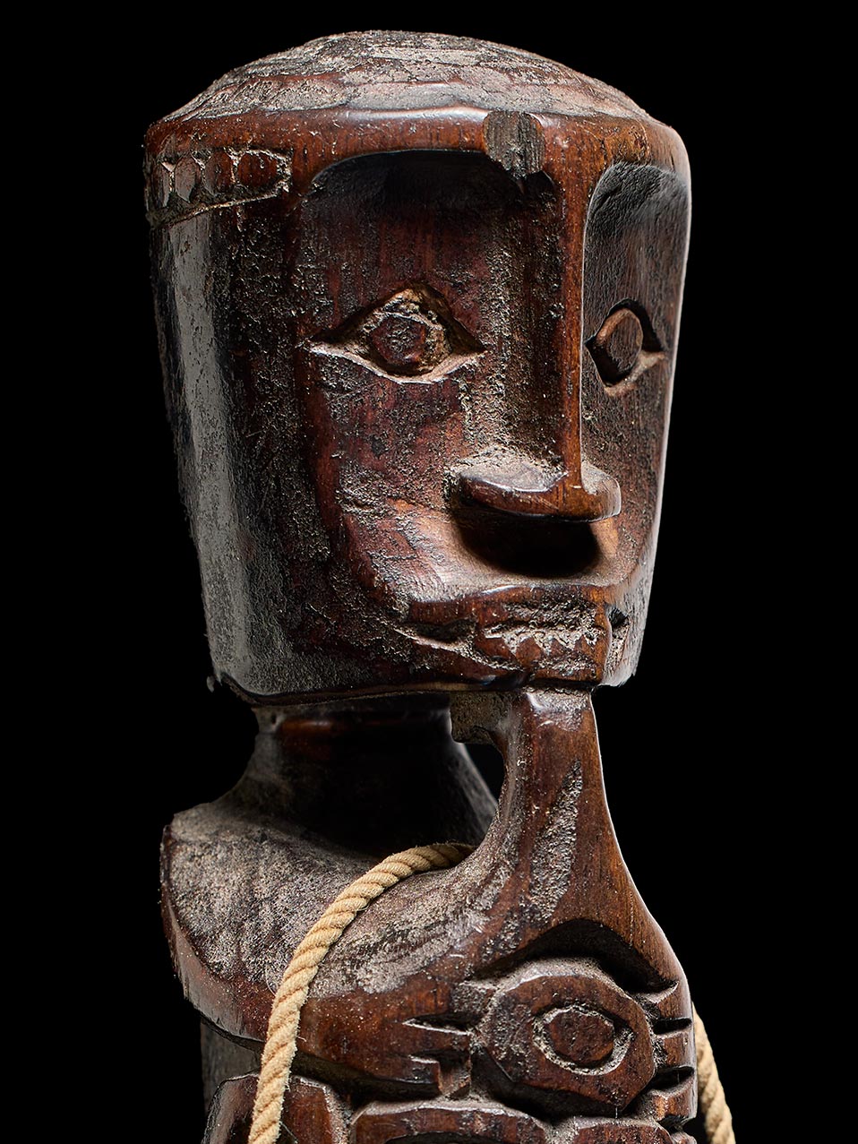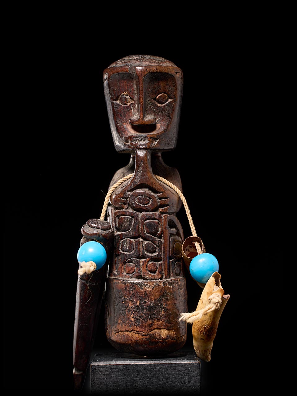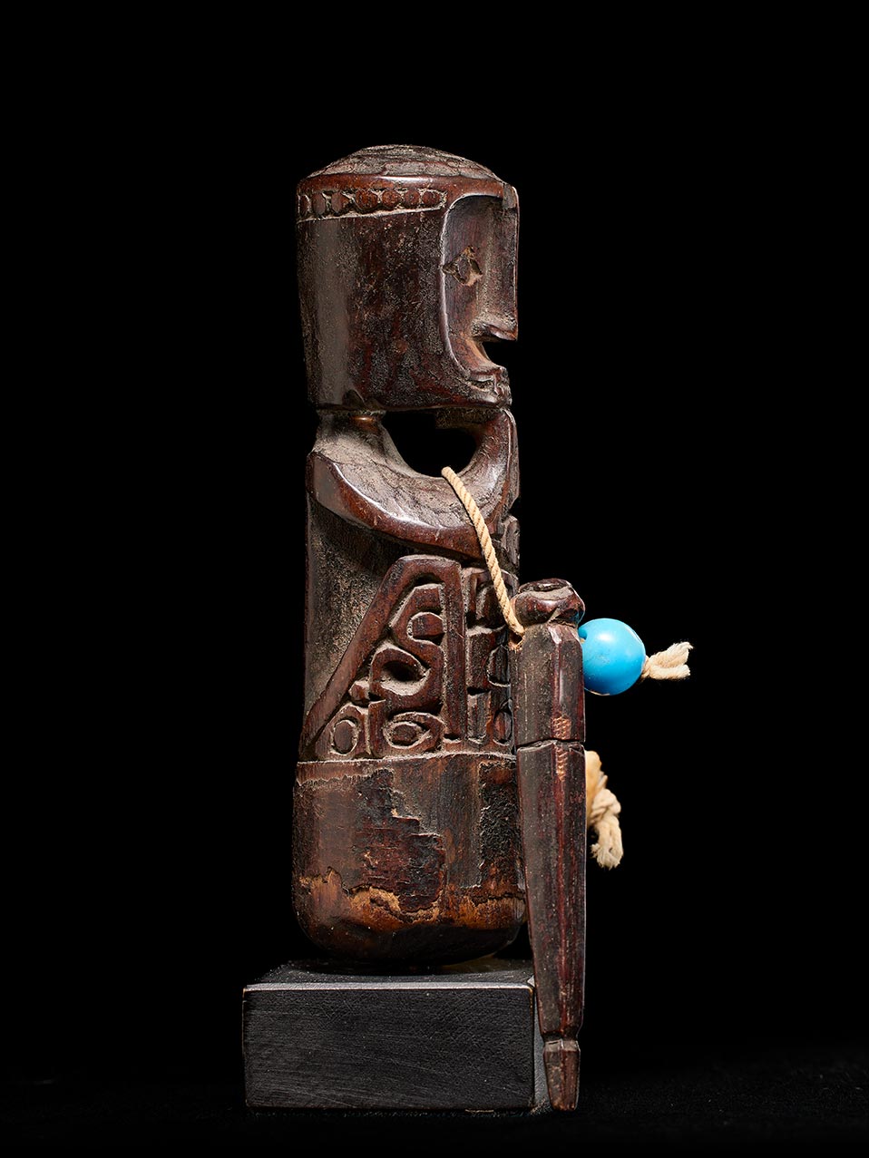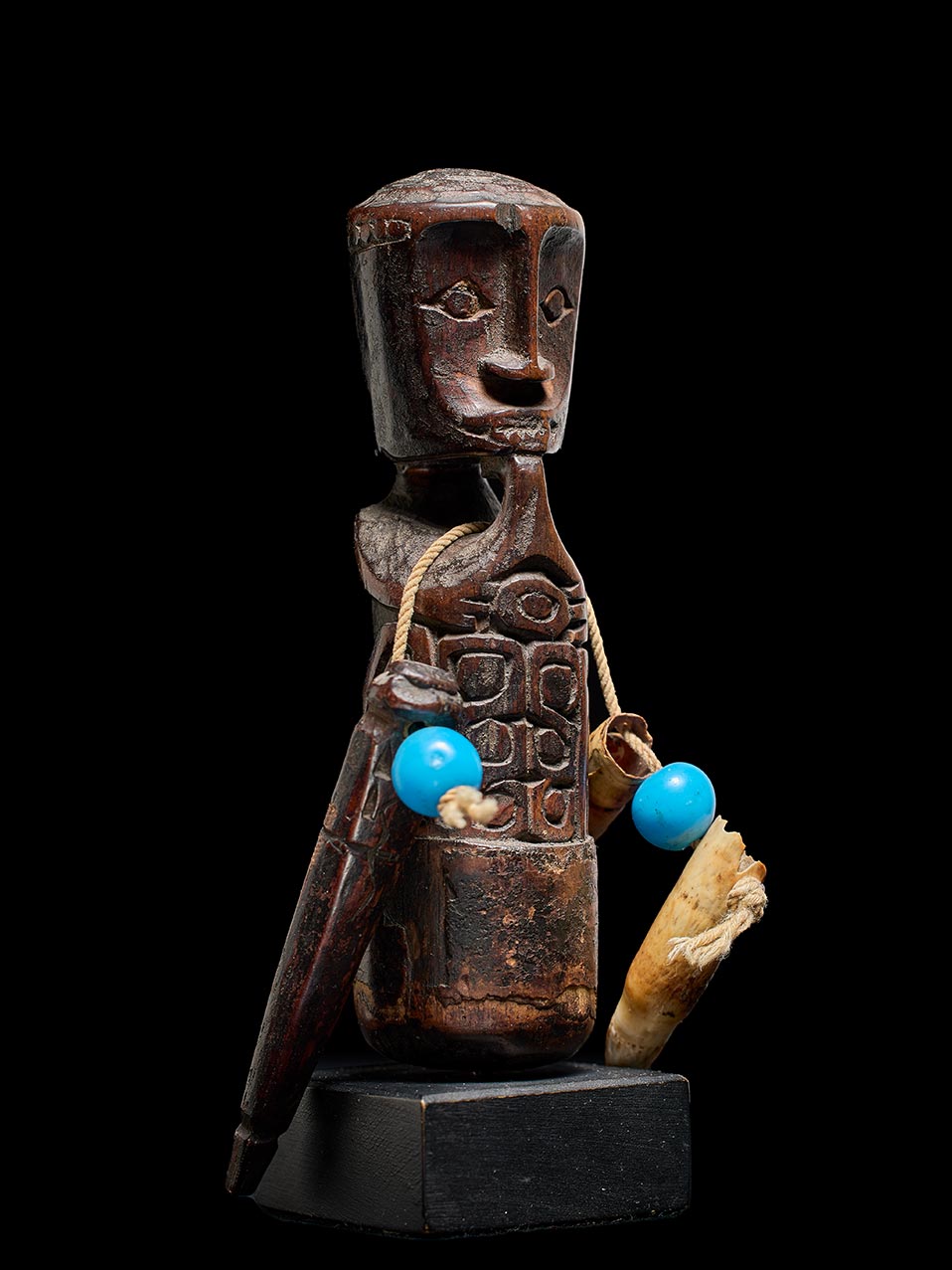 Suspended from a cord around the figure are two 19th-century Chinese glass trade beads and a pair of crocodile teeth—additions that not only enhance its visual appeal but reinforce its talismanic function.