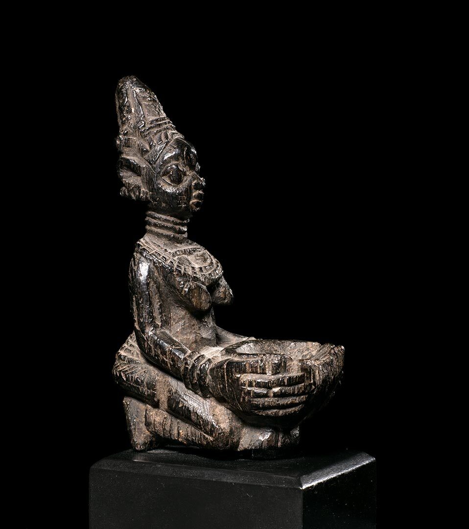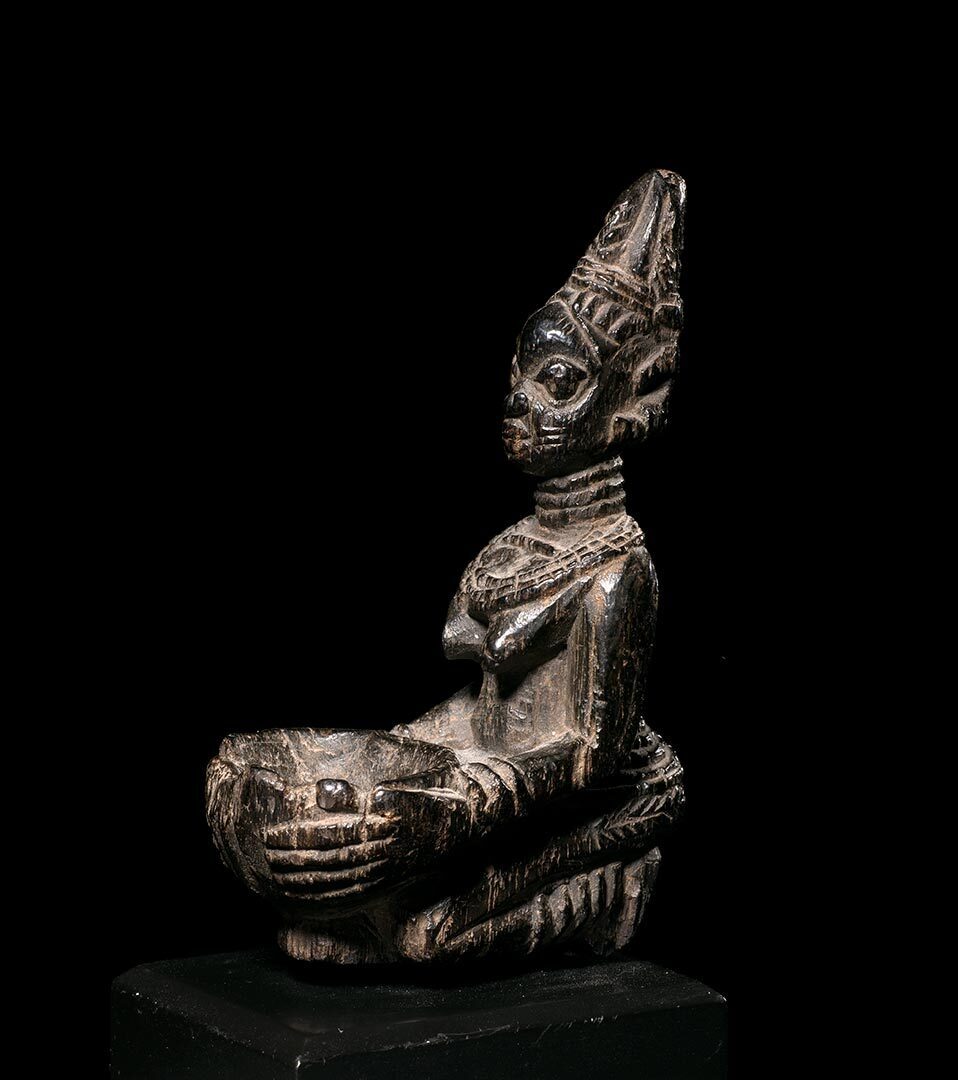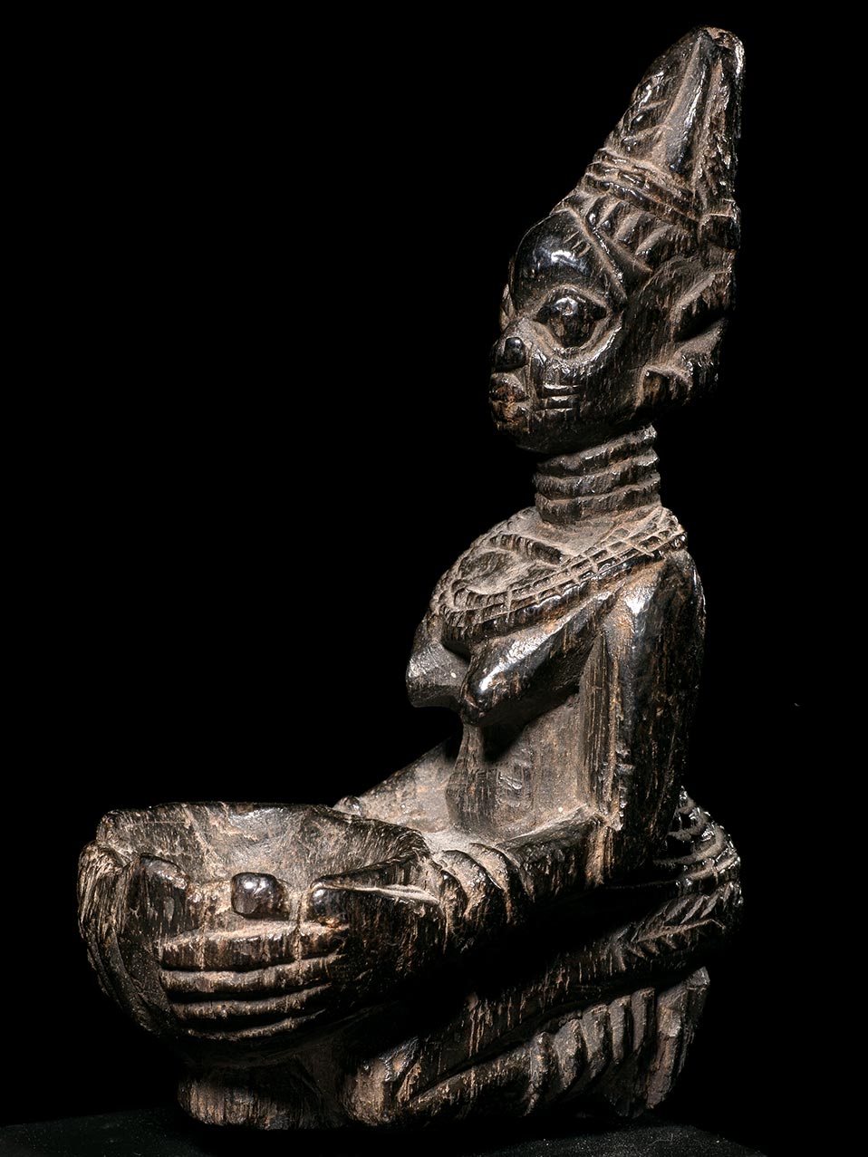 This object is a diviner’s prop used in ritual practice. It is a miniature version of an agere Ifá bowl. Finely carved from dense hardwood, this Yoruba figure depicts a kneeling female holding a bowl—a form traditionally associated with ritual offerings and Ifá divination. Known as agere Ifá, such larger-sized bowls were used to hold sacred items like kola nuts, cowrie shells, or palm nuts during ceremonies honoring the Orisha. The kneeling posture and calm expression convey humility and devotion, while the intricate coiffure, jewelry, and scarification marks reflect ideals of feminine beauty, virtue, and spiritual power. The figure bears a deep, dark patina and visible wear, testifying to its extended use in religious practice and its enduring role as a spiritually potent object.