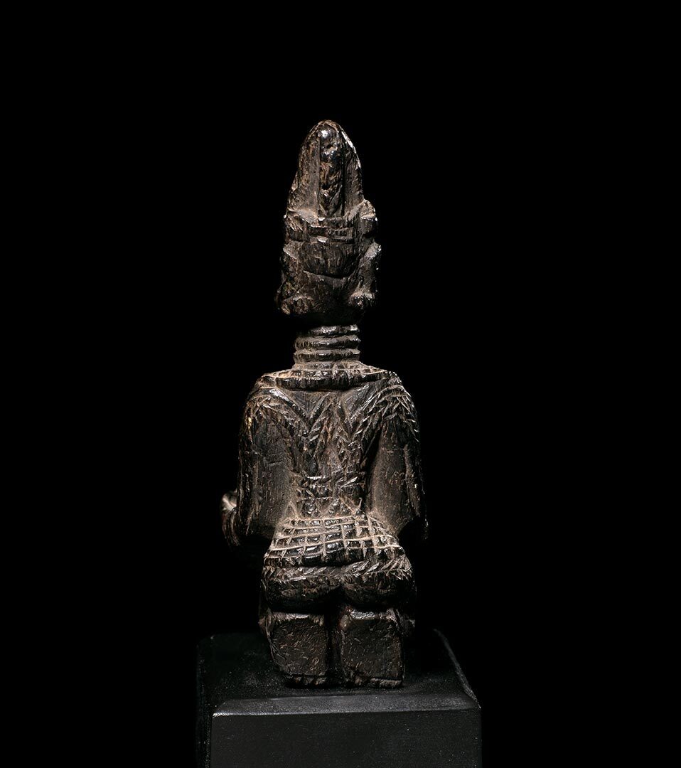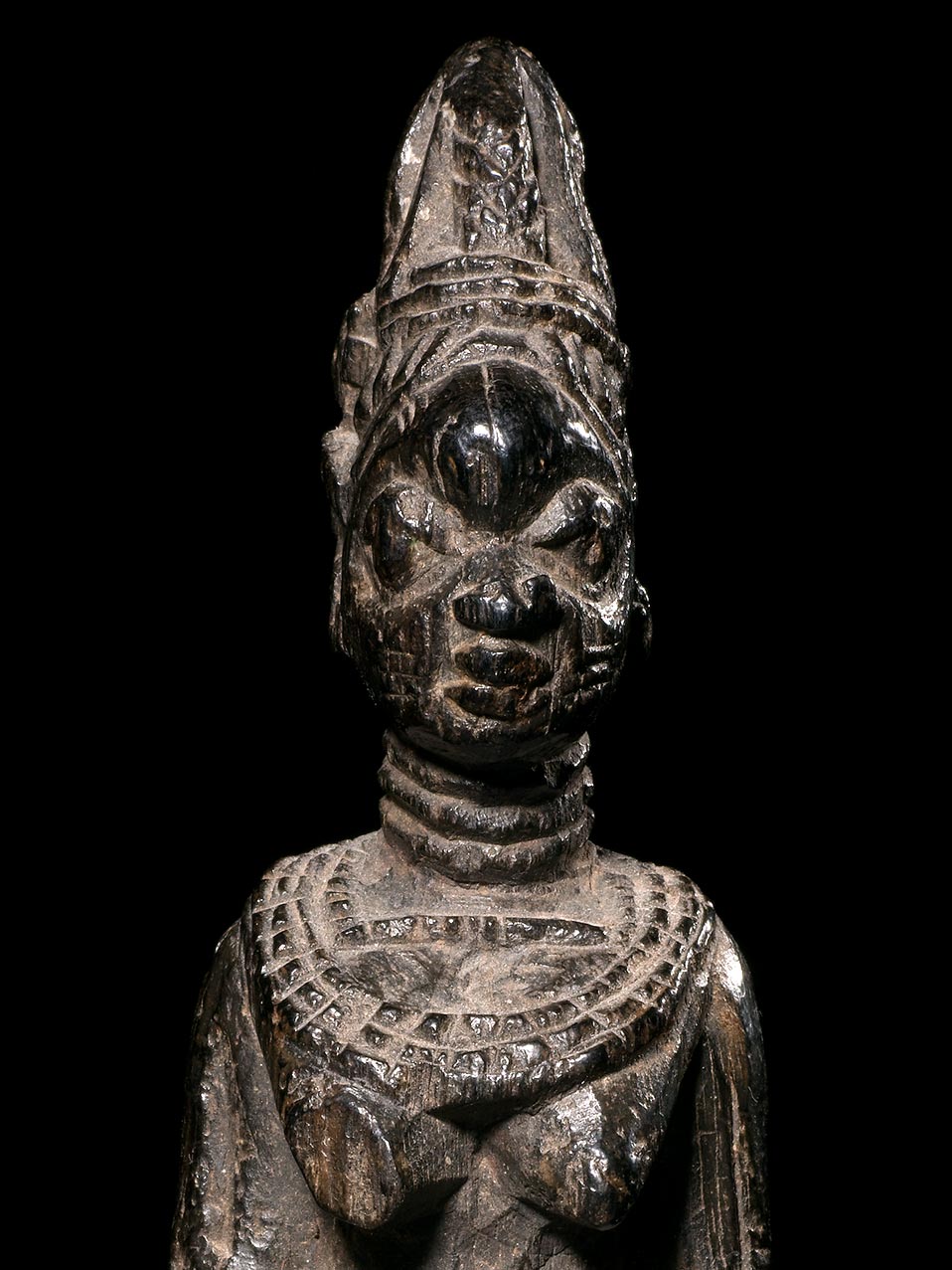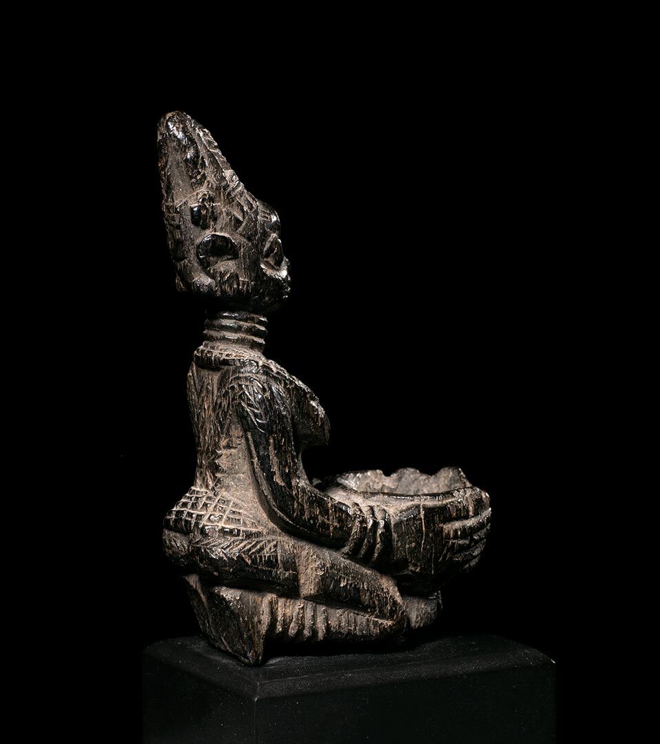 This object is a diviner’s prop used in ritual practice. It is a miniature version of an agere Ifá bowl. Finely carved from dense hardwood, this Yoruba figure depicts a kneeling female holding a bowl—a form traditionally associated with ritual offerings and Ifá divination. Known as agere Ifá, such larger-sized bowls were used to hold sacred items like kola nuts, cowrie shells, or palm nuts during ceremonies honoring the Orisha. The kneeling posture and calm expression convey humility and devotion, while the intricate coiffure, jewelry, and scarification marks reflect ideals of feminine beauty, virtue, and spiritual power. The figure bears a deep, dark patina and visible wear, testifying to its extended use in religious practice and its enduring role as a spiritually potent object.