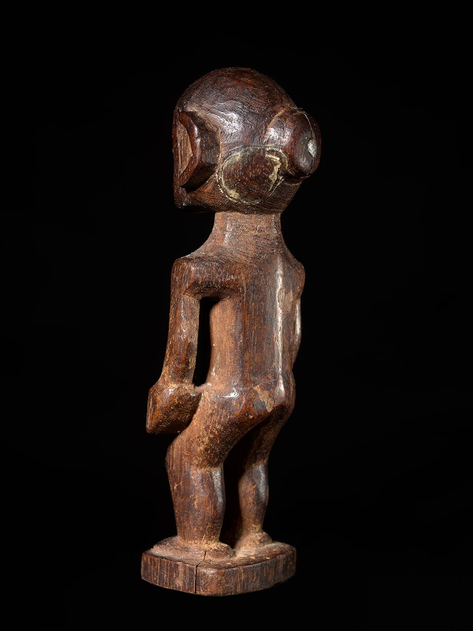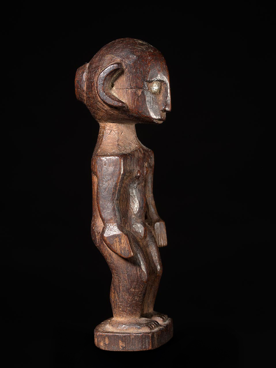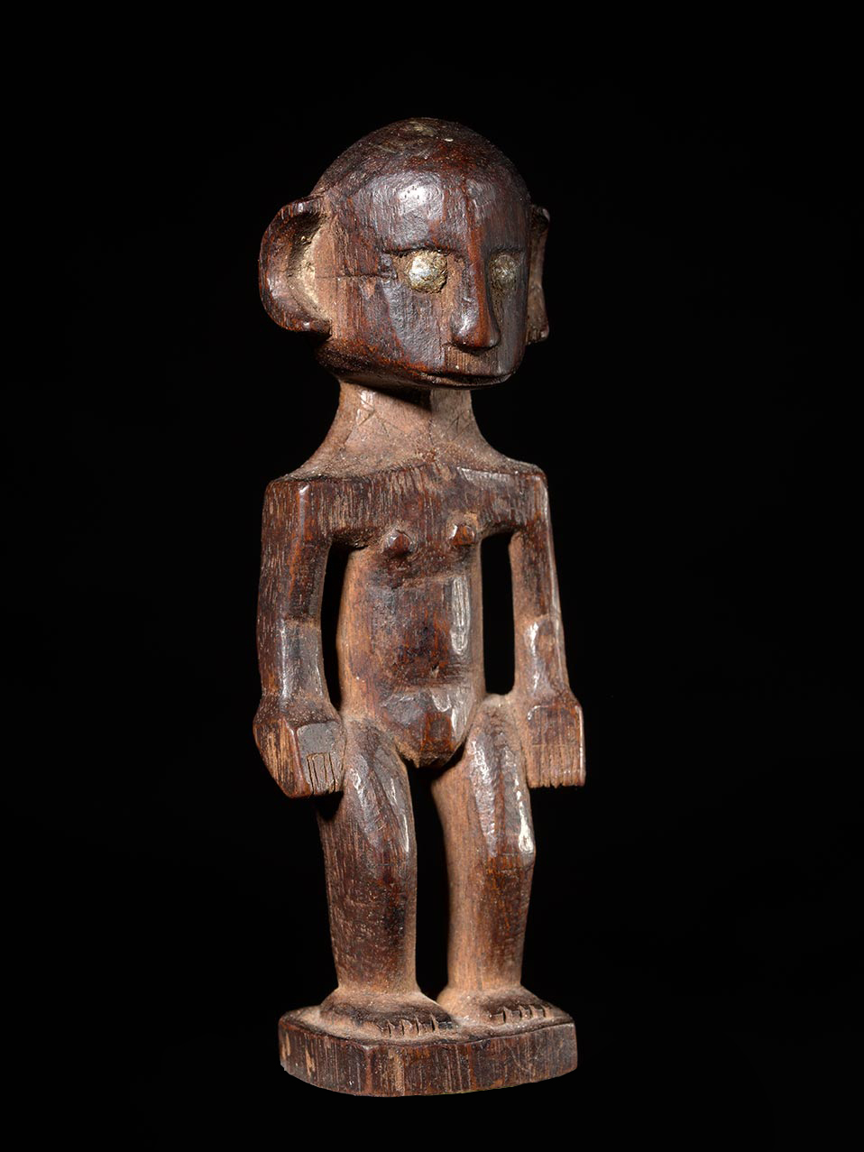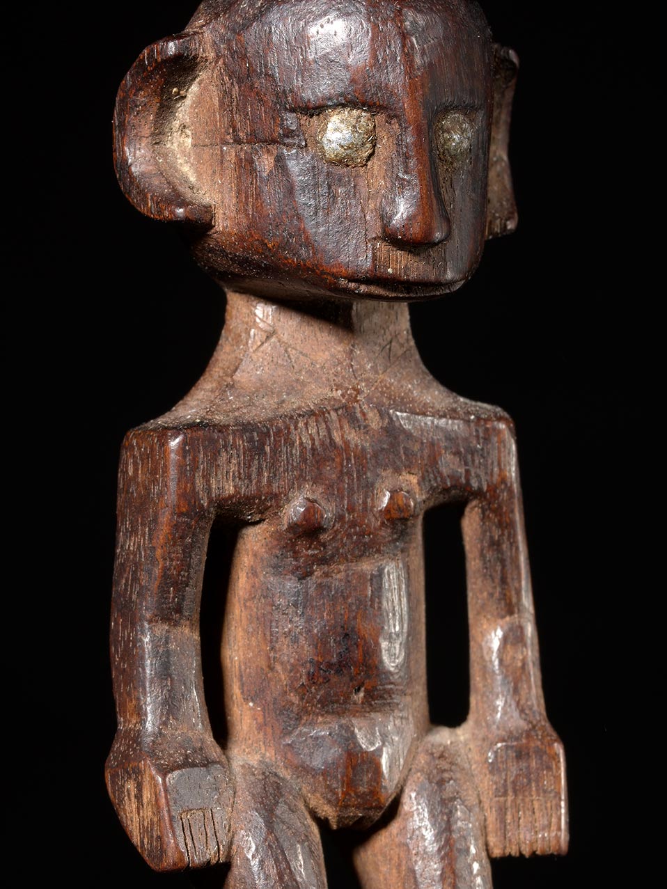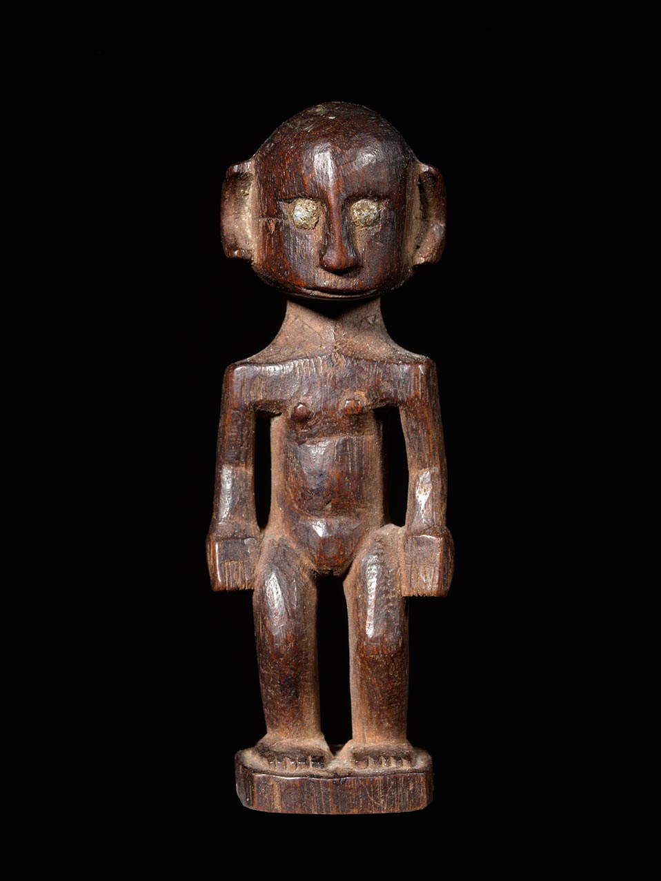 Though small in scale, this amulet possesses exceptional sculptural presence. The attention to detail is remarkable, with clearly delineated hands and feet and elegant negative space between the limbs and body. The eyes are inset with metal, and an additional metal insertion at the back of the head may have been intended to enhance the figure’s potency as a charm. The surface bears a deep, rich patina from prolonged handling and ritual use. Finely carved figures from Flores—particularly of this diminutive scale—are exceedingly rare. This example is in excellent condition.