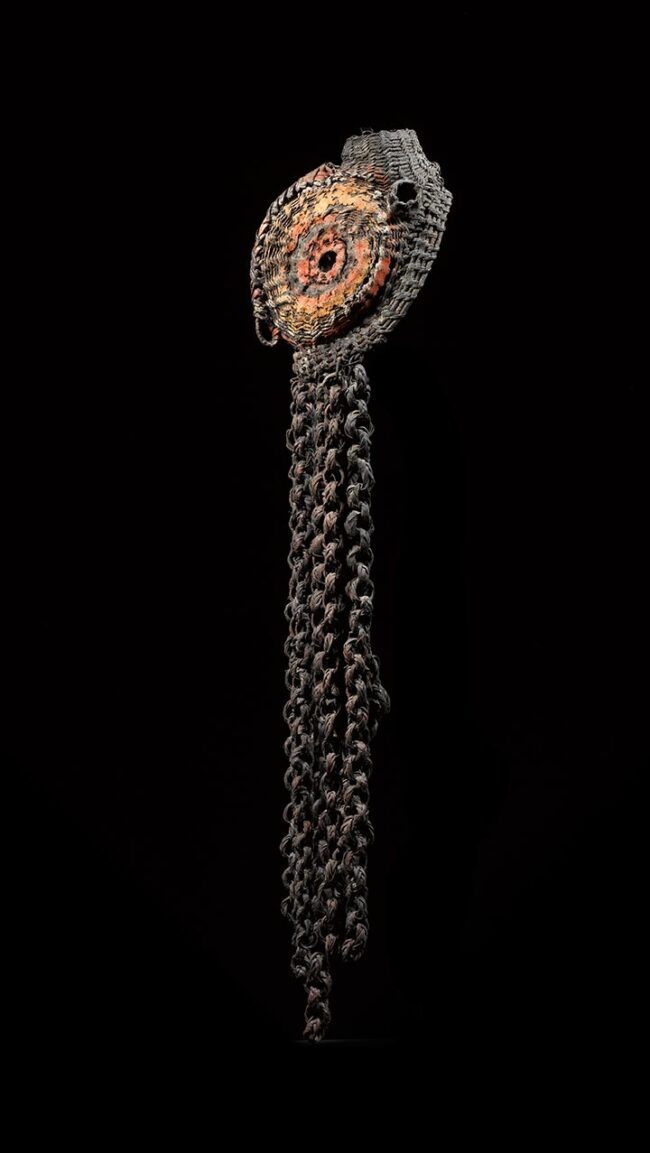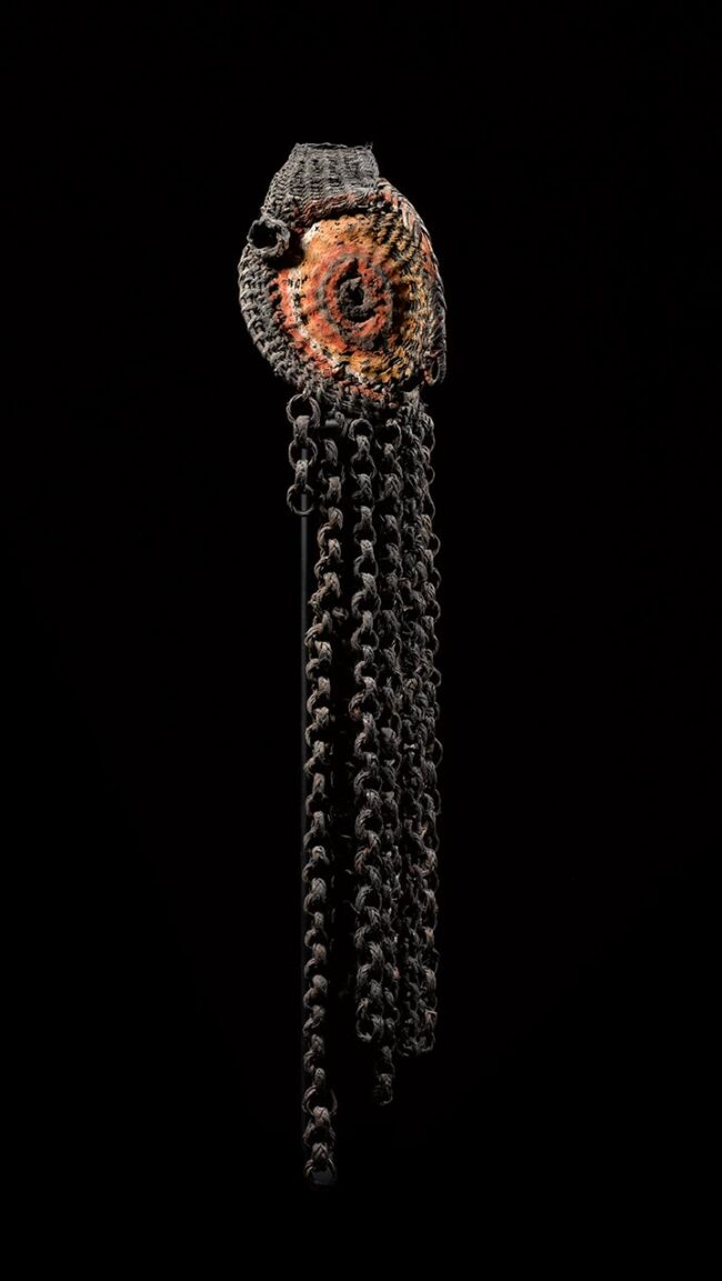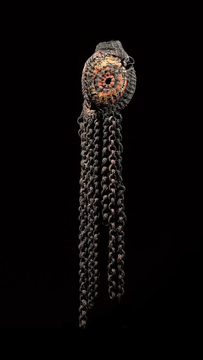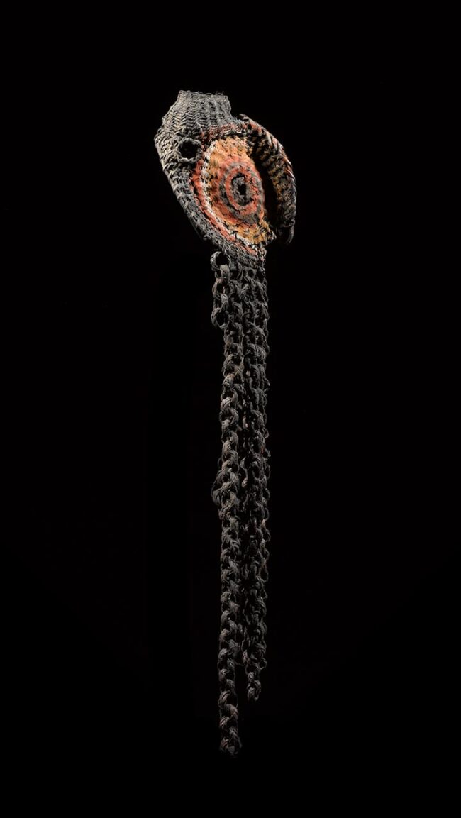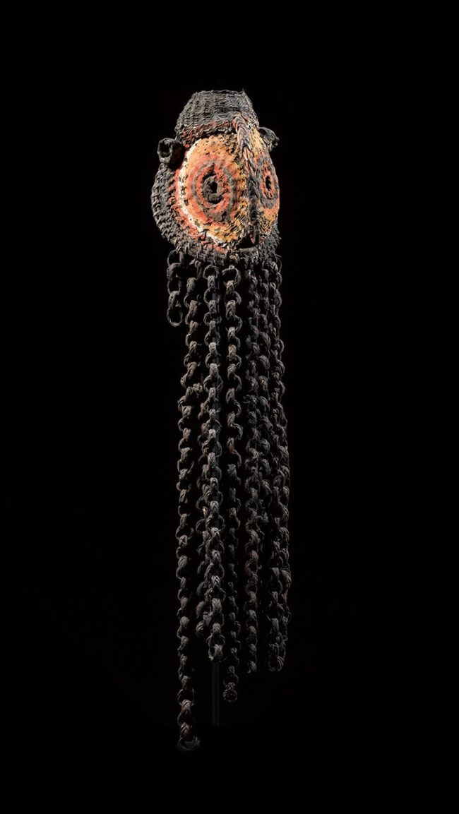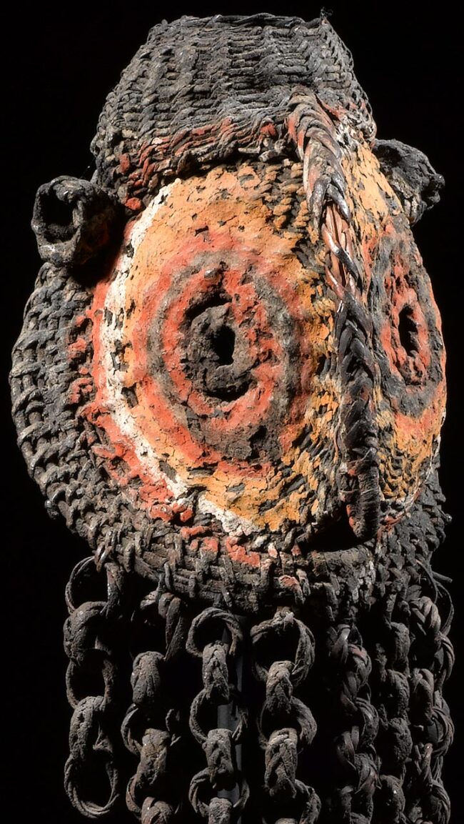 Often mistakenly referred to as Yam Masks, this small mask with woven chains would have been worn on the backside of a young male initiate’s headdress during an important ceremony. The mask is made from tightly woven cane, and still retains its original decorated colors of encrusted ochre, orange and white pigments. In excellent condition.