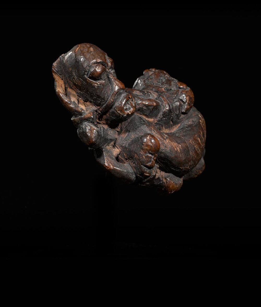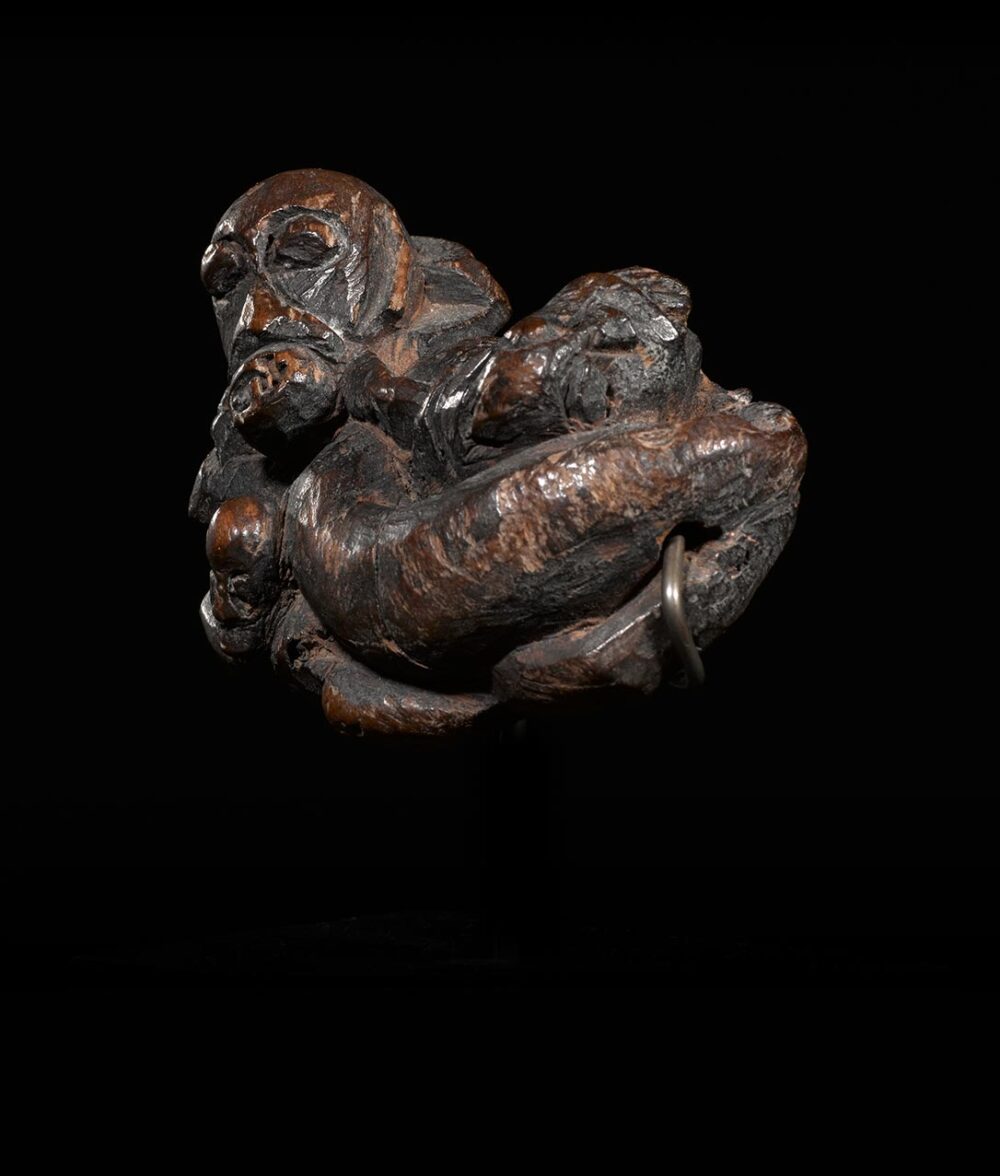 Dayak Magic amulets come in many forms and are made from many mediums. This particular amulet is derived from a natural root, which has been carved into an anthromorphic figure, with a human like face and a Dragon/Aso body. Two additional faces boarder the main figure, and on its backside an animal totem figure is carved in relief. According to H. Ling Roth in, “The Natives of Sarawak and British North Borneo”, natural roots were amongst the most powerful and revered charms a Dayak tribesman could own. It was believed that these curiously shaped roots which closely resembled important beings and creatures in Dayak culture; were actual gifts from the Gods. Besides being a wonderful and dynamic sculpture, this charm has great age and a very dark and well handled patina.