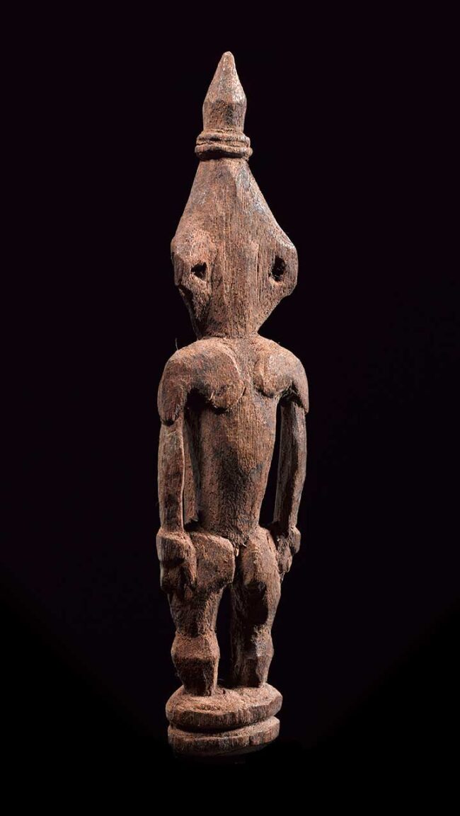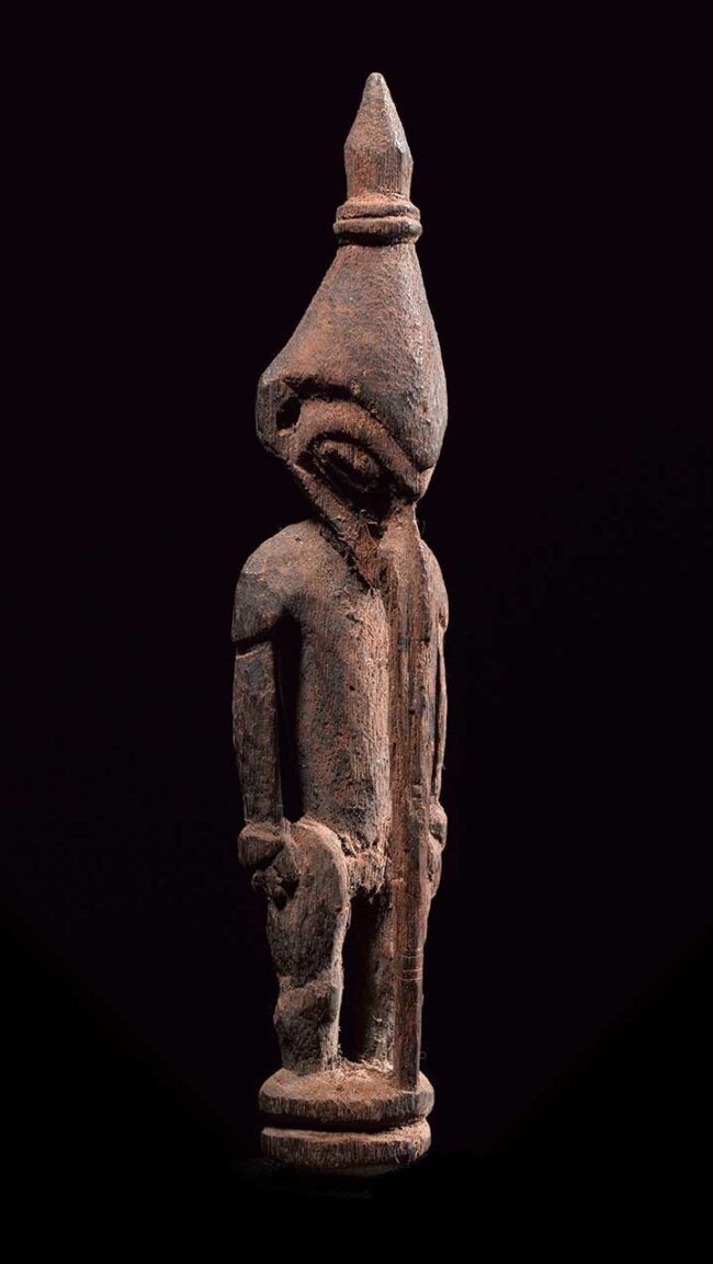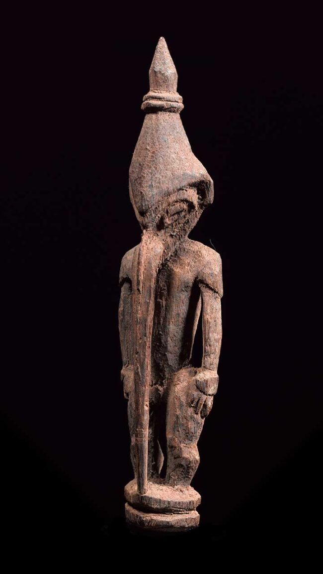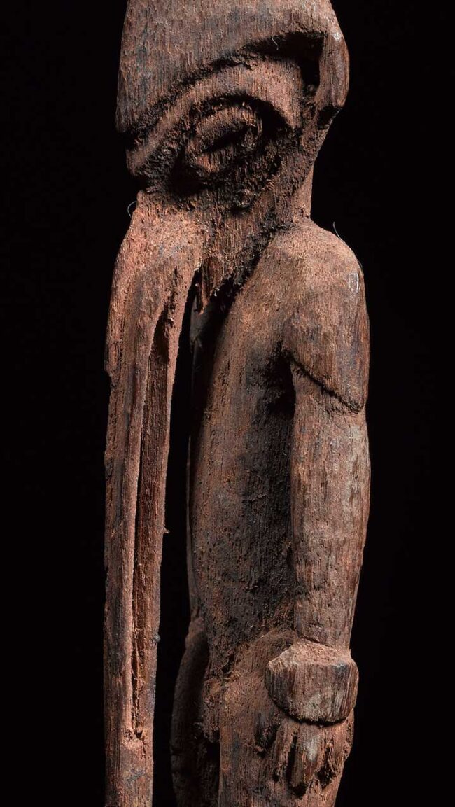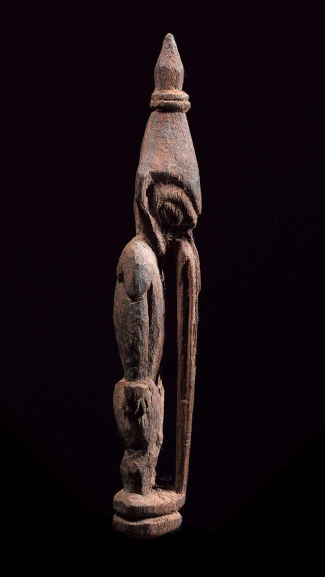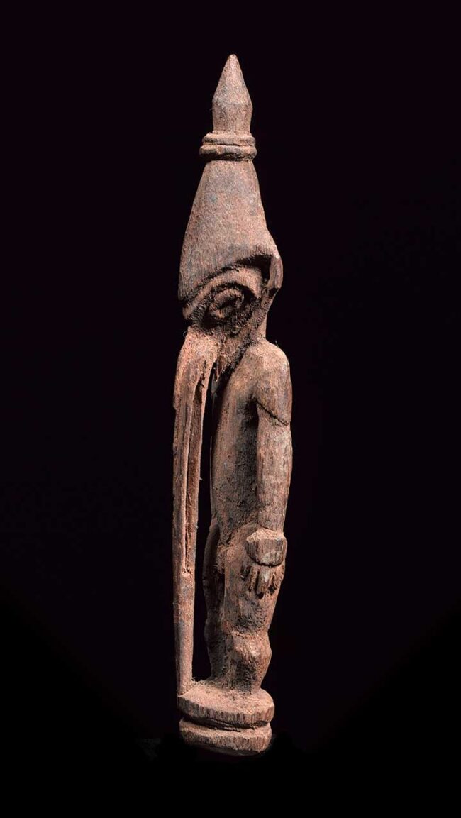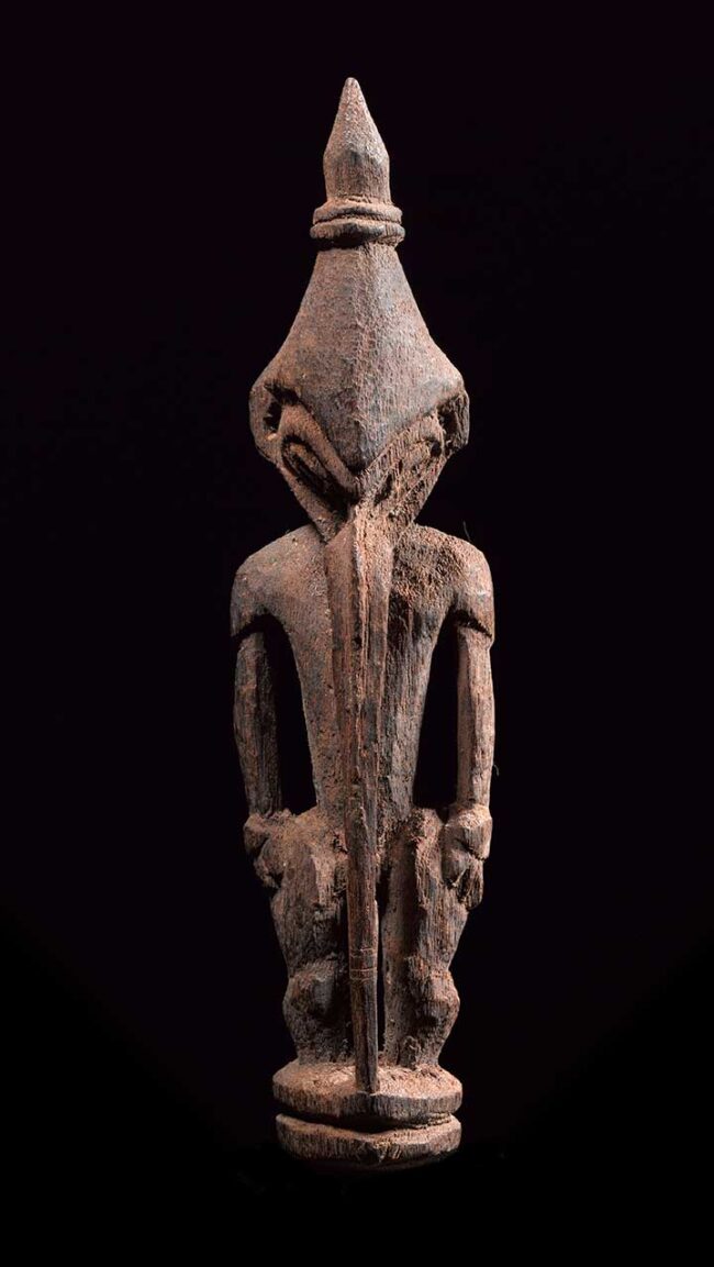 This very fine amulet figure attracts attention with its striking long pierced nose that descends all the way to the figure’s base. The figure is classically carved with oval eyes, pierced ear lopes and conical headdress. Its body is strong with well carved hands and flexed legs. Its back also has defined shoulder blades. The entire figure still retains the red ochre pigment it was originally painted with.