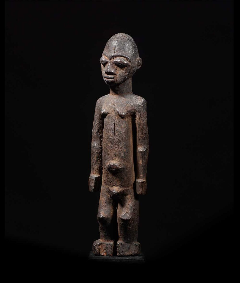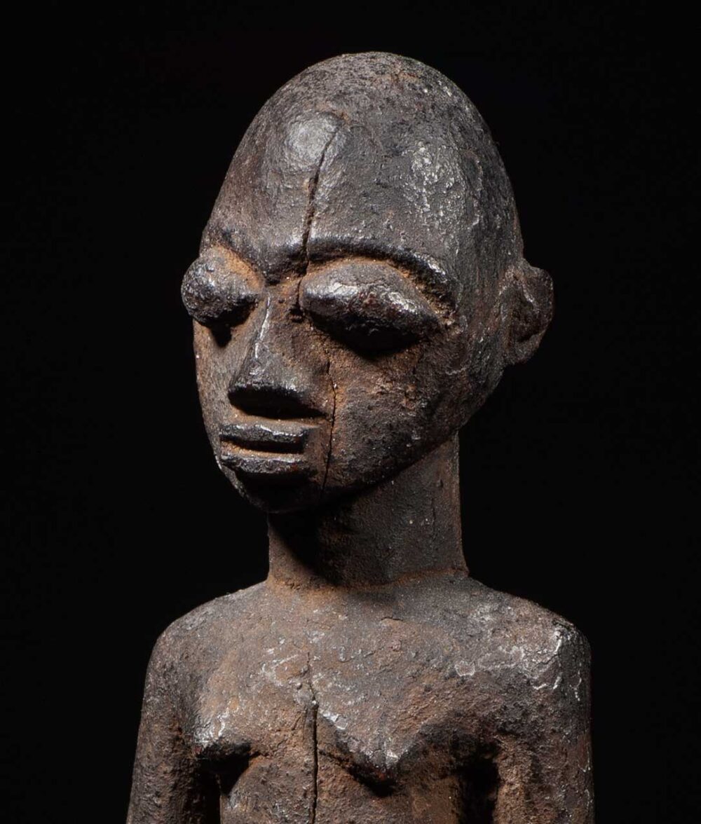 Standing on thick powerful legs this fine Lobi figure is sculpted by a known hand. Possessing great attention to detail; its naturalistic face has beautifully carved features, such as its raised oval shaped eyes and protruding lips. Carved from hardwood with a deep aged encrusted patina from decades of use.