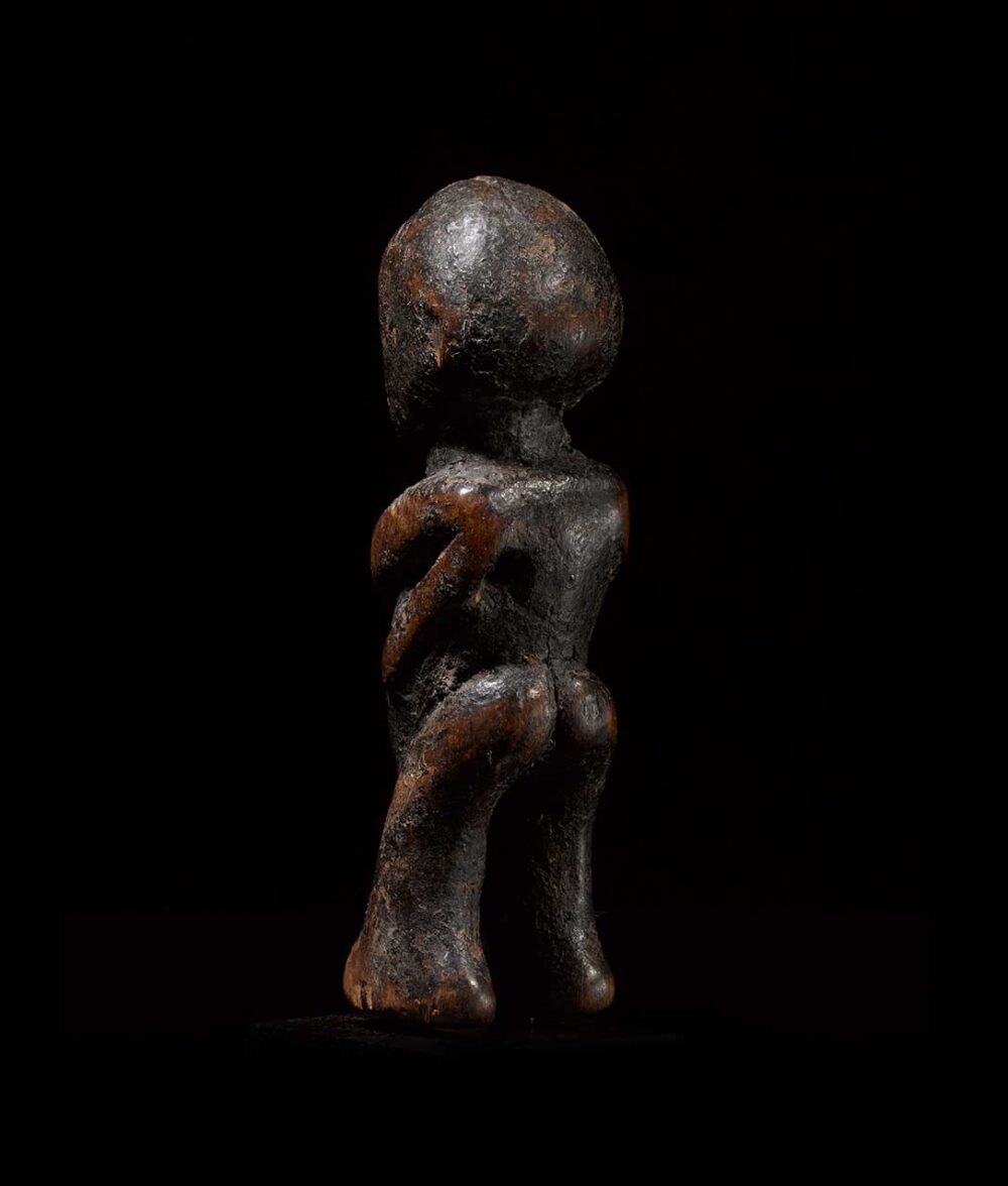 When a Lobi travels beyond his village, especially to areas in the bush between villages, they become vulnerable to attack by malevolent kotee spirits. As defense the Lobi carry talismans to protect themselves. This example was most likely worn, evident from the small distressed piercing found under its left shoulder; where a cord would have been strung through it.