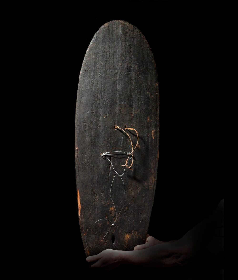In warfare, shields were often adorned with vibrant colors and striking designs, serving not only as a practical means of protection but also as a symbol of the warrior’s power and prestige. In a group of Anga warriors fighting in the same battle, one can observe various types of shields. Some are decorated with different ochres, while others remain plain. It is common to see the design of a shield matching the body decorations of the warrior carrying it. The shield before us boasts an ancient patina and remarkably preserved traces of its original pigment. There are two broken-off arrow tips embedded in the front of the shield, providing evidence that this shield was used in battle.