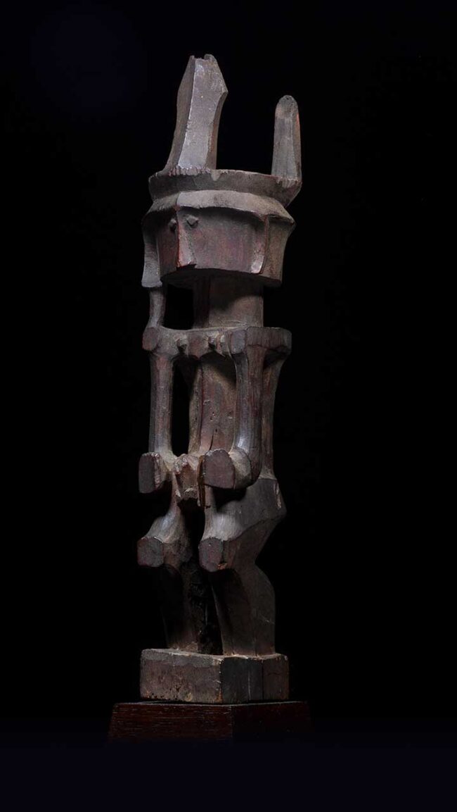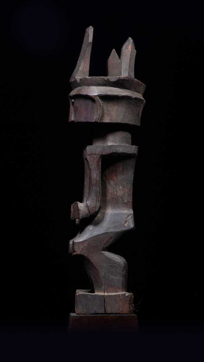 This Adu Zatua figure originated in the central region of Nias Island, Indonesia. Its distinct stylized, cubistic form and pronounced joint marks on the shoulders and knees set it apart. While Adu Zatua figures from central Nias feature a blocky, abstracted style with emphasis on geometric shapes and bold lines, those from North and South Nias lean towards a more naturalistic style, highlighting realistic human features and anatomical details. These stylistic differences can be attributed to cultural and historical factors. Historically, the central region of Nias remained isolated due to its rugged terrain, fostering art forms influenced by internal cultural and artistic traditions rather than external influences. Thus, the stylized, abstracted form of the Adu Zatua figure from central Nias reflects this insular artistic tradition. On the other hand, North and South Nias had more connections to the outside world through trade, allowing outside artistic styles and techniques to influence the more naturalistic Adu Zatua figures found in those regions. Traditionally, Adu Zatua figures were used in ancestor worship ceremonies and to communicate with the spirits of the dead. These figures were believed to possess the power to channel ancestral spirits, providing guidance and wisdom. The cubistic stylization of Adu Zatua figures from central Nias aimed to bridge the physical world with the spiritual realm. By emphasizing bold shapes and abstract forms, the carvers infused these figures with otherworldliness and mystery. Consequently, the figures became powerful symbols of Nias culture and artistic traditions.
