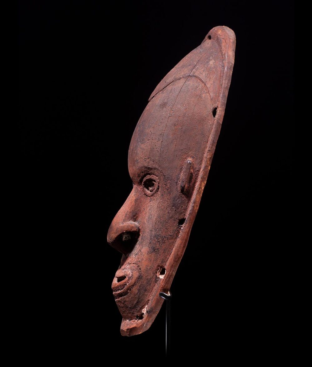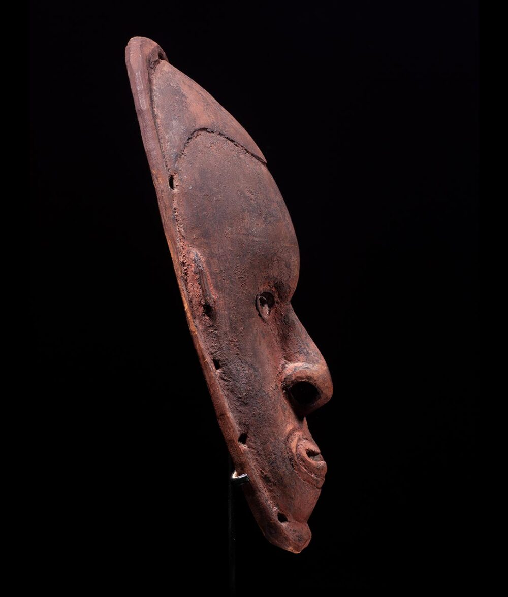 This is a remarkable and deeply expressive Murik Lakes mask, boasting a distinguished provenance and an illustrious exhibition history. Its significance is heightened by its early acquisition in the 1900s by Louis Ledoux, followed by its ownership by Rene d’Harnoncourt, the former director of The Museum of Modern Art in New York. Furthermore, it gained exposure at the historic and momentous 1946 exhibition “Art of the South Seas,” organized by d’Harnoncourt.Carved meticulously without the use of non-metal tools, this ancient mask stands as a true archetype. The visage exudes a commanding presence, created with exceptional precision and symmetry. Notably, the mask features perforations around the rim for attachment, along with a pierced septum, which are crucial characteristics in Oceanic art. The patina adorning this mask tells the tale of generations of use, having an encrusted and aged surface and patina. Astonishingly, the original red ochre pigment still blankets the surface in excellent condition.