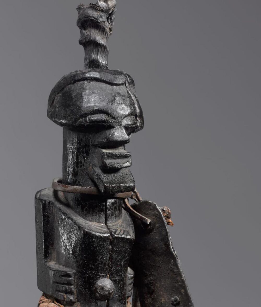 Presenting this exquisite miniature Songye figure, believed to have served as a personal protective charm, or possibly gracing larger village fetishes to augment their power or draw strength from them. This remarkable carving showcases the classic half-figure style, adorned with several cavities designed to hold ‘bilongo’ material, believed to be imbued with magical properties by the village’s revered Nganga shaman. The conception of this stunning piece features a beautiful classic half-figure form, showcasing an expressive “cubist style” face and gracefully positioned arms with hands resting at its waist. Adding to its allure, the aged leather wrap around its waist has seemingly melded together over time, bearing witness to the passage of ages. The patina on this figure is truly exceptional, enriched with the long-cherished application of palm oil over decades. When subjected to heat, this figure will ooze oil. Further enhancing its enchantment, the head of the figure retains remnants of the magical substances once held within its original dyker horn. On its sides, you’ll find metal attachments resembling a miniature gong and beaters, adding to the intricate details and cultural significance of this artifact.