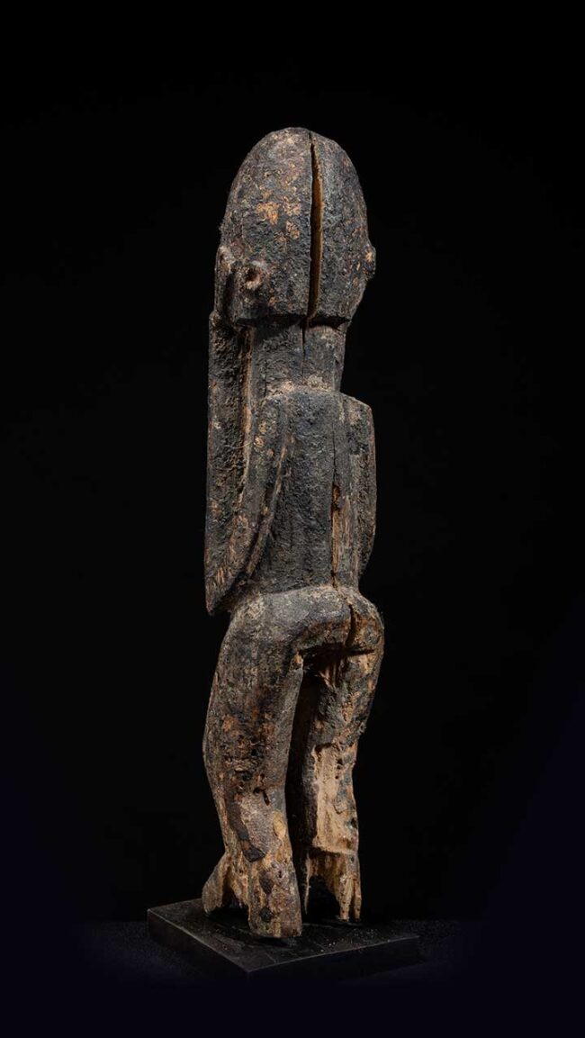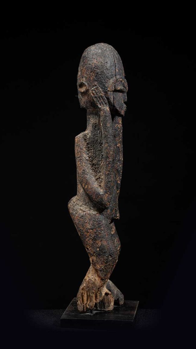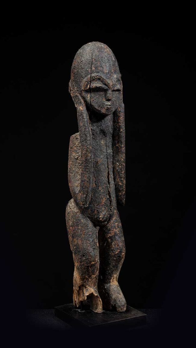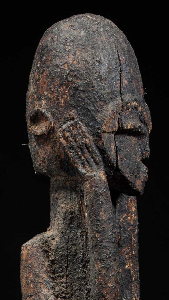 Introducing a wonderful bateba figure, proudly standing on sturdy and powerful legs, meticulously sculpted by the skilled hand of a recognized artisan. With a remarkable eye for detail, this sculpture boasts a naturalistic face adorned with exquisitely carved features, notably its raised oval-shaped eyes and gently protruding lips. The elongated arms gracefully extend, their hands tenderly cradling the sides of the figure’s face, evoking a profound sense of pathos and emotion. Crafted from hardwood, this figure exudes an aura of time-honored authenticity, owing to the deep and aged encrusted patina earned through decades of sacred libations and reverential ritual use.