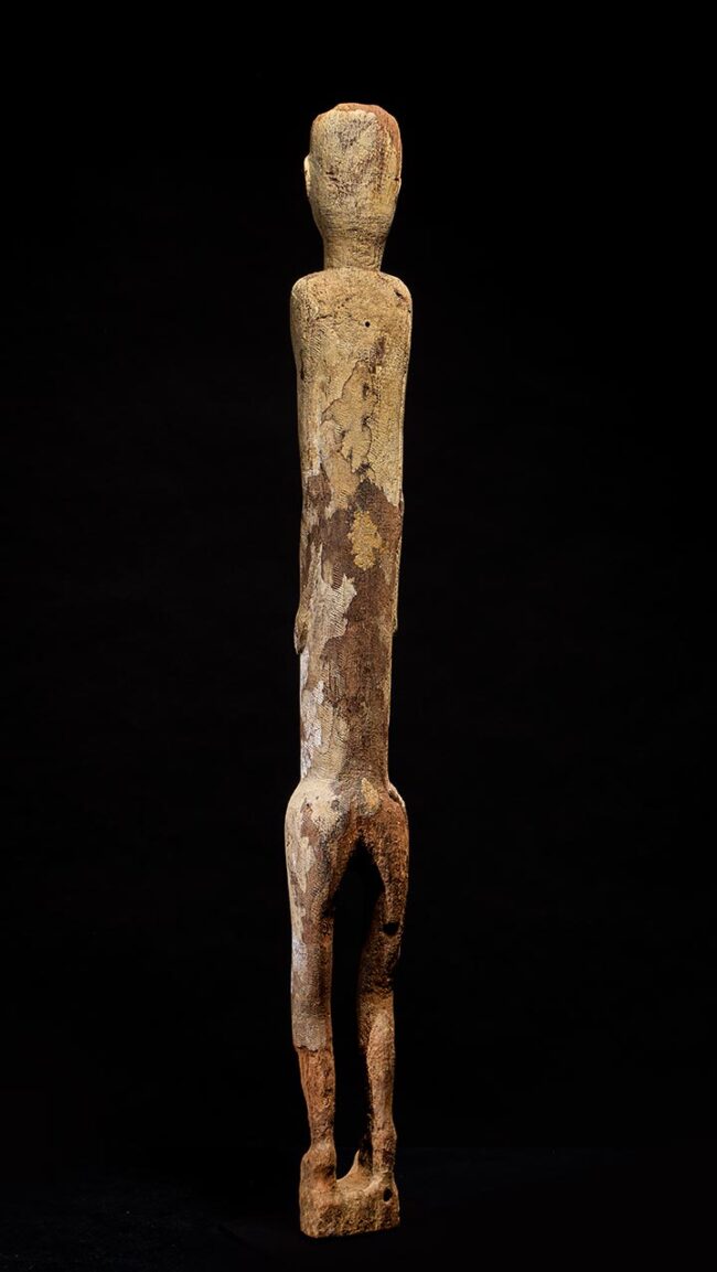 The Hampatong is a carved wooden ancestor figure revered by the Dayak people of Borneo. This male Hampatong is notable for its diminutive yet expressive face, which exudes a sublime expression. Inventive details include elongated arms that gracefully hang down along its torso, each adorned with claw-like fingers. Its slightly flexed legs and elongated body evoke comparisons to the iconic sculptures of Alberto Giacometti. The patina is exceptional, featuring deep weathering in areas and deposits of white lichen that impart a stone-like appearance to the figure.