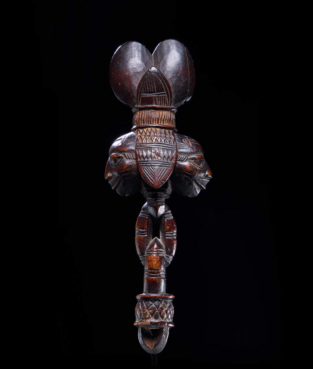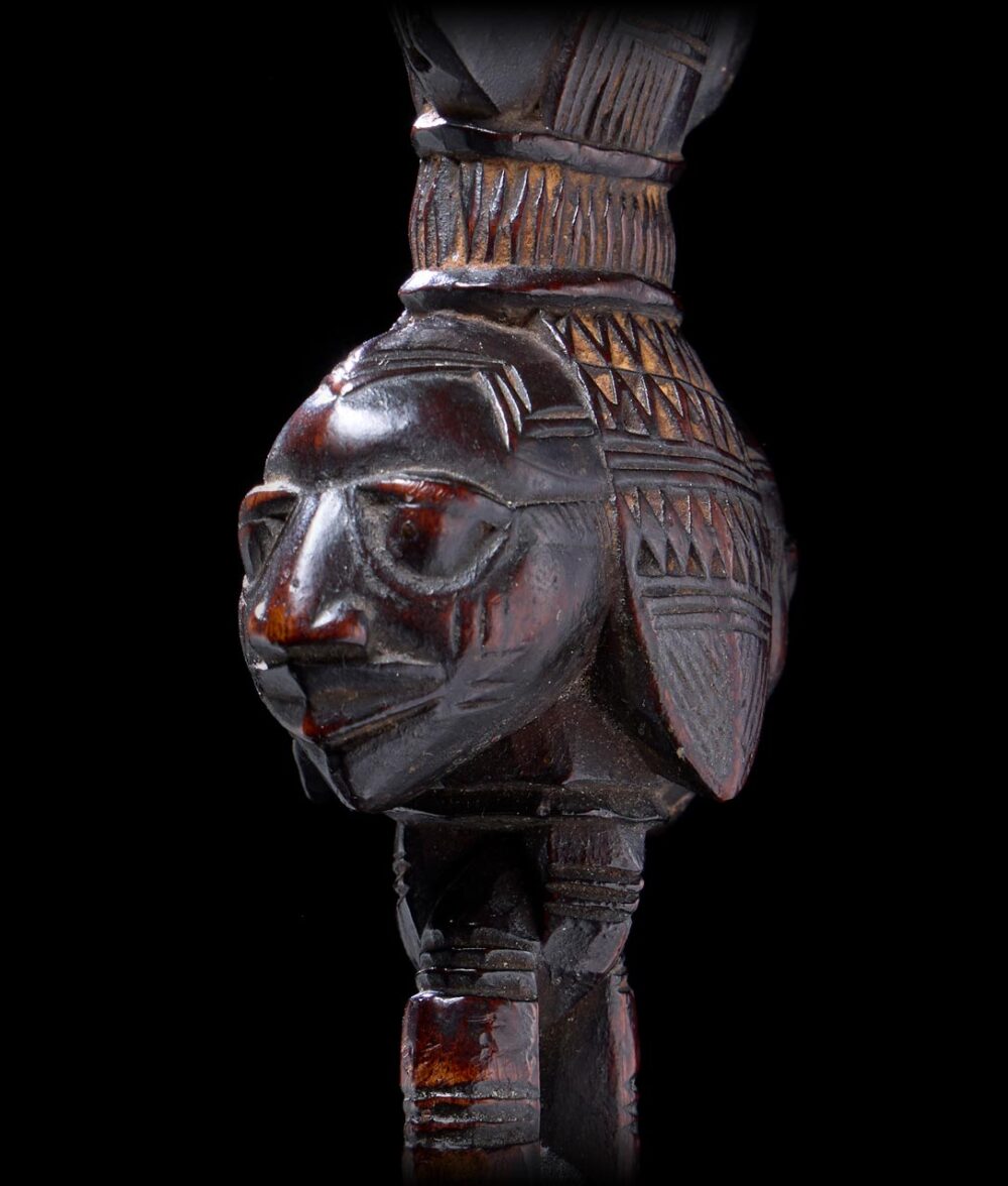 This staff or wand is called ‘Shango’ by the Yoruba people referencing the god it symbolizes. The sculptor was commissioned to create a version with Janus heads most likely giving it an ‘all seeing’ purpose or power. From all angles this object impresses but the two sides with the heads in profile is especially strong; the heads have a slight downward casting look that gives this object a sense of elegance, balancing its bold aesthetic. Its handle is carved in the form of linked rings adding another element of beauty to the sculpture. Its in excellent condition and it exhibits a varied deep and dark brown patina. An extremely similar example, most likely carved by the same carver is in the collection of the Metropolitan Museum of Art, Accession Number: 1989.391.1.