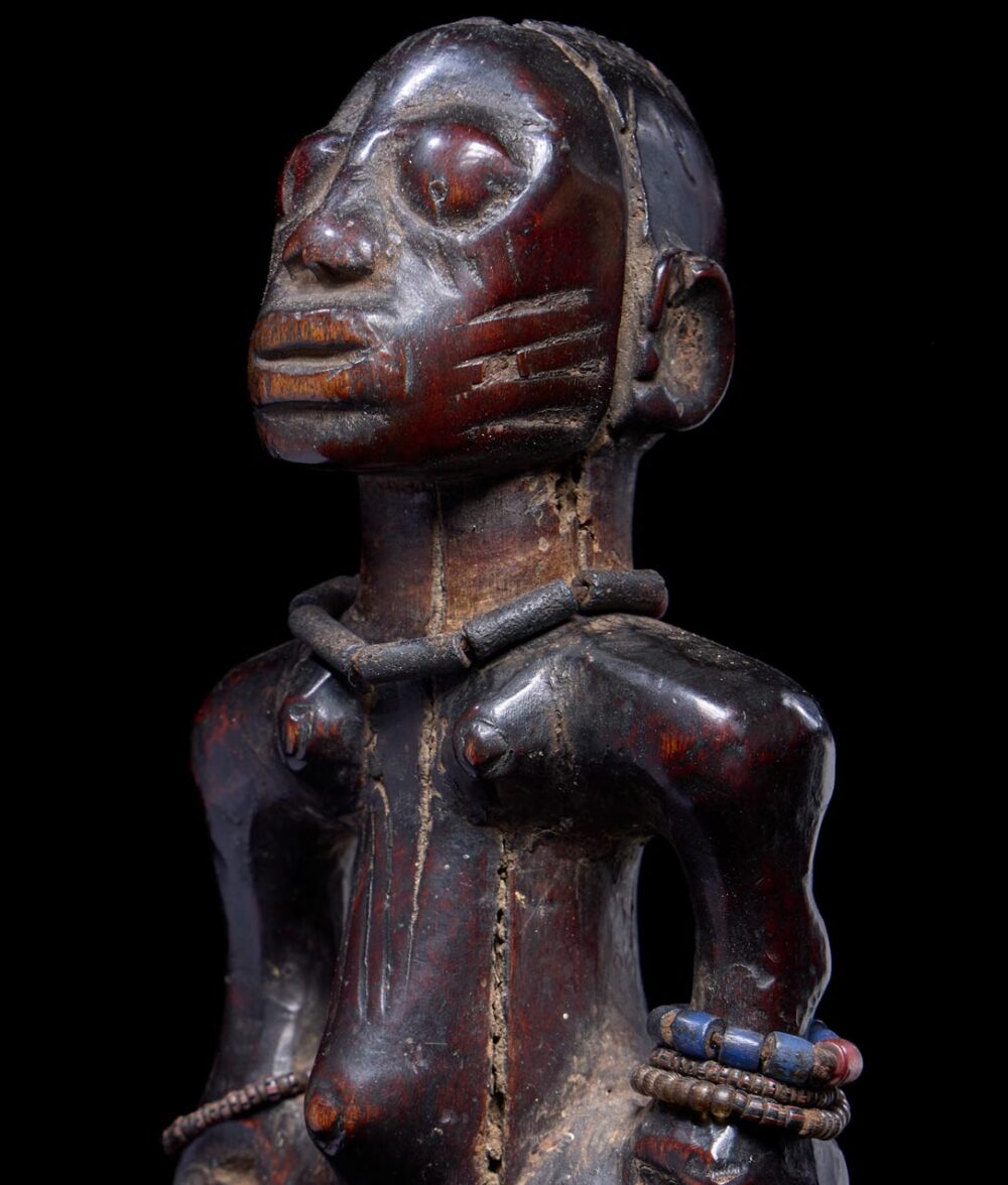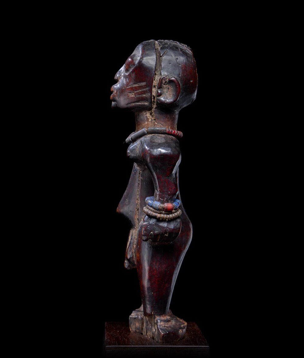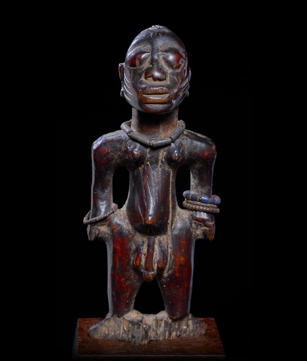 In Yoruba culture, twins are believed to have special powers, and if one dies, a figure is carved for the spirit to inhabit. These figures, known as Ibeji, are cared for and honored by the surviving family who ritually feeds, bathes, and clothes the figure. This Ibeji figure is heavily worn, with distinct facial features that are naturalistically carved, adding a sense of realism to the figure. Its arms are flexed and terminate on the figure’s hips with oversized hands. The sculpture is also decorated with beaded jewelry. The rich patina on the figure is due to heavy handling by the family, which has been caring for it for generations. This patina adds to the figure’s visual appeal.