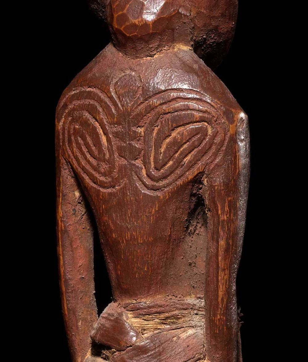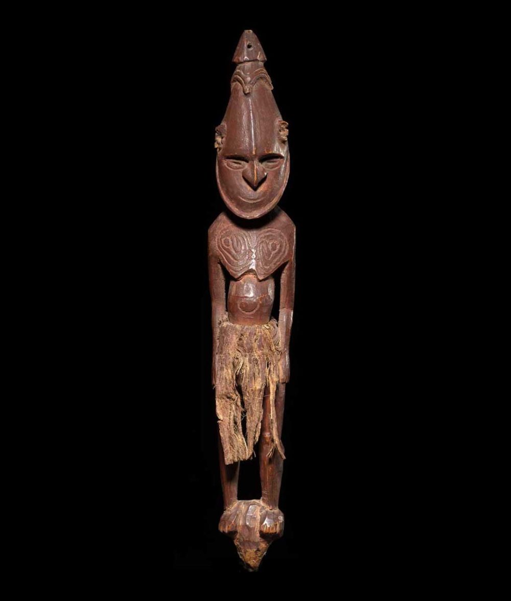This very fine ancestor figure is a wonderful example of Murik Lakes art. Carved from hardwood it has tremendous amounts of detail. The face possesses great expression in addition to a body that has deep circular scarifications that brilliantly depict an abstracted face on the torso. The figure has been rubbed with red organic pigments and the texture of the carving suggests it was created with non-metal tools. Amazingly, the fiber skirt has a deep worn patina; which is quite rare; they are usually lost; this speaks to the excessive amount of handling and care this figure has endured throughout the decades it was used.