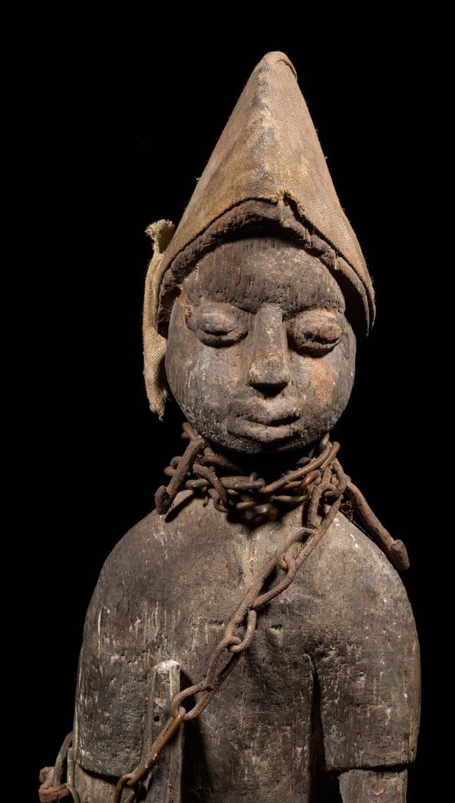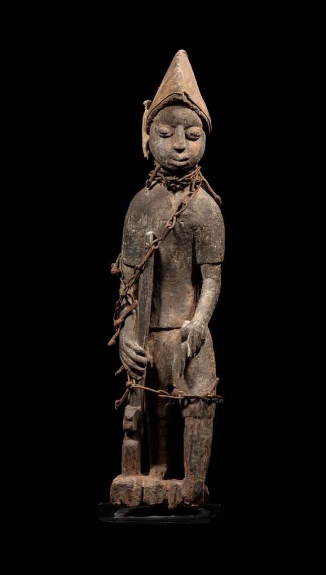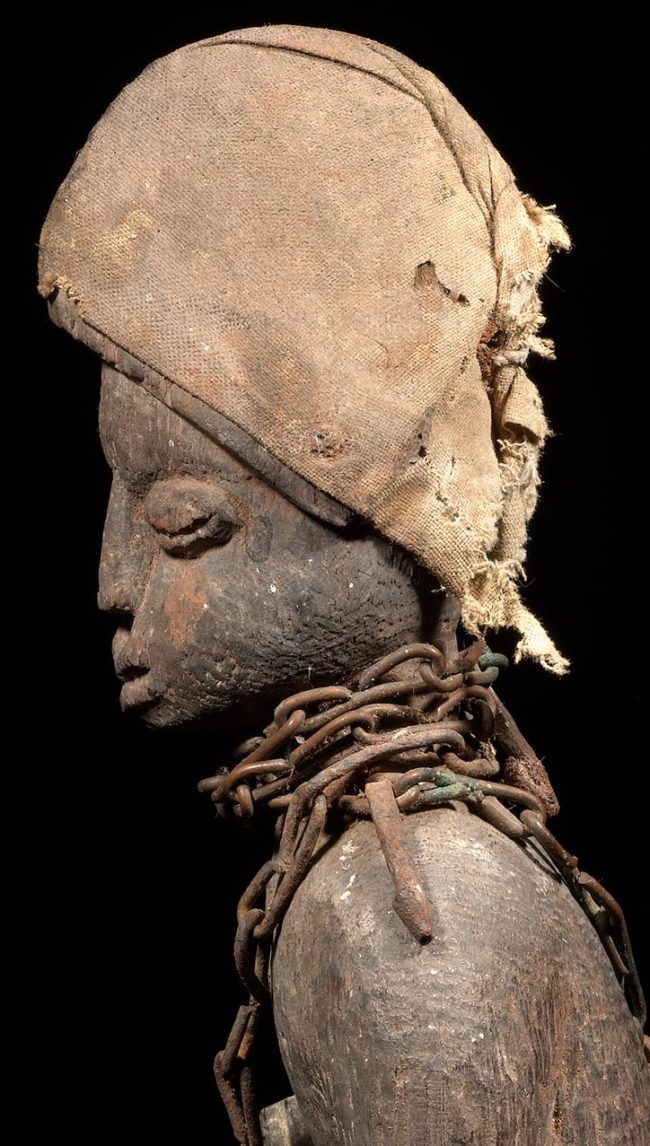 Shrine figures are important objects in the practice of Vodun. Wooden figures are heavily wrapped and bound in fetish material such as cloth and metal, empowering the object. This example is in the form of a hunter. Wearing a distinctive domed “hunters cap”, the figure is simply carved with naturalistic features. Grasping a rifle in his right hand and another hunting tool in the left, he gazes out, contemplative, but engaged. The figure stands with his right foot slightly forward of his left, suggesting movement. A rough metal chain is wrapped around the figure’s neck and body.