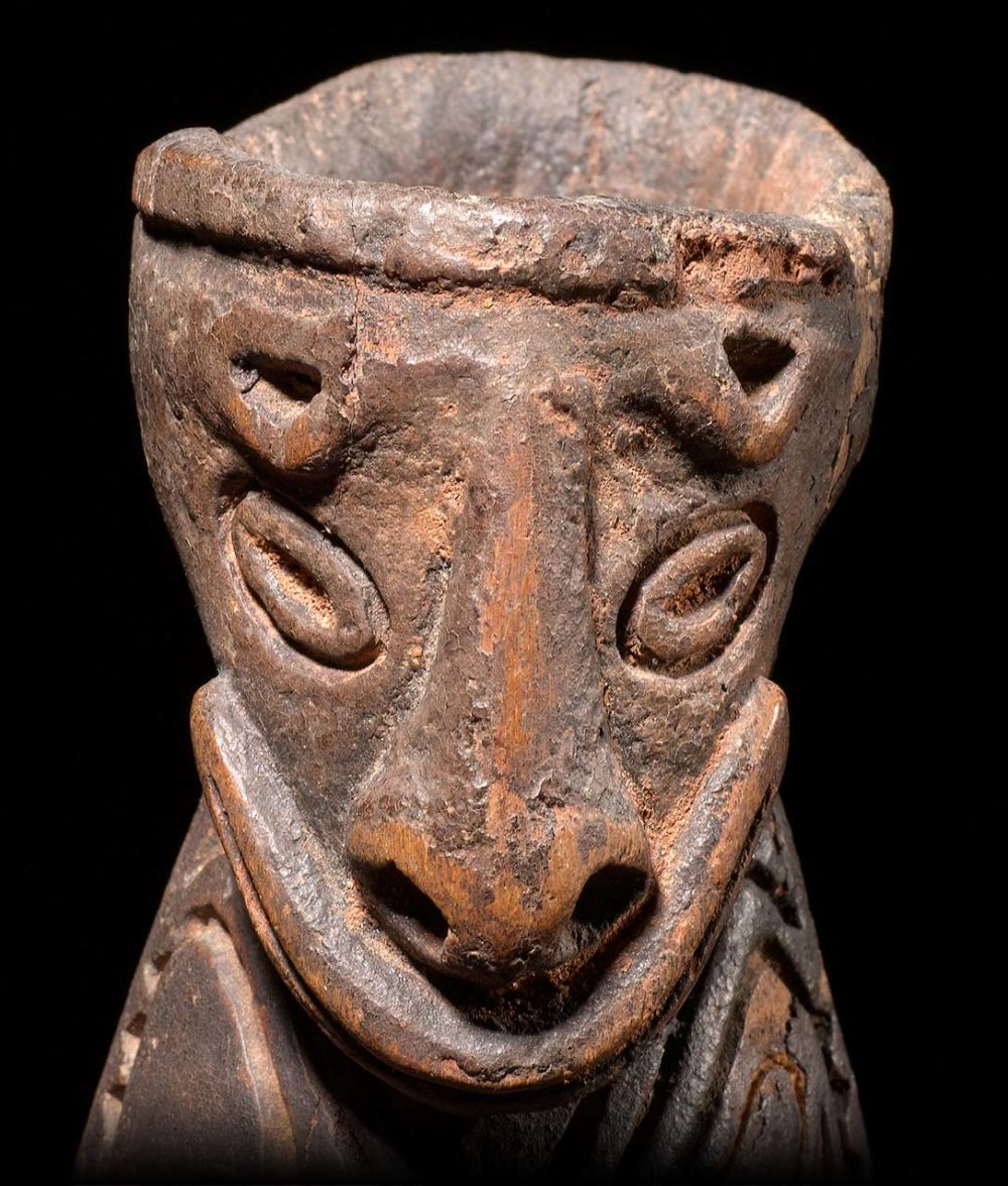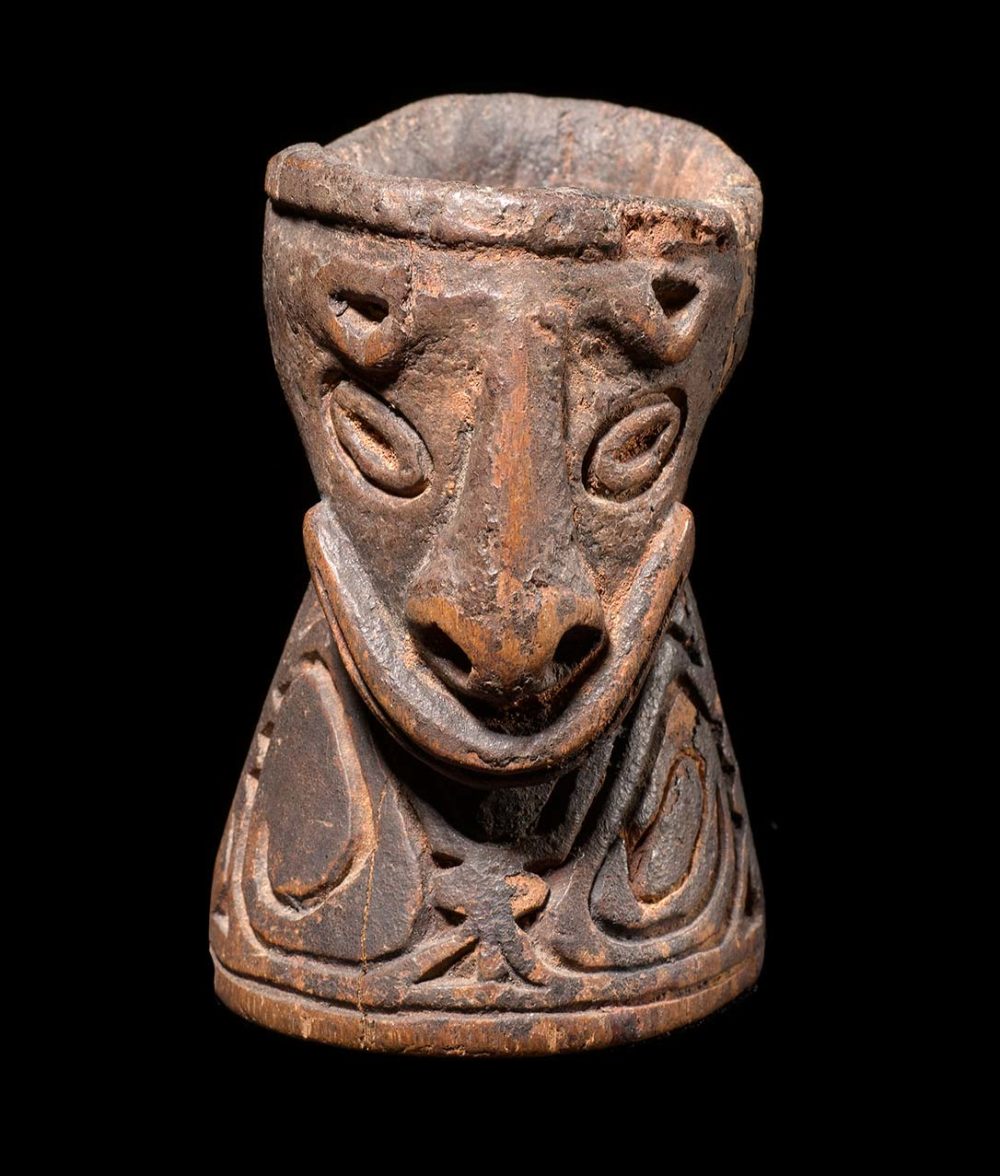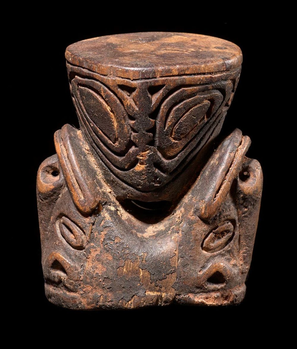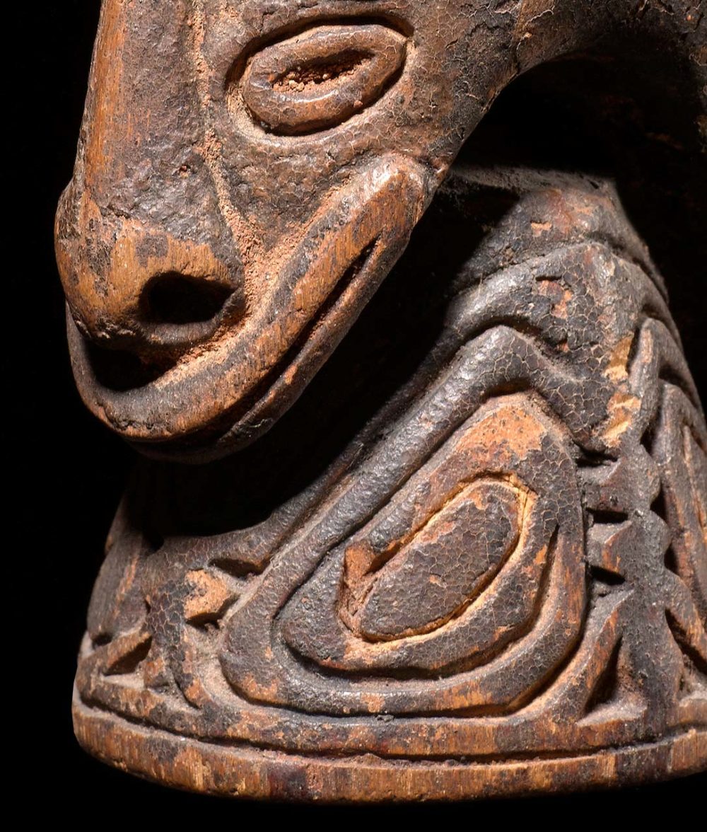 Wooden betel mortars are fairly common in New Guinea, but this one is special. It is stone carved, and has a wonderful handled encrusted surface with most of the red ochre pigment still intact. The cavity inside the mortar shows extensive signs of use. What really sets this piece apart is that it packs so much art into its small size. The two primary faces in Janus form are Flying Foxes. But holding this piece in one’s hand and turning it around and upside down reveals many other hidden faces.