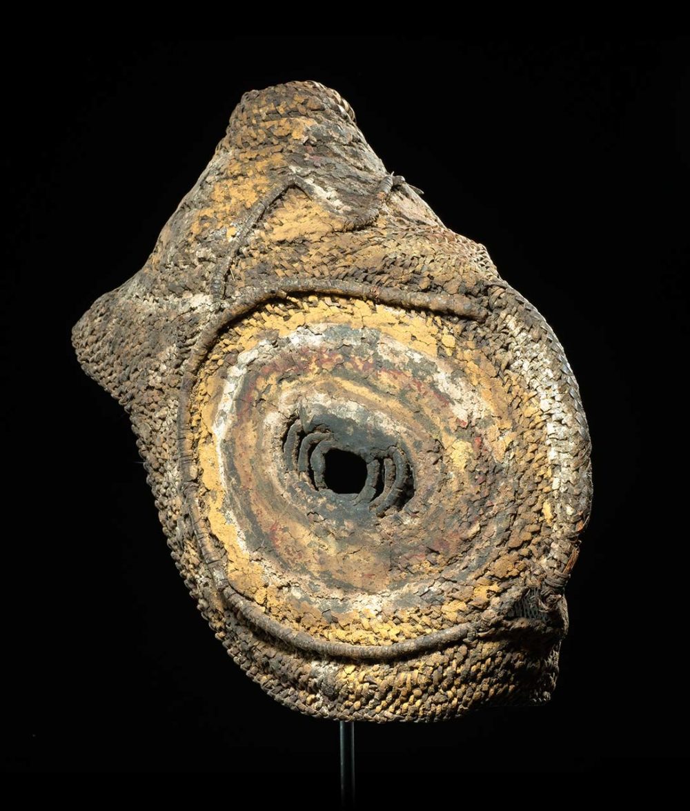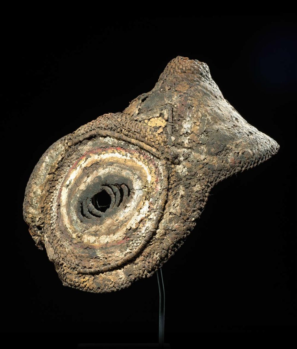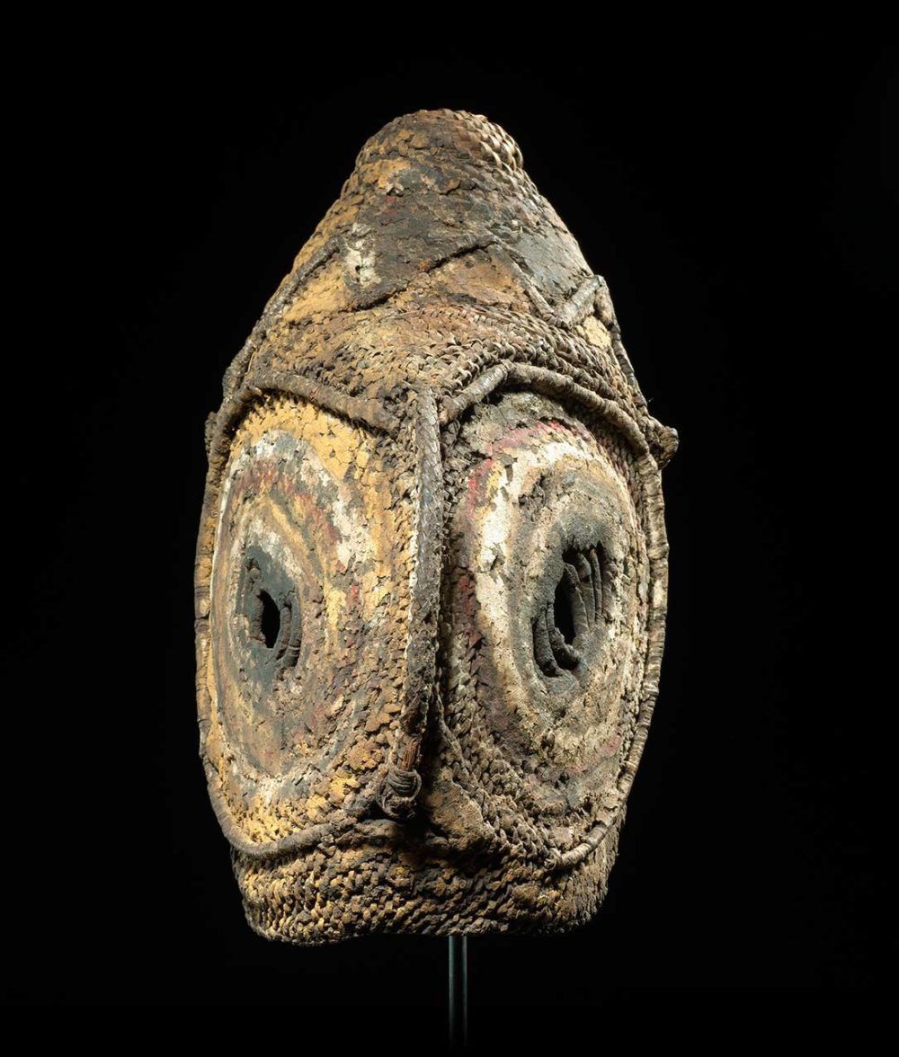 This woven cane mask from the Southern Abelam area was used to cover long yams during a ceremony to promote a productive agricultural season. Yams were named for a particular ancestral spirit, which is brought into being and represented by the mask’s decoration. The intricacy of the weave is still clearly seen on this particular mask, most notably at the top and along the zigzag patterning of the coiffure. Original red, yellow, and white pigments are visible on the mask’s façade. Not many masks of this age exist in such a complete condition, due to the fragile nature of the organic material used.