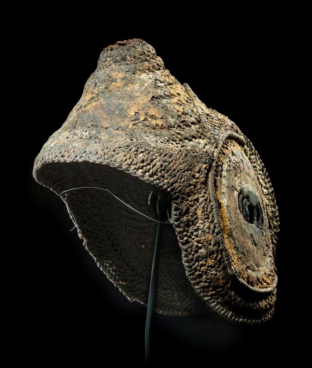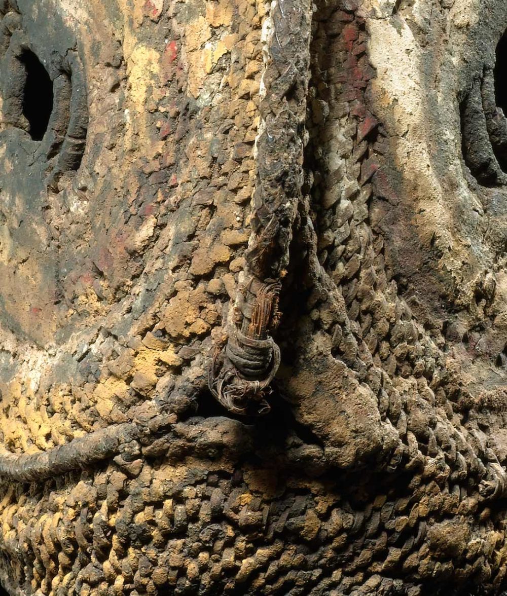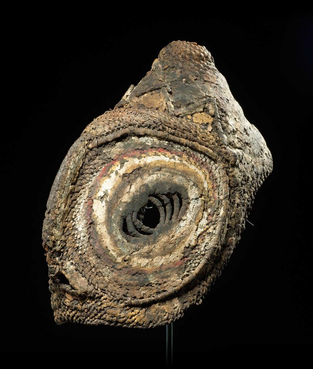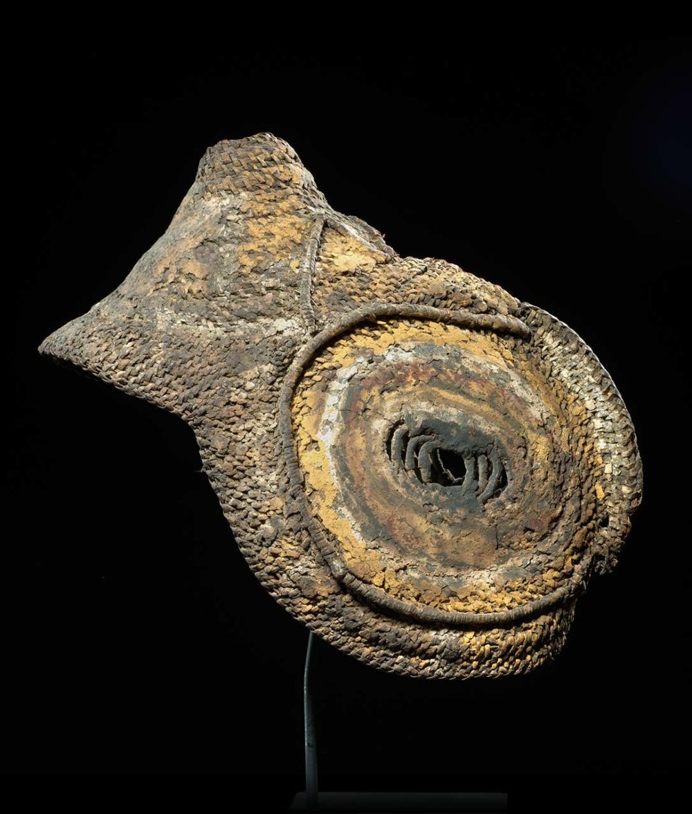 This woven cane mask from the Southern Abelam area was used to cover long yams during a ceremony to promote a productive agricultural season. Yams were named for a particular ancestral spirit, which is brought into being and represented by the mask’s decoration. The intricacy of the weave is still clearly seen on this particular mask, most notably at the top and along the zigzag patterning of the coiffure. Original red, yellow, and white pigments are visible on the mask’s façade. Not many masks of this age exist in such a complete condition, due to the fragile nature of the organic material used.
