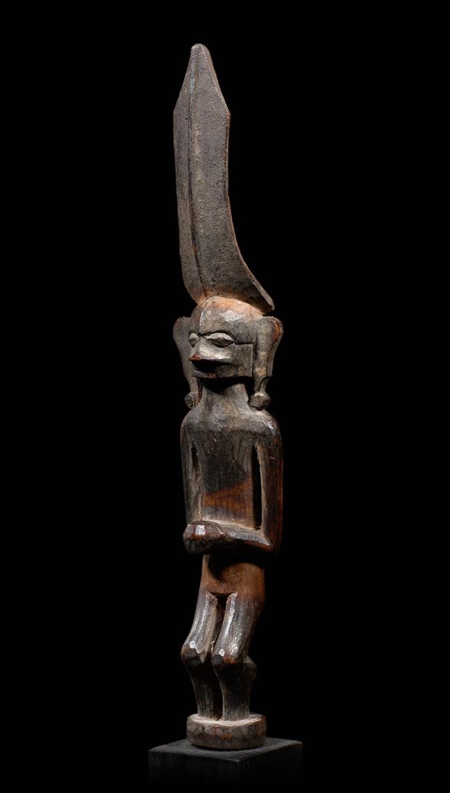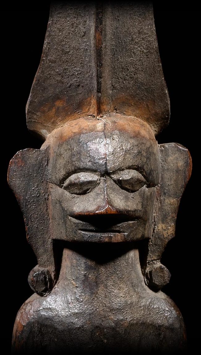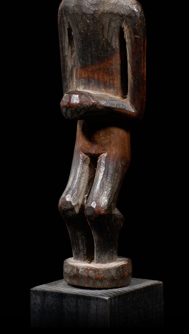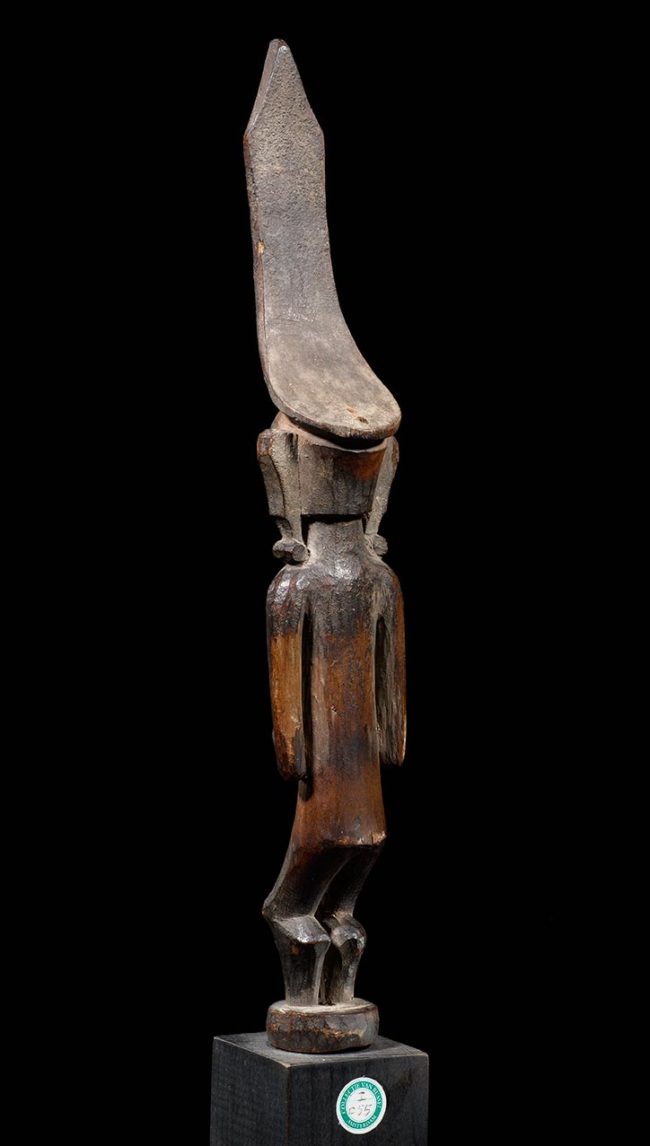 These sculptures represent the founding ancestors of important lineages in Nias society. Playing a vital role in daily life, the sculptures would have been present in each noble household, serving as a supernatural protector of the home. This example is an early rendition suggested by its archaic style. Depicted in a standing position and grasping a cup with both hands, the figure is adorned with a tall and elegant crown, a marker of its noble status, which would have been worn during major festivals. The varied patina is dark and encrusted; the lighter patinated areas on the figure are where trade cloth was originally wrapped around it.