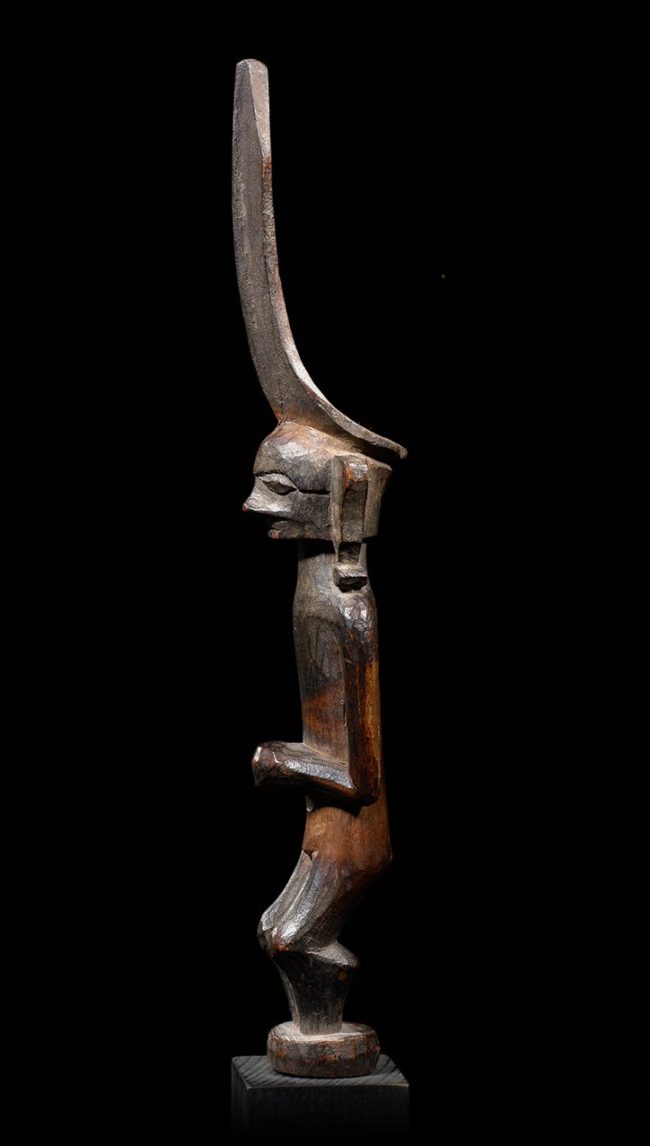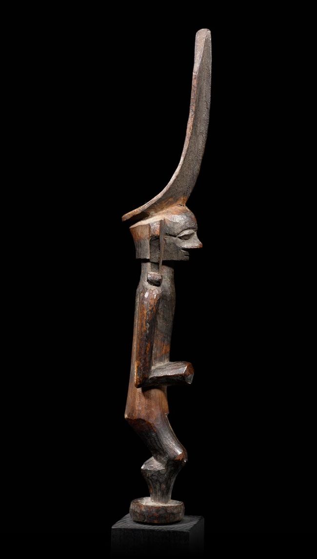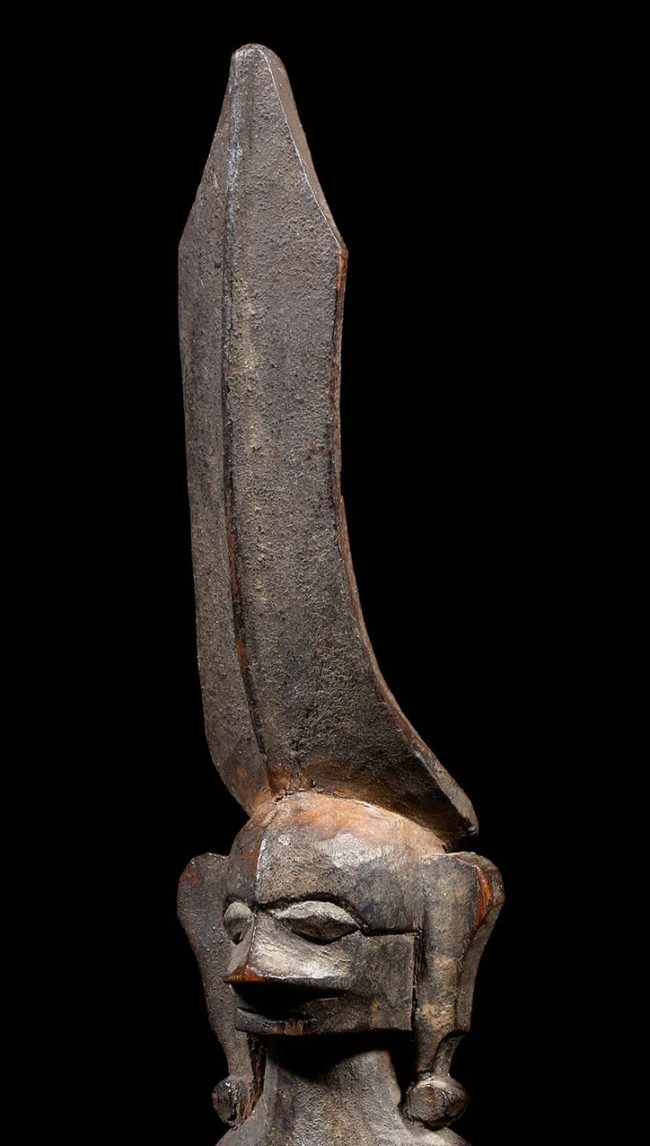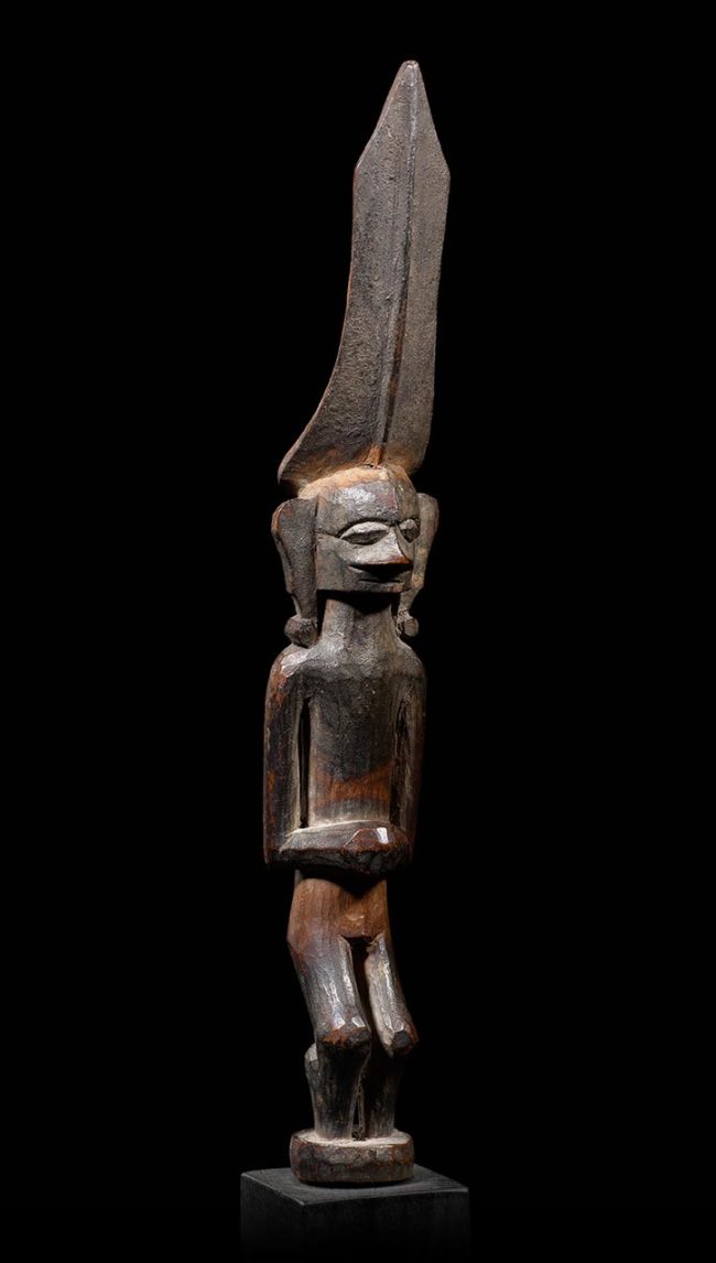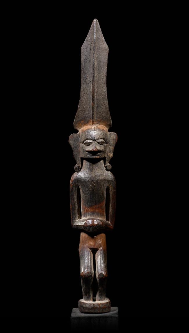 These sculptures represent the founding ancestors of important lineages in Nias society. Playing a vital role in daily life, the sculptures would have been present in each noble household, serving as a supernatural protector of the home. This example is an early rendition suggested by its archaic style. Depicted in a standing position and grasping a cup with both hands, the figure is adorned with a tall and elegant crown, a marker of its noble status, which would have been worn during major festivals. The varied patina is dark and encrusted; the lighter patinated areas on the figure are where trade cloth was originally wrapped around it.