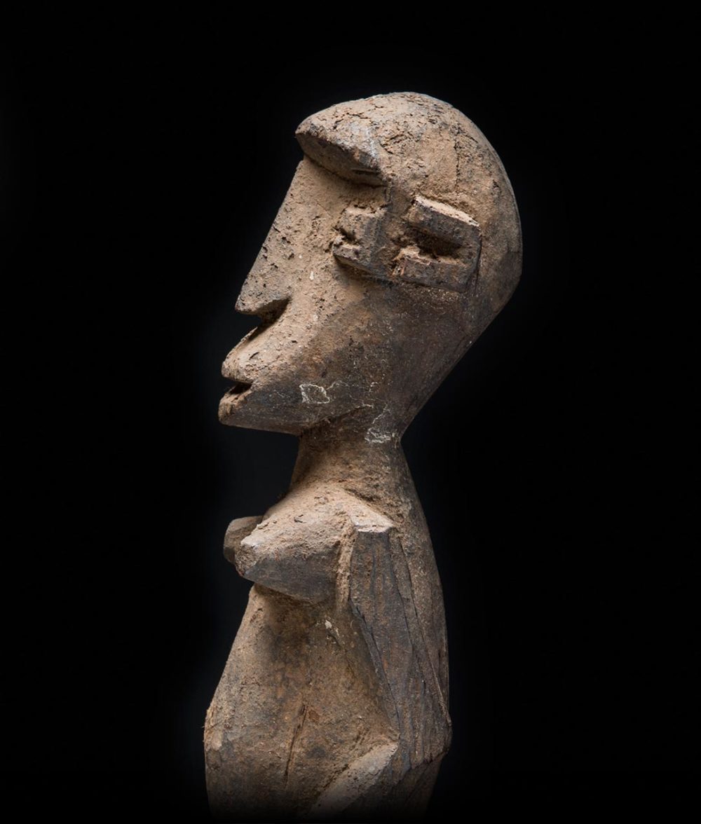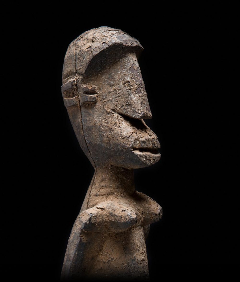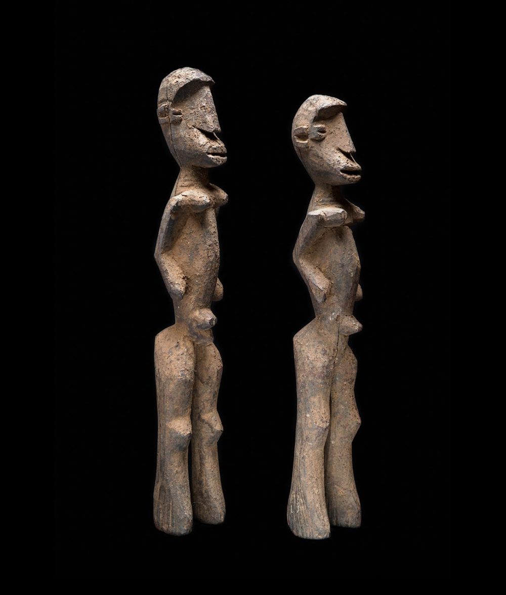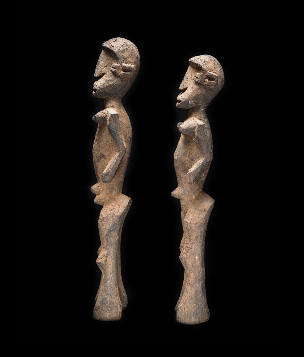 Produced in Burkina Faso, Bateba figures are paired sculptures used as protective agents. These enigmatic figures are not purely representational, but rather act as a spirit who protects the family and home. These two examples are carved with an intense symmetry. Similar attributes include wide set eyes and protruding partially open lips, while the frontal stance of both sculptures suggests a serene yet powerful presence.