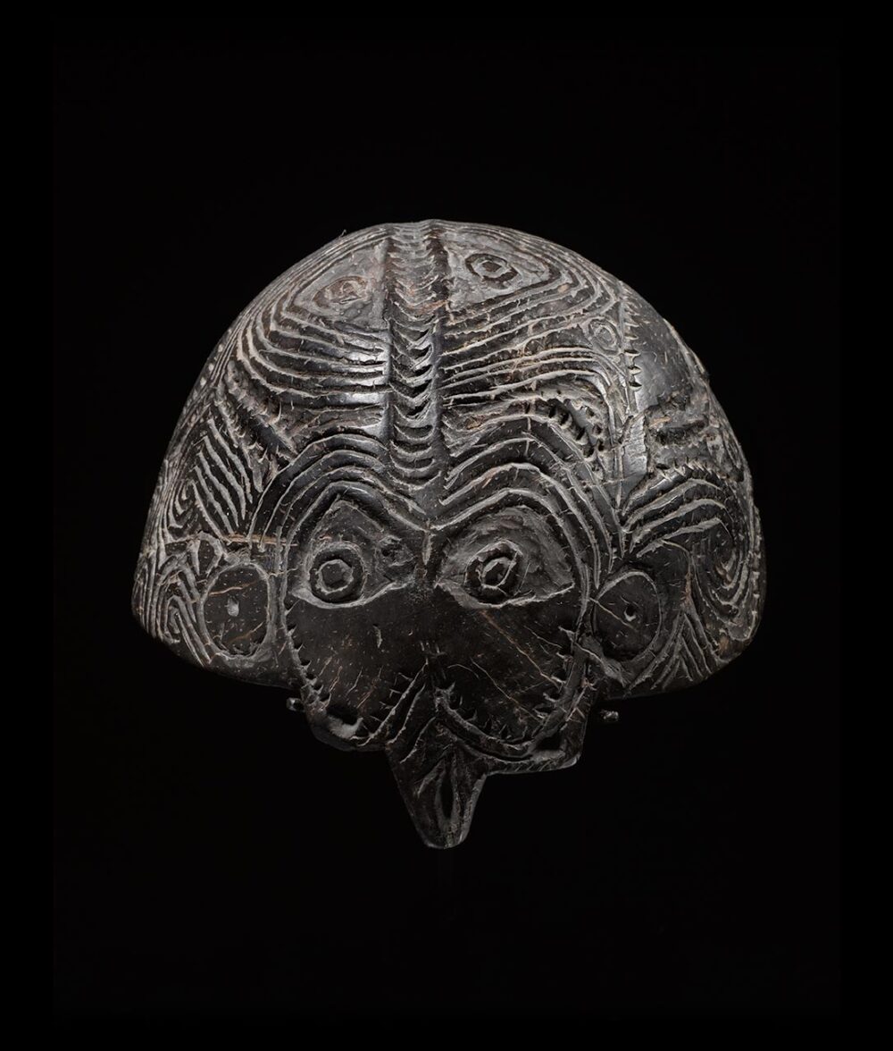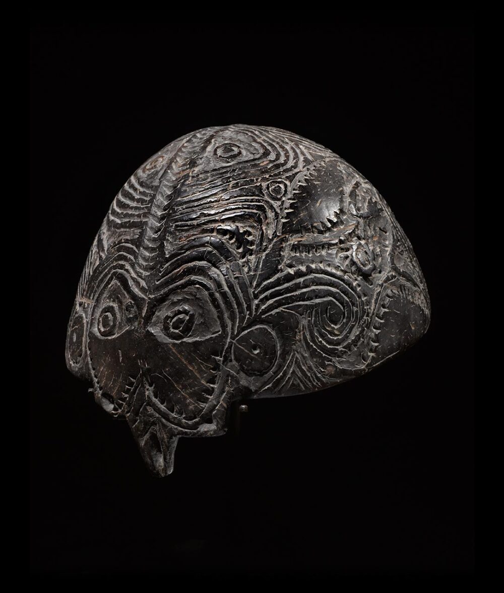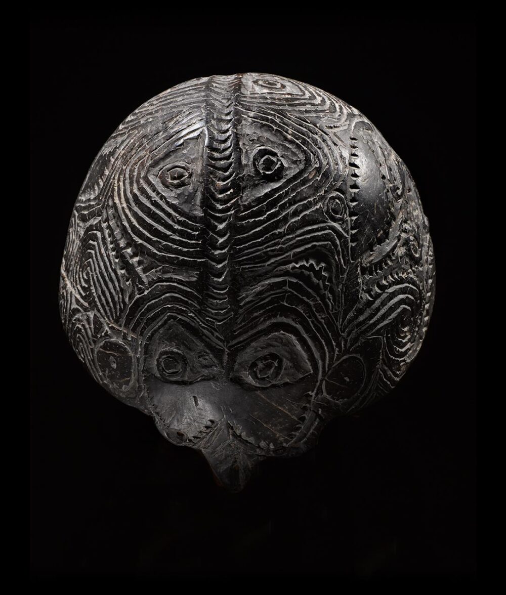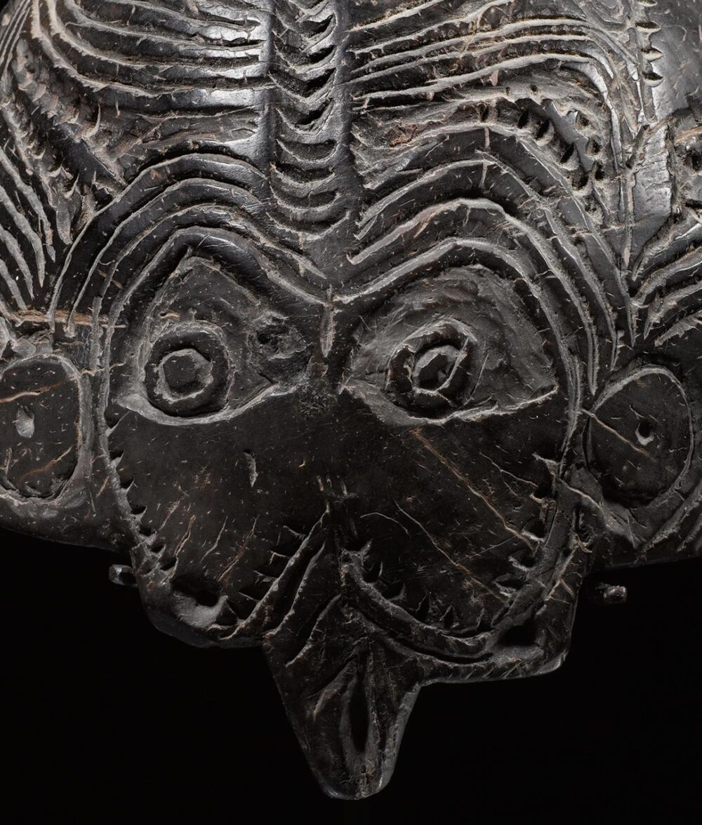 This drinking cup is made from a coconut shell and was most likely used by an important man within Abelam society. The cup is beautifully carved in complex raised relief motifs. A stylized human head is carved as the handle for this cup. Along the center ridge traversing the entire surface of the shell there are three additional carved abstracted faces. The surface is well worn and its aged patina has developed from extensive use and handling. Old drinking cups from Papua New Guinea are extremely rare.