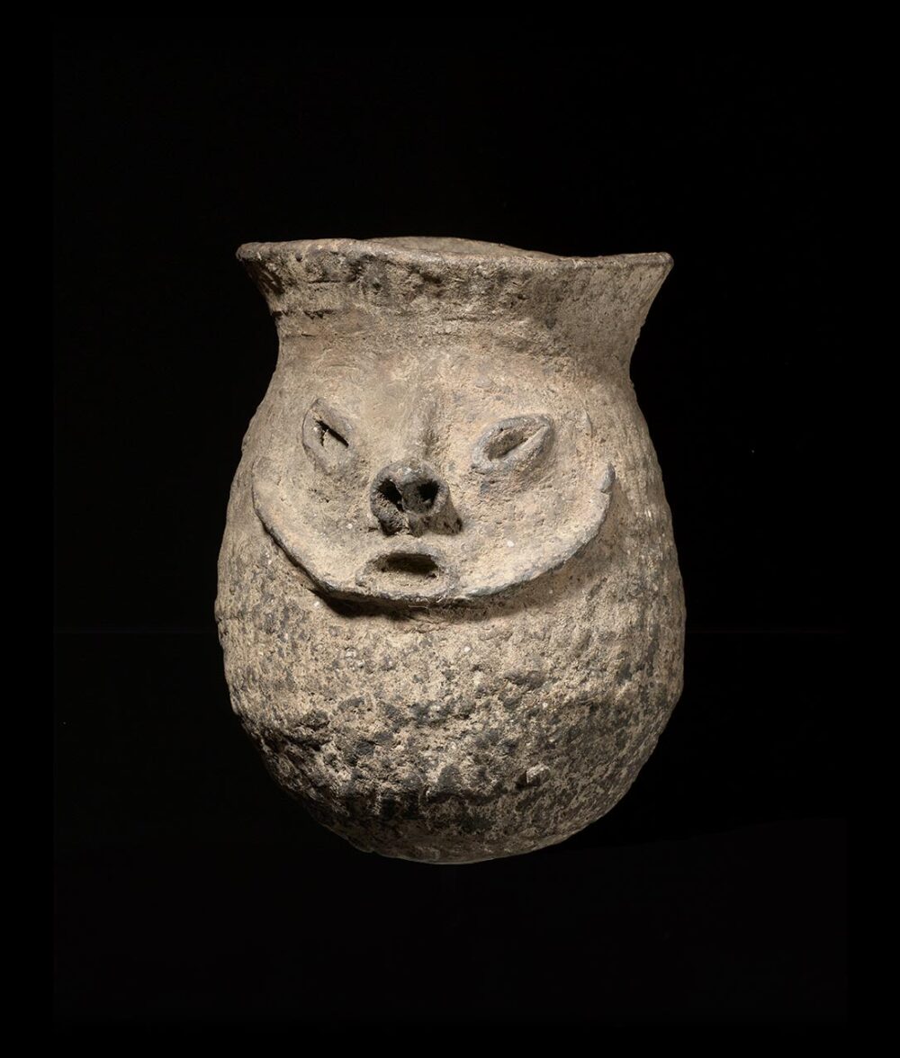 Pottery traditions proliferate in the northern mountainous regions of Papua New Guinea. This cooking pot, from the Boiken, is a fantastic example. The globular pot exhibits an indented neck and flared lip, a common characteristic of Boiken cooking and storage pots. The pot is not decorated except for a single human face, most likely representing an ancestral spirit. The face is striking; just the eyes, nose, mouth, and a raised line is carved to delineate the face from the body of the pot. Vessels are made using the coil technique and are then shaped by chip-carving when the surface is not quite dry. This leaves the bowls beautifully texturized, visible on this particular example. The pot is very old, a rare find.