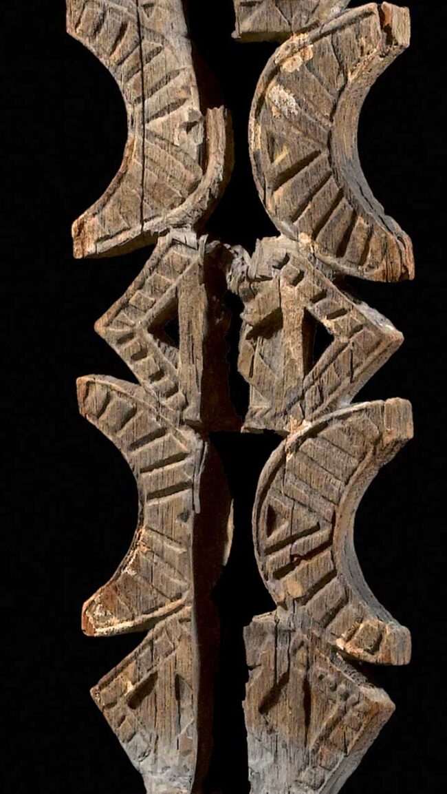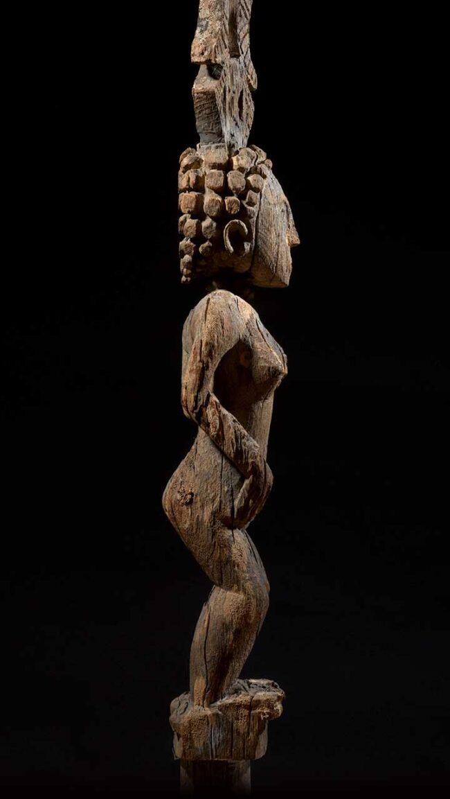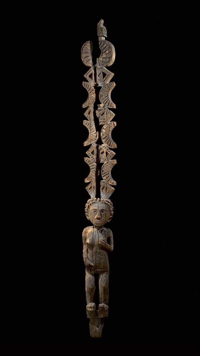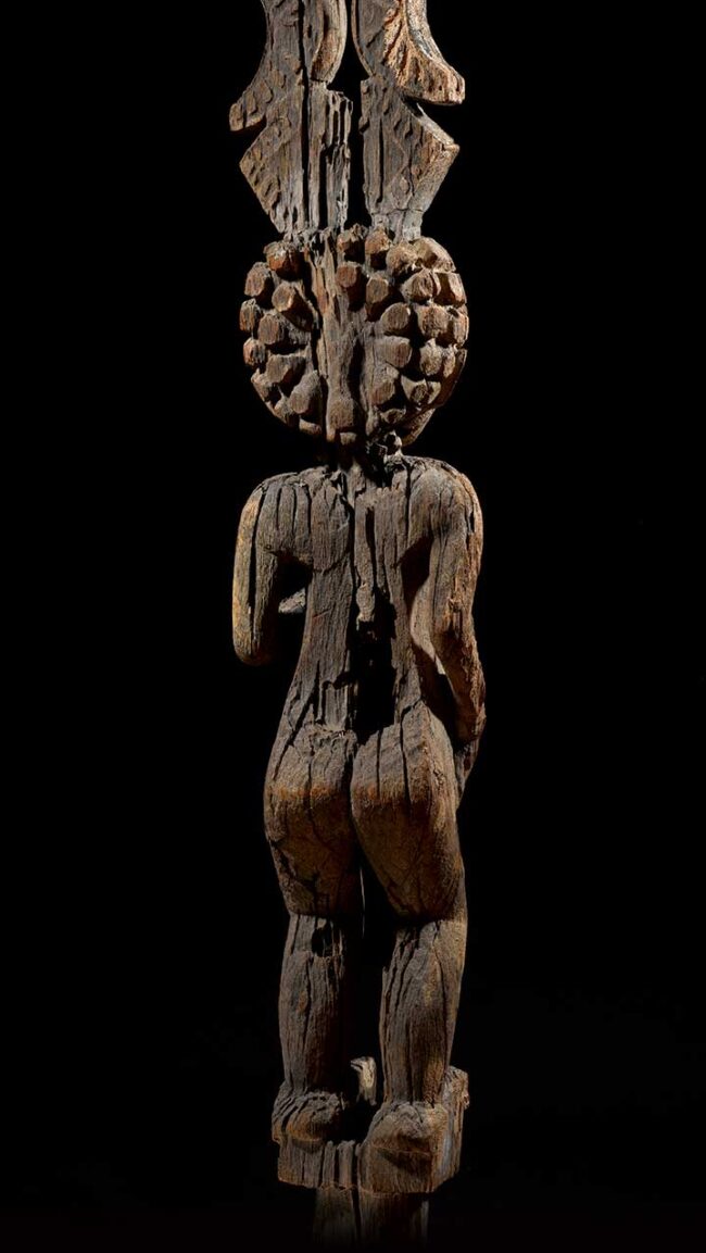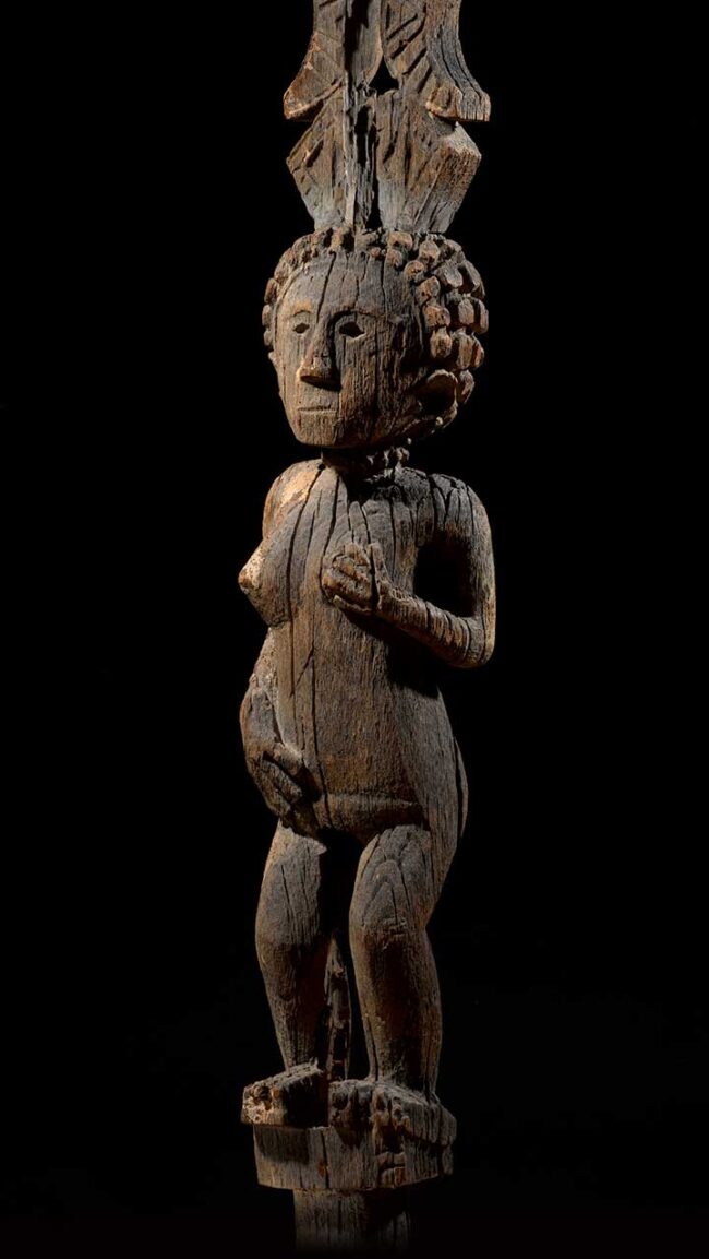 This monumental sculpture was created to commemorate an important female ancestor. She is depicted standing on a post with a tall oblong protrusion emerging from the crown of her head. The figure is superbly carved with a rounded face and richly curled coiffure, arched eyebrows and hollowed eyes. The high protrusion arising above the head is carved with geometric celestial symbols: moons, stylized stars and, on top, a sun with rays. Exceptionally hard wood, with a dry and gray weathered patina.