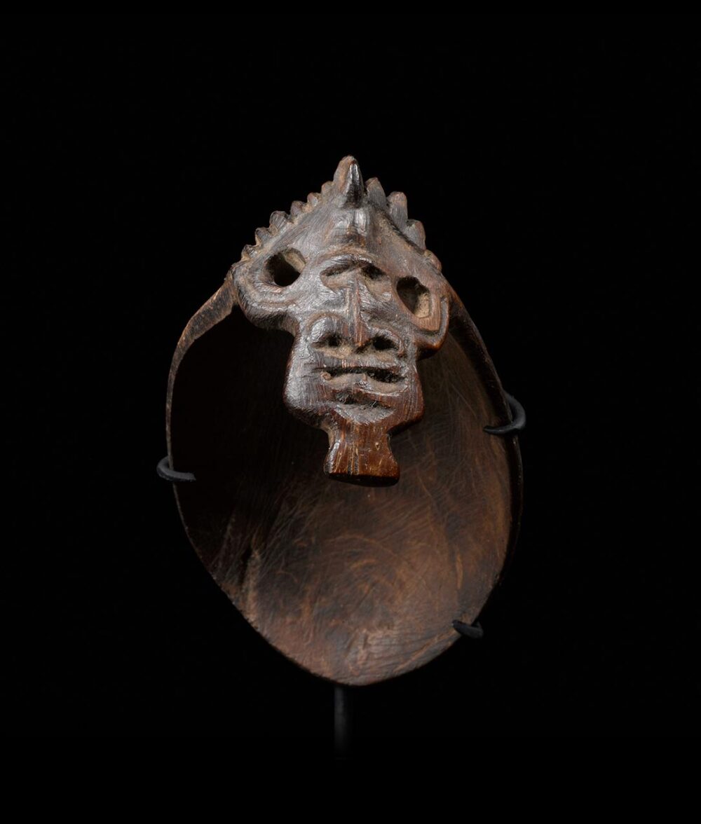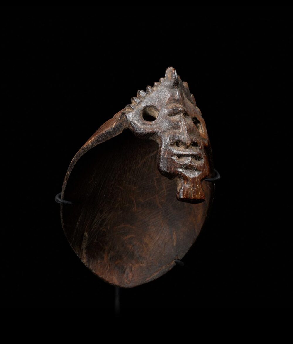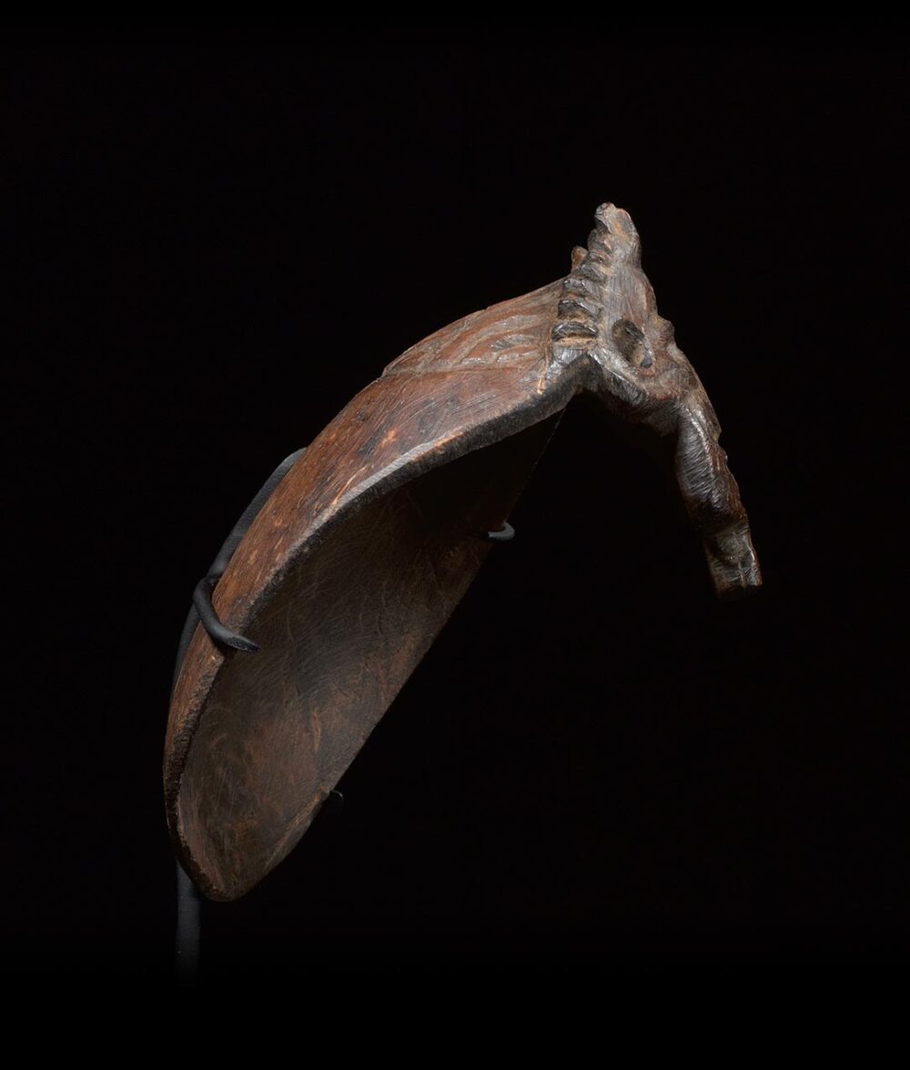 Made from a coconut shell, this spoon from the Azera is beautifully carved. Utilizing the natural shape of the coconut shell, the curvature of the spoon is especially sublime. The handle is the only part of the spoon that is decorated. The face has a refined naturalism and dark patina from use. Both its ears on the side of the face are pierced; where fiber attachments might have originally hung. The back of the handle is engraved with geometric patterns.