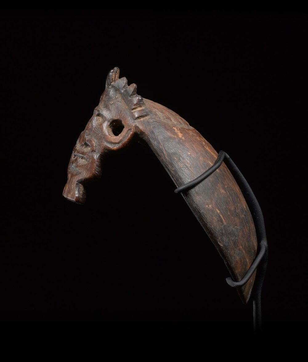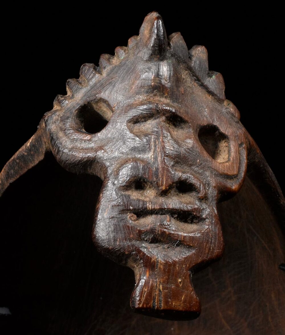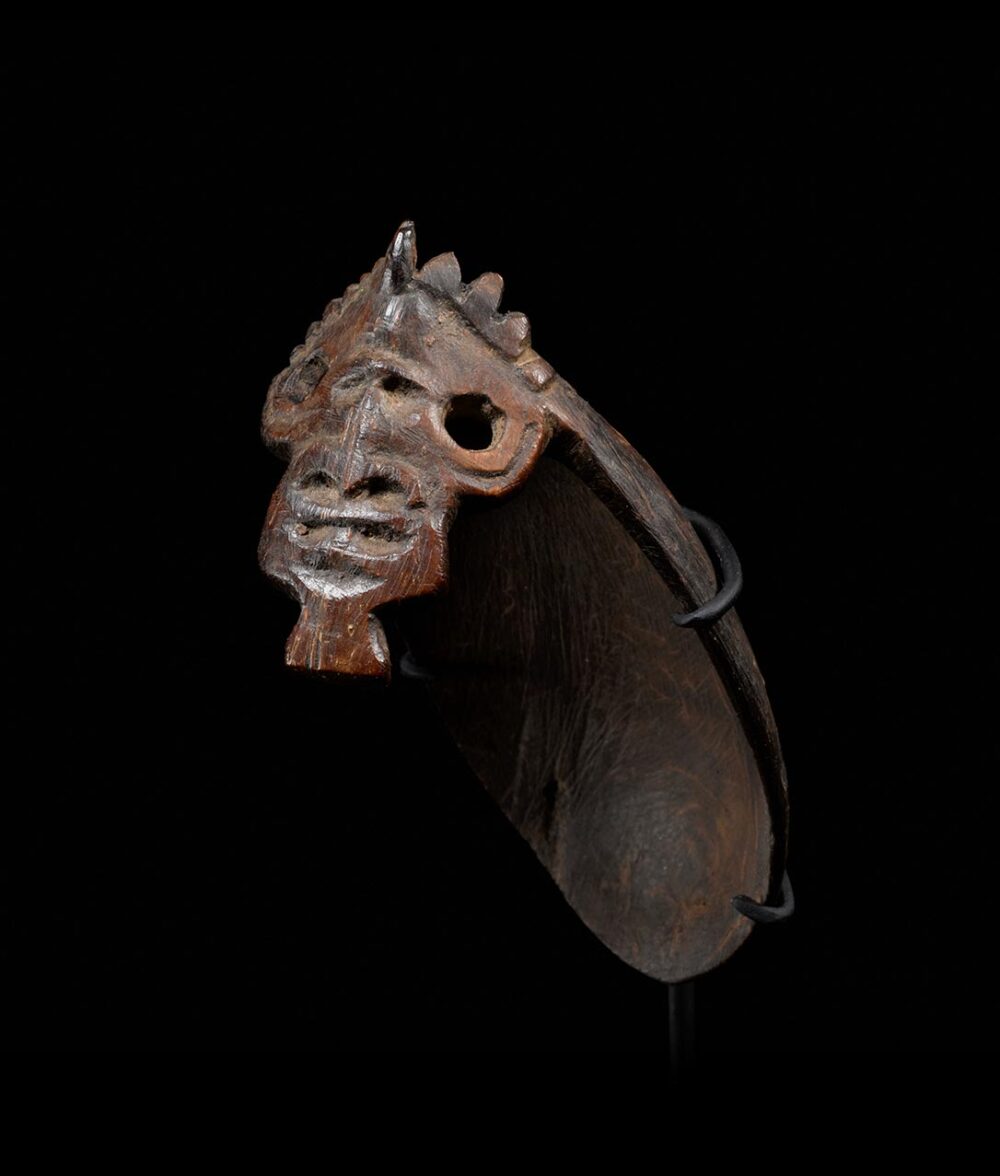 Made from a coconut shell, this spoon from the Azera is beautifully carved. Utilizing the natural shape of the coconut shell, the curvature of the spoon is especially sublime. The handle is the only part of the spoon that is decorated. The face has a refined naturalism and dark patina from use. Both its ears on the side of the face are pierced; where fiber attachments might have originally hung. The back of the handle is engraved with geometric patterns.