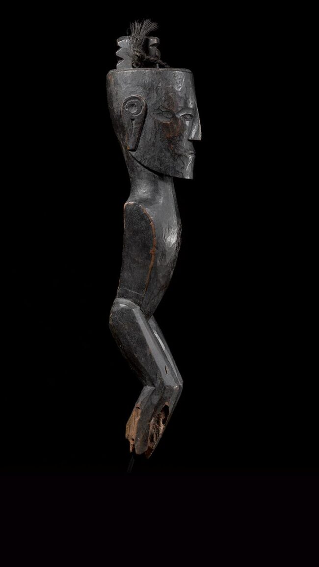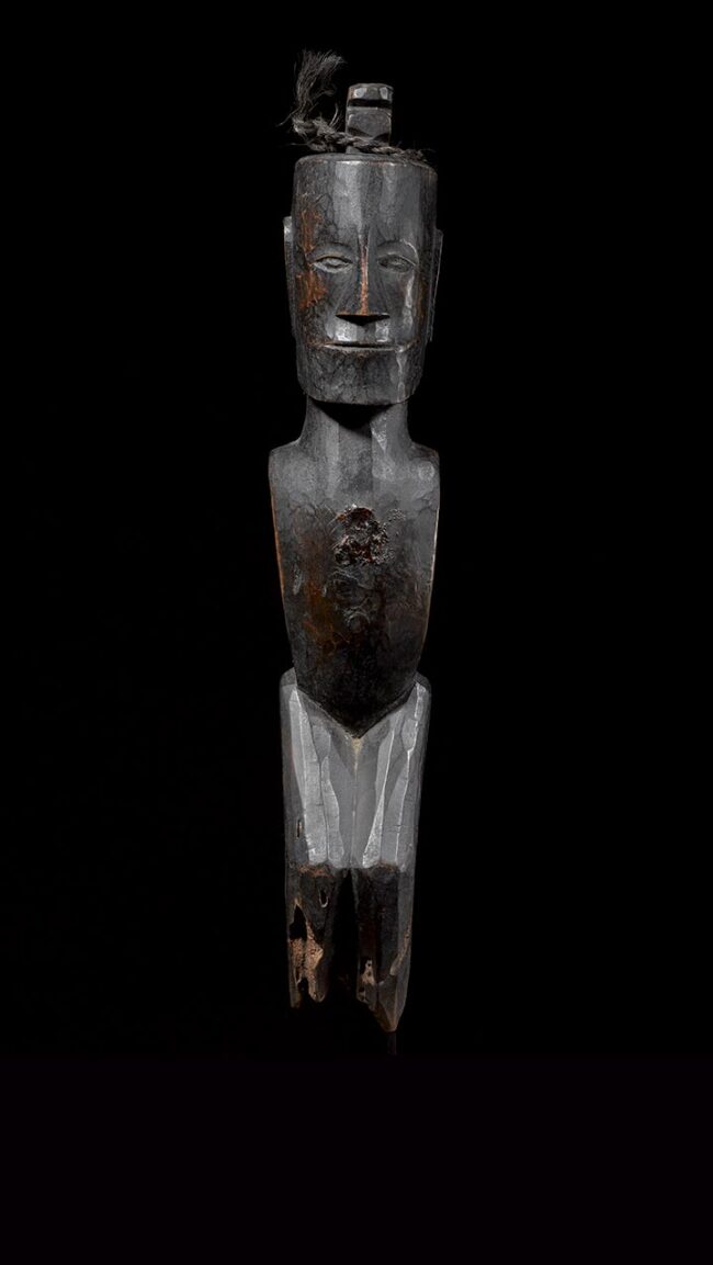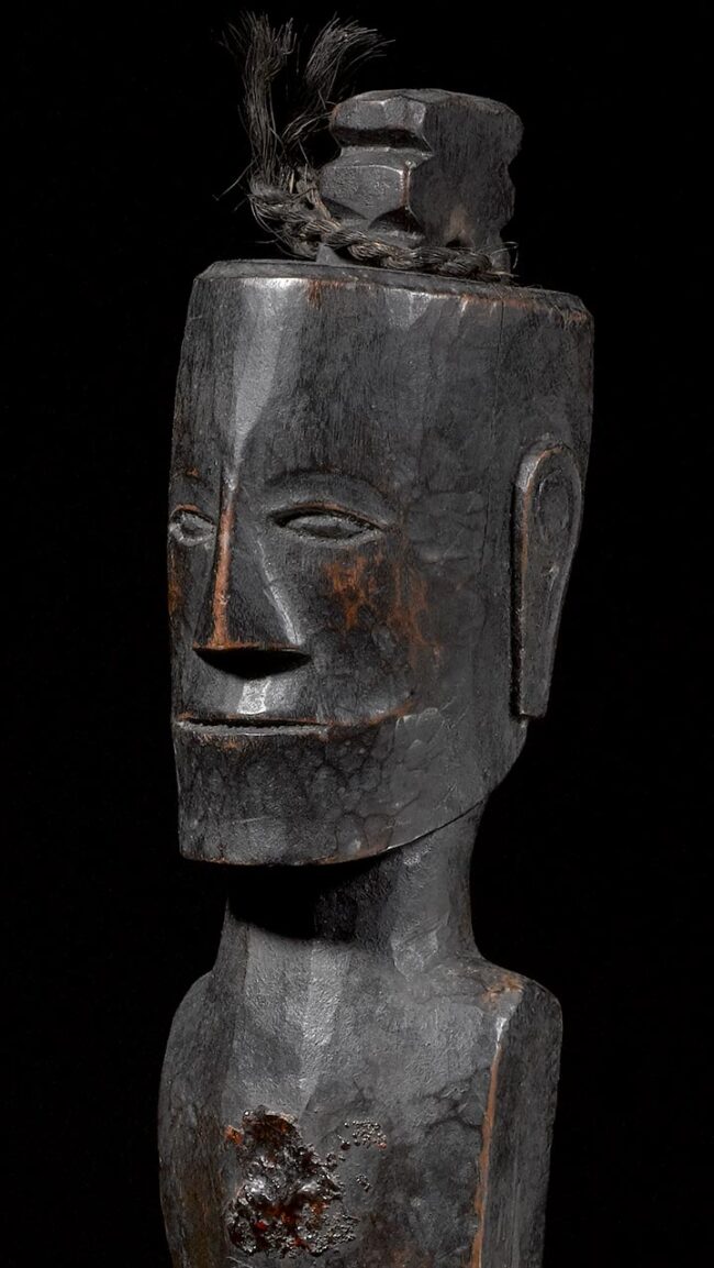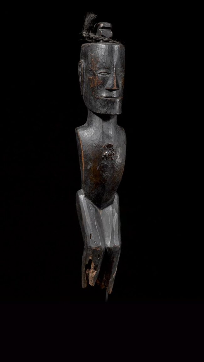 Pager figures defended against evil spirits. Instilled with apotropaic powers, these figures contained the souls of people who died. Honored with offerings and incarnations, these figures could be used to communicate with the ancestors. This example’s elongated face with stoic expression also has finely carved elongated ears. Its carefully modeled chest and legs are also typical of Batak sculptural traditions. The space for the “pukpuk” cavity, where powerful magical substances were kept, can be found on its chest. Horse hair has been attached to the top of the head. The figure’s dark and rich patina is stunning.