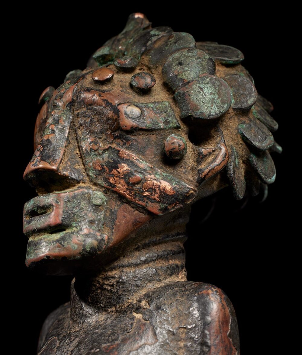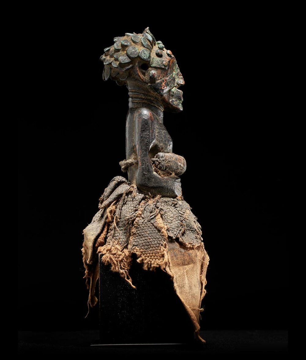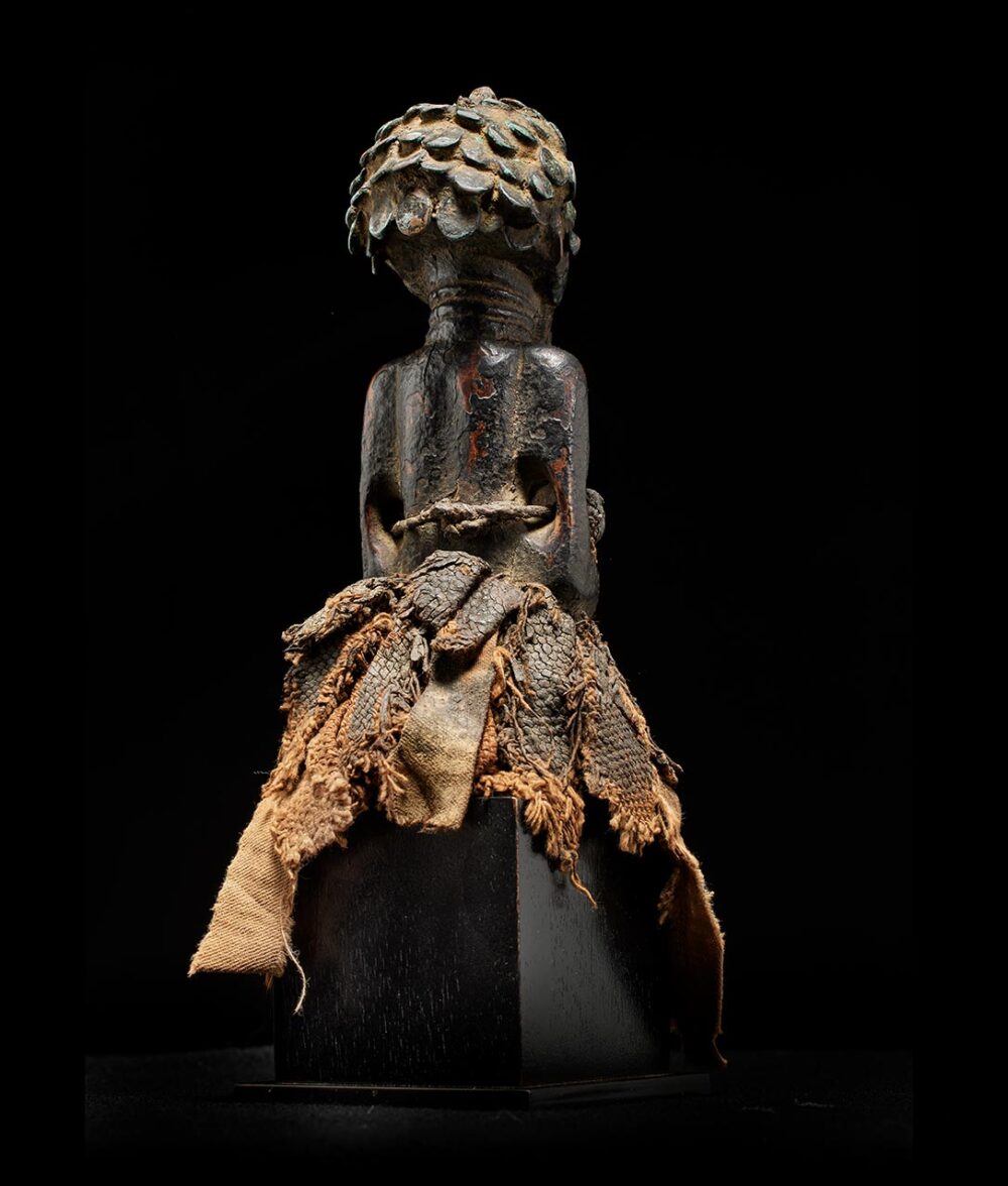 Yet, what truly captivates the observer is the figure’s coiffure and face, adorned with a meticulously arranged array of metal strips and tacks. The patina, dark and encrusted, serves as a poignant testament to the countless ritual libations that have sanctified this extraordinary piece over the passage of time.