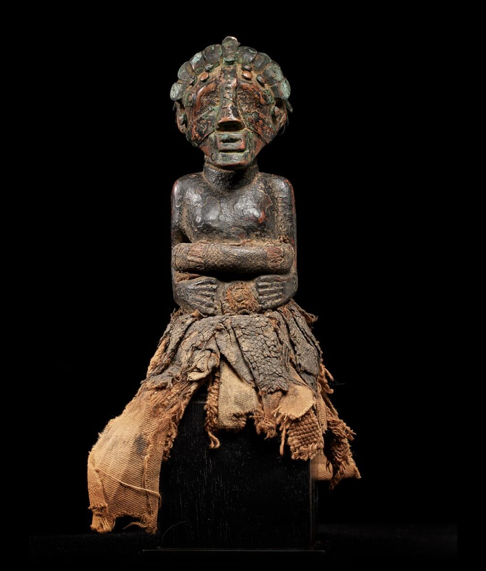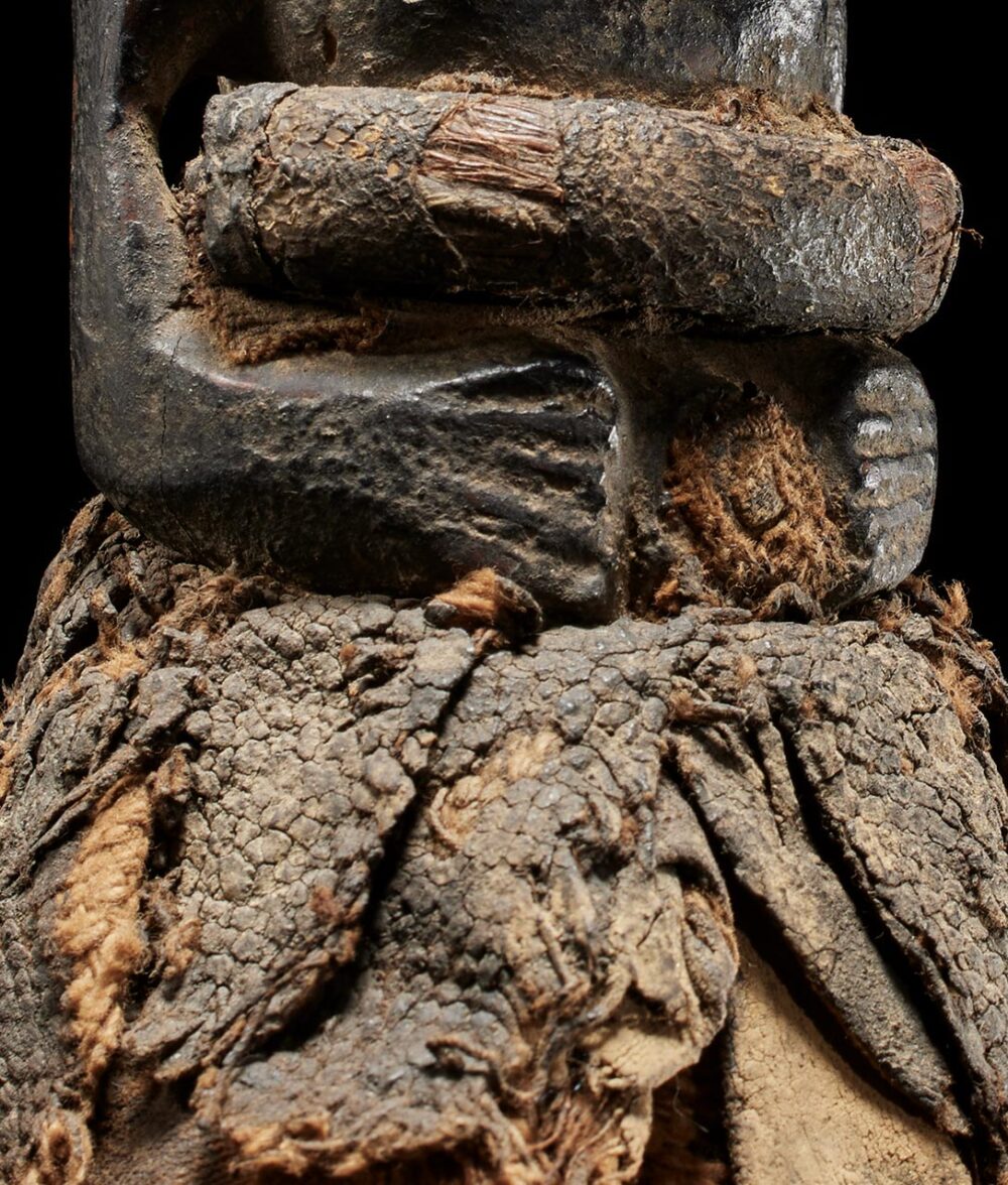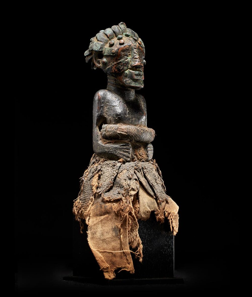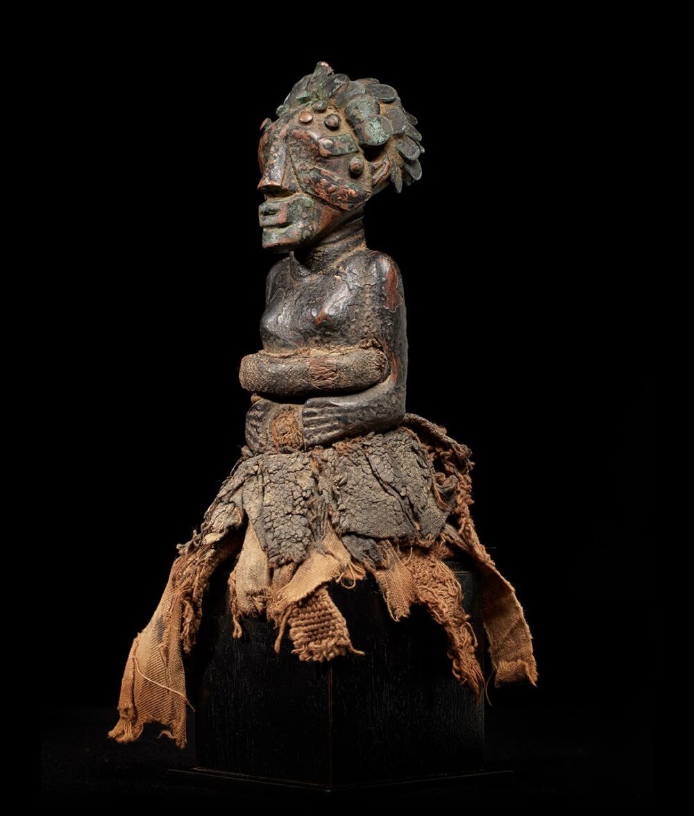 Yet, what truly captivates the observer is the figure’s coiffure and face, adorned with a meticulously arranged array of metal strips and tacks. The patina, dark and encrusted, serves as a poignant testament to the countless ritual libations that have sanctified this extraordinary piece over the passage of time.