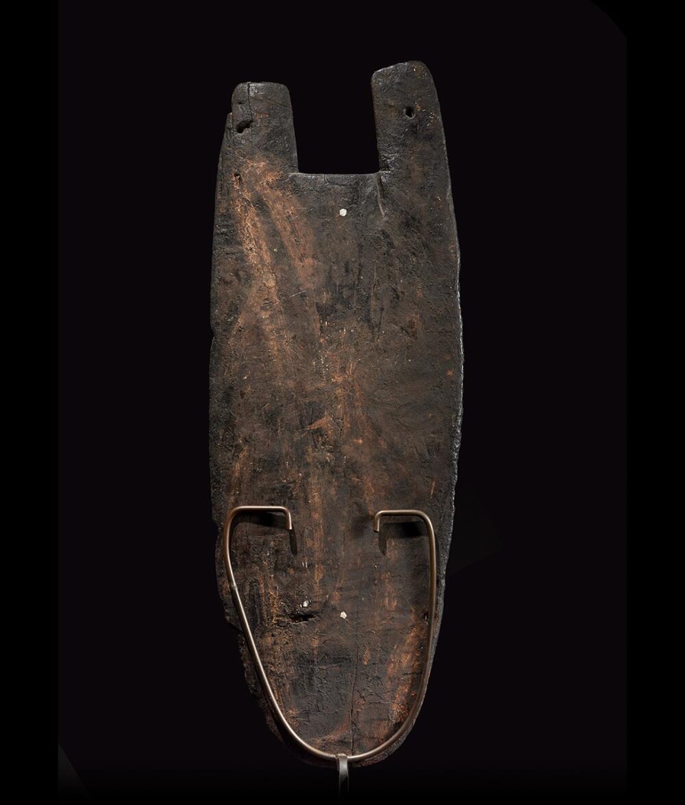 The shoulder shields from the Mendi region are notably more scarce compared to their larger oval counterparts. What sets this particular example apart is its exceptional age, dating back to pre-contact times, and the remarkably well-preserved traditional pigments adorning it. Take note of the substantial patina on the reverse side and the ancient, worn-out holes near the top, which once served as anchors for a rope handle. In the context of warfare, these shields weren’t just practical tools for protection; they also embodied the warrior’s power and prestige through vibrant colors and striking designs.