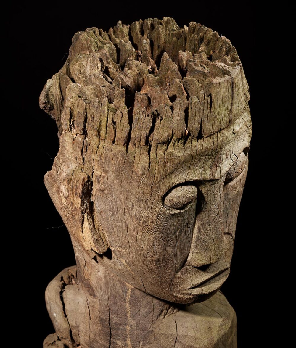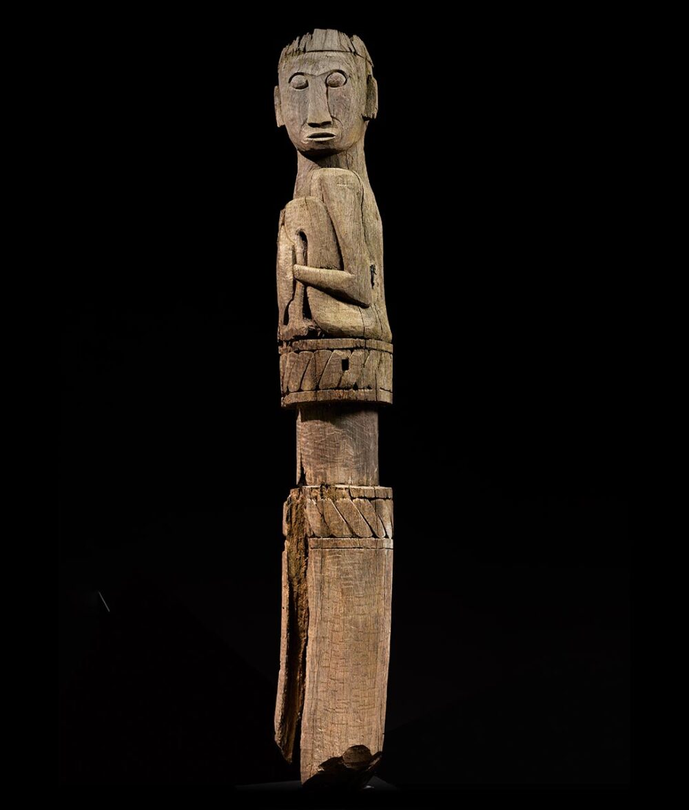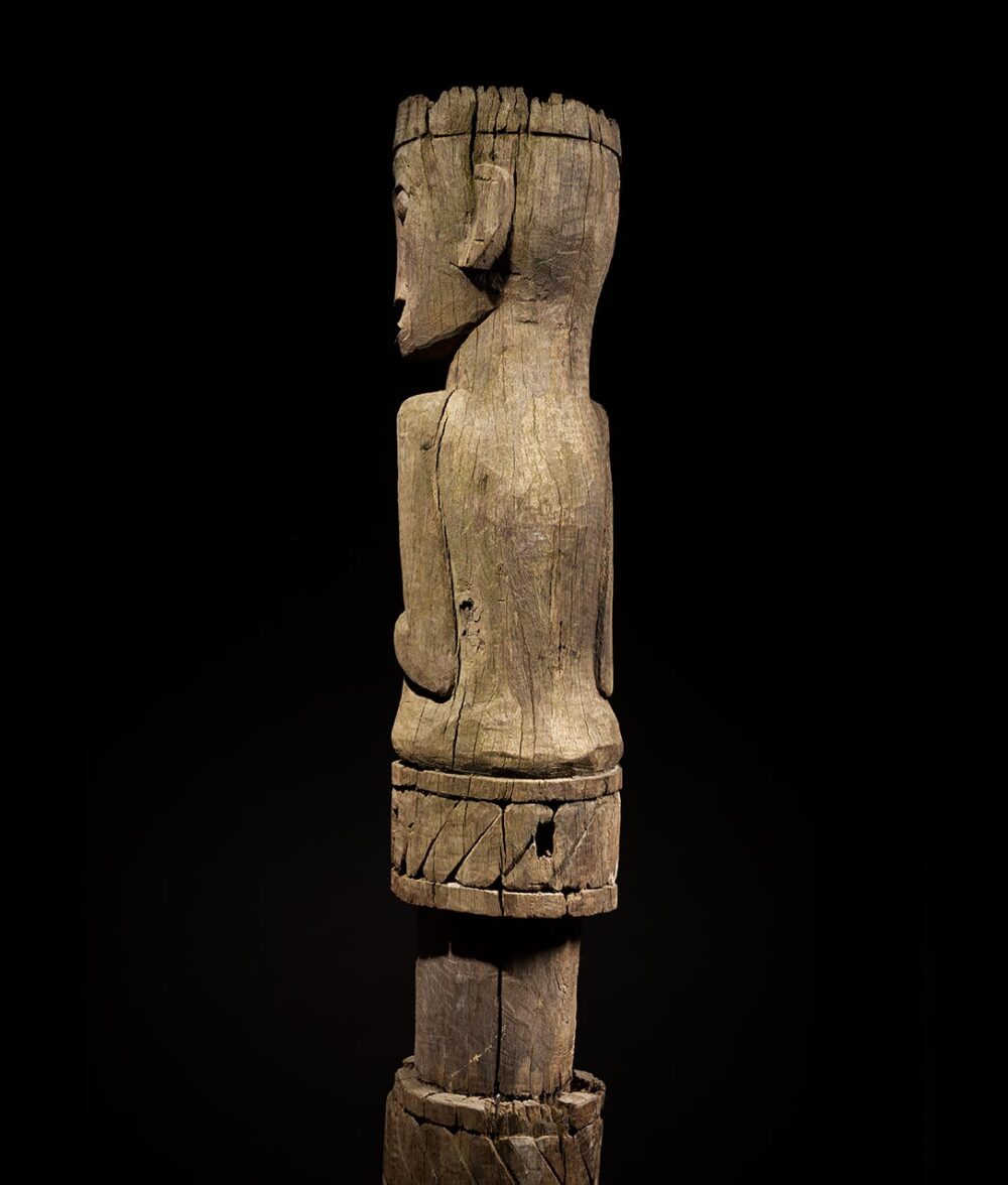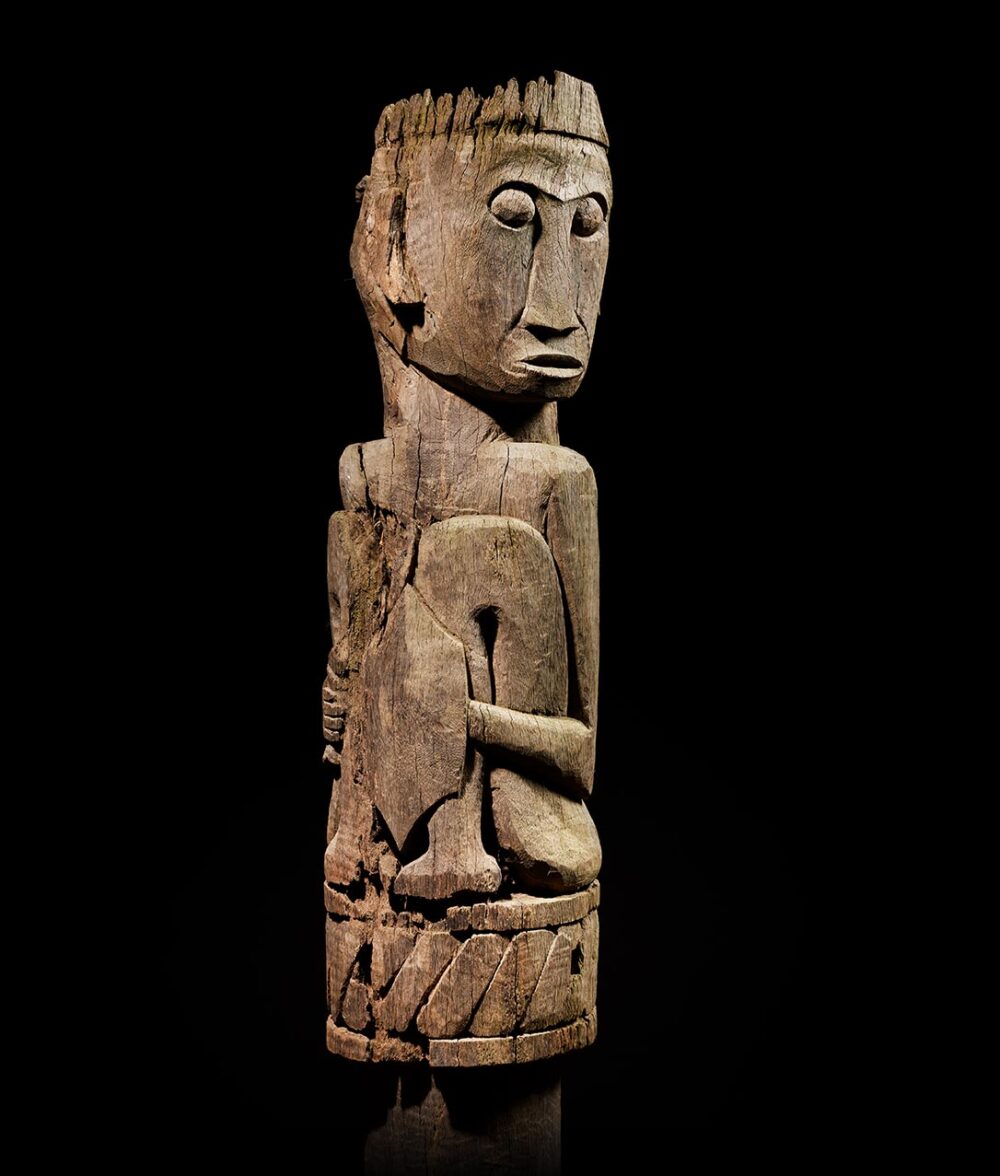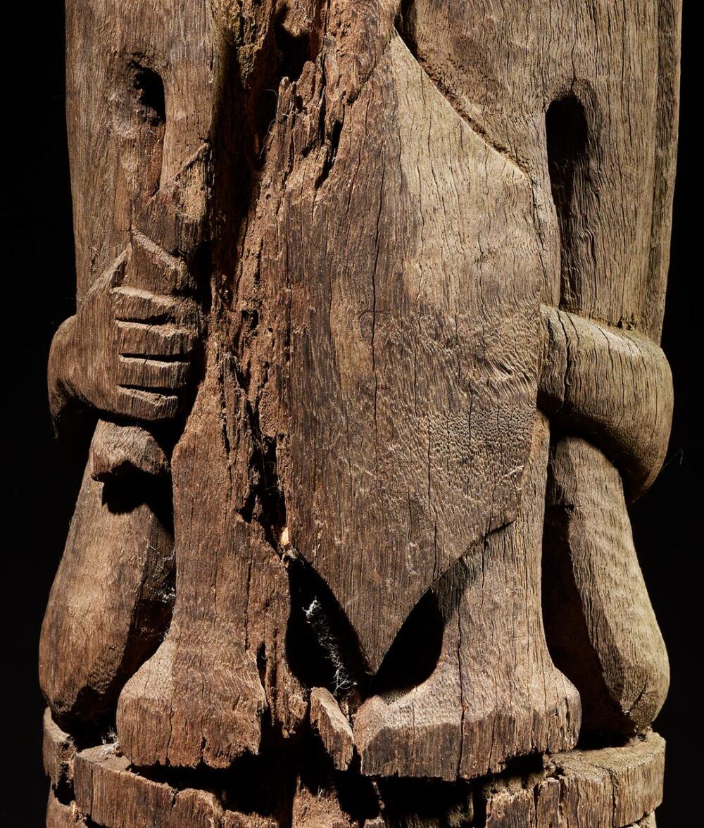 The figure holds a shield in one hand and a knife in the other, symbolizing its role as a guardian and protector. It is believed to shield the community from potential threats, including hostile neighboring tribes and malevolent forces such as evil spirits, diseases, and other supernatural dangers. The presence of both shield and weapon signifies the figure’s unwavering readiness to defend the community against these perilous challenges.