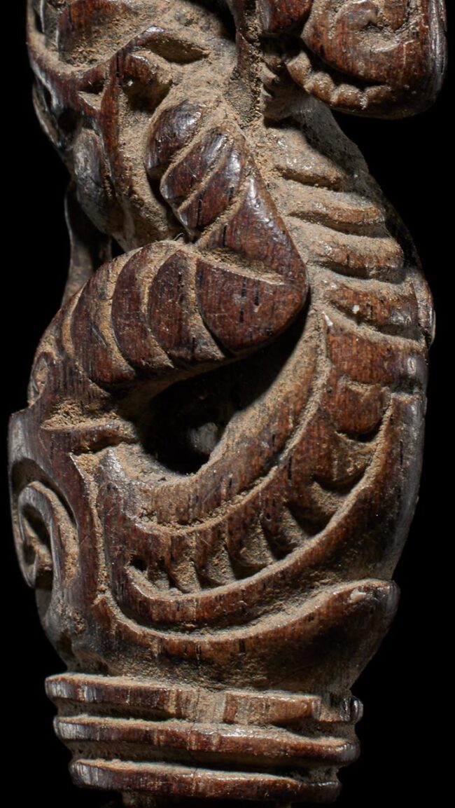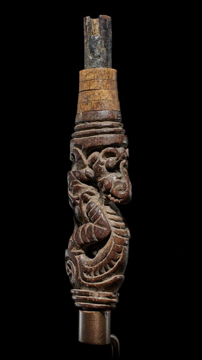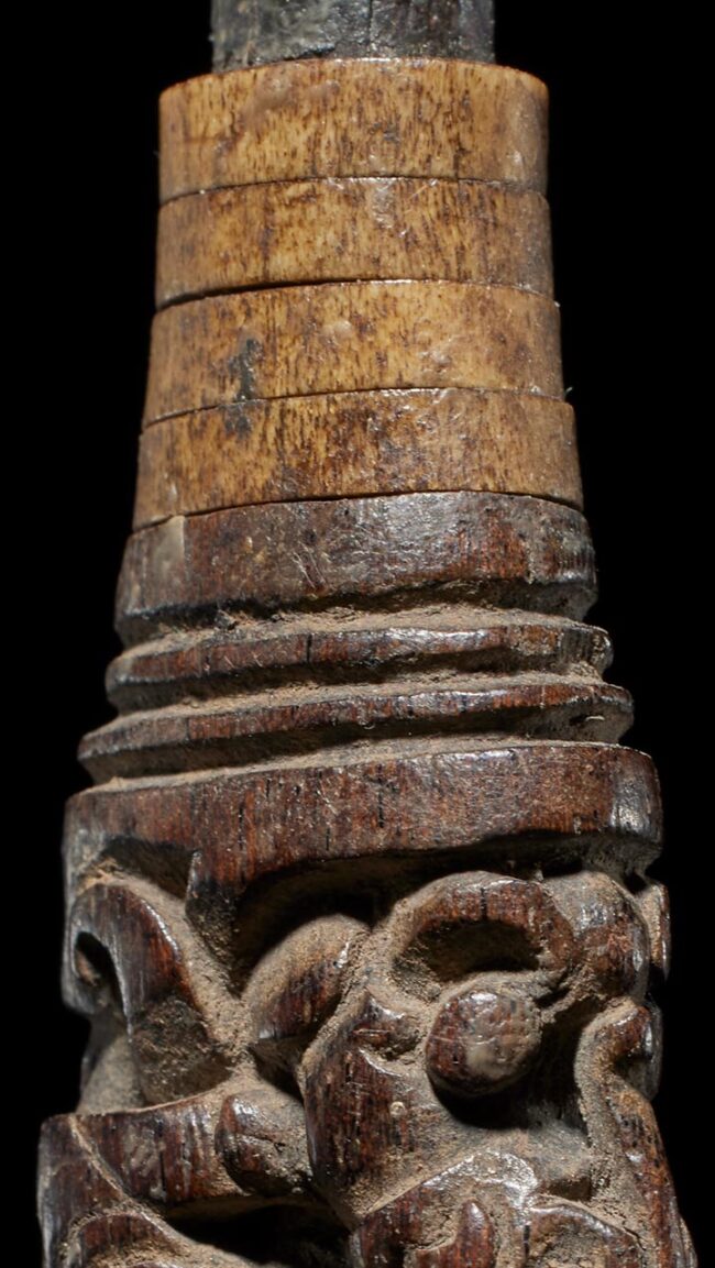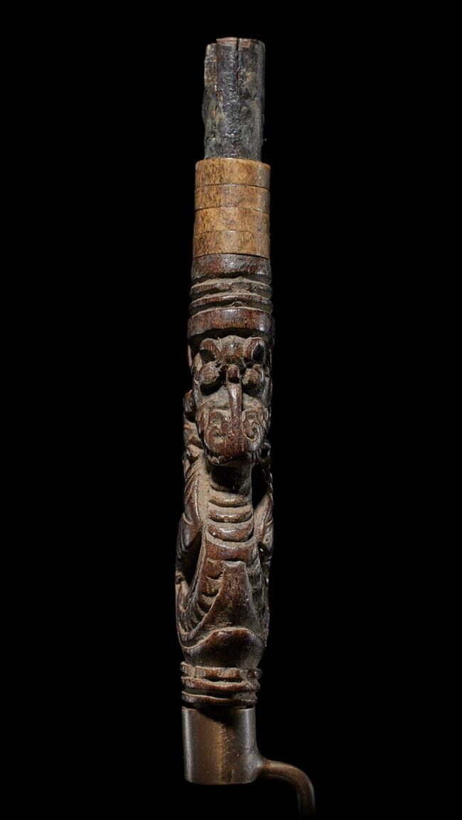 Crafted in the likeness of an Aso, a significant protective mythological being in Dayak culture, this wooden example exhibits a graceful, serpentine form. The creature’s head gracefully tilts away from its body, infusing it with a captivating sense of fluidity and dynamism. Adorning its upper section are carefully placed rings made from deer antler and buffalo horn, adding a tasteful and complementary touch to this impeccably crafted artifact.